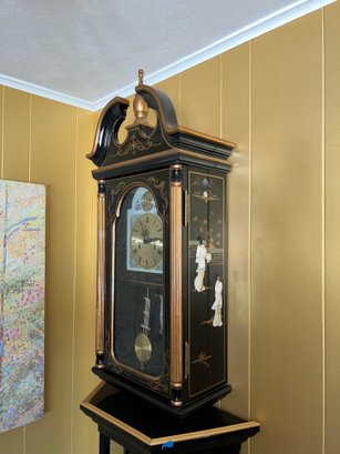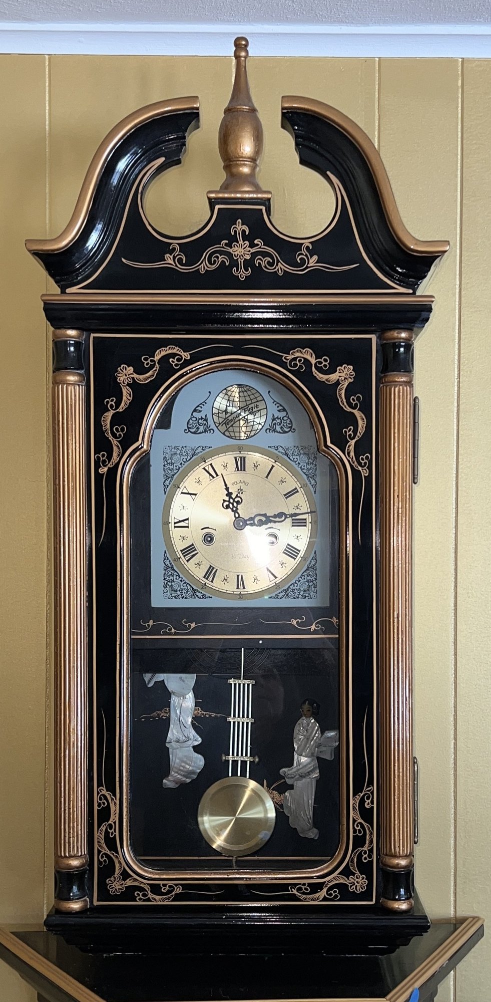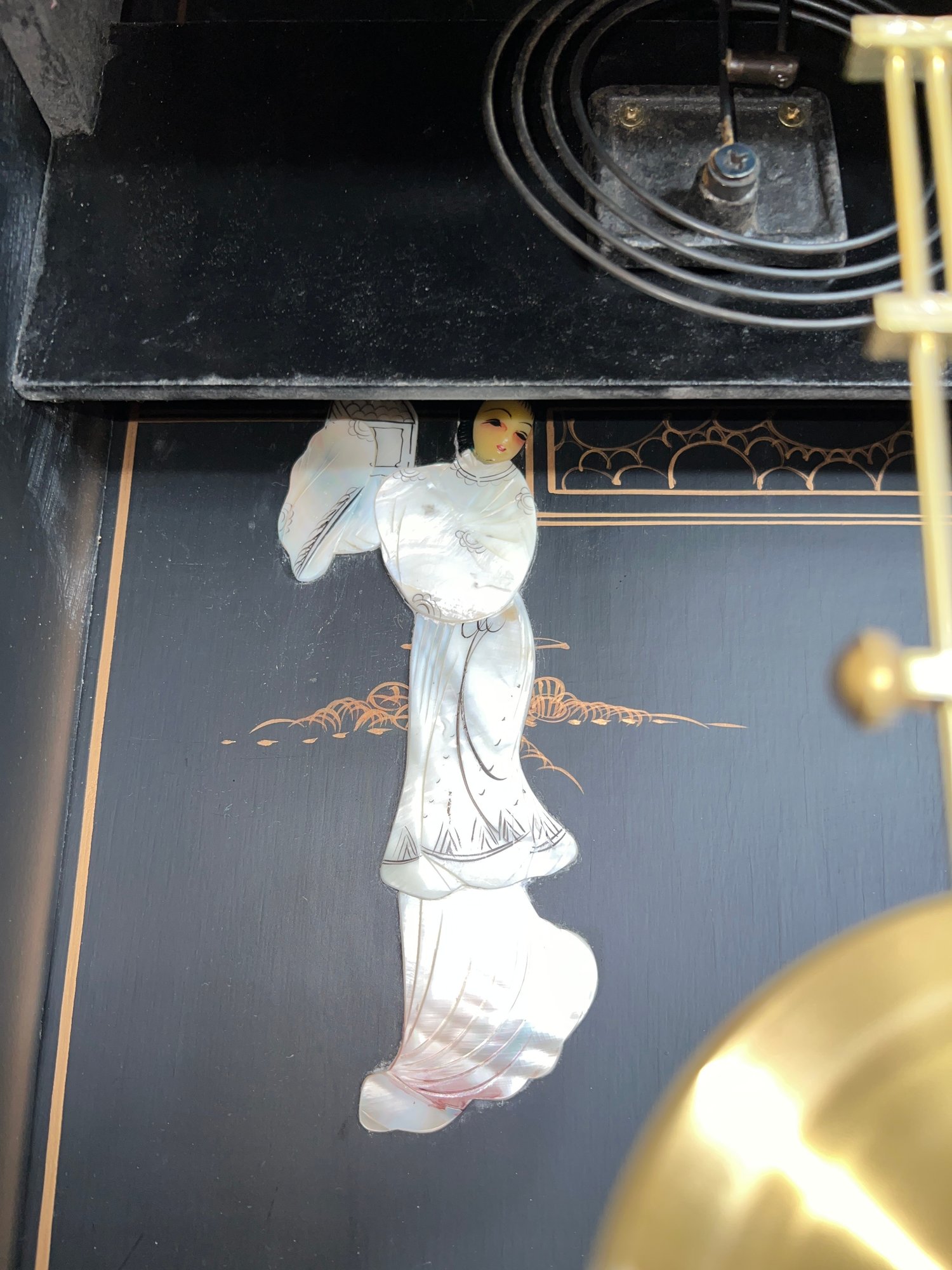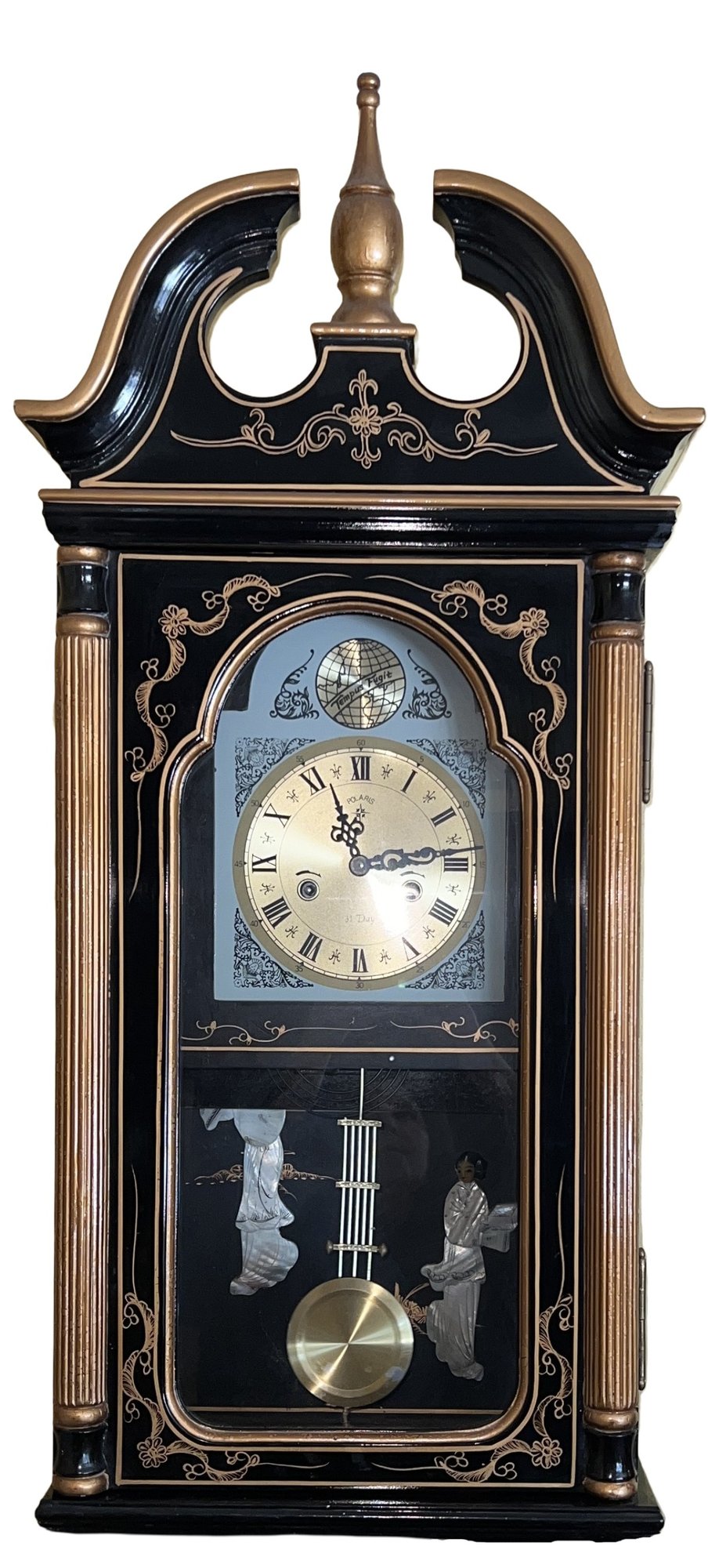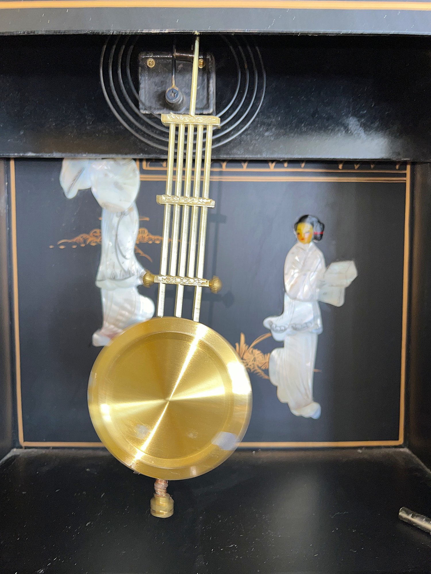 Working Tempus Fugit Polaris chinoiserie-style lacquer wall clock. Hand-painted features and mother-of-pearl figures. Comes with key and pendulum. Working when tested.