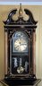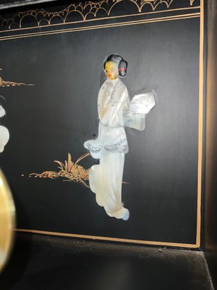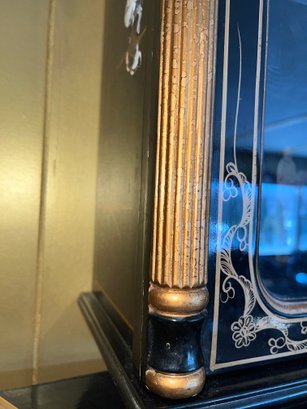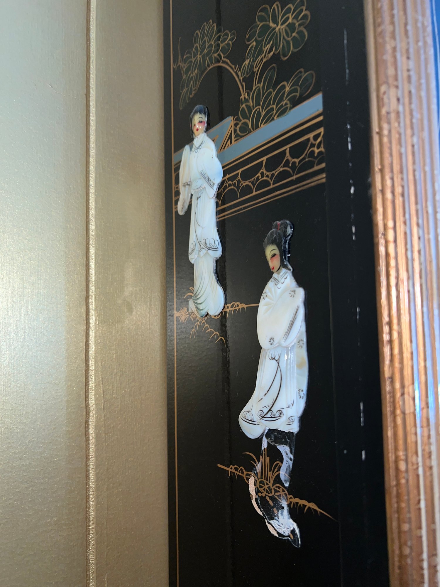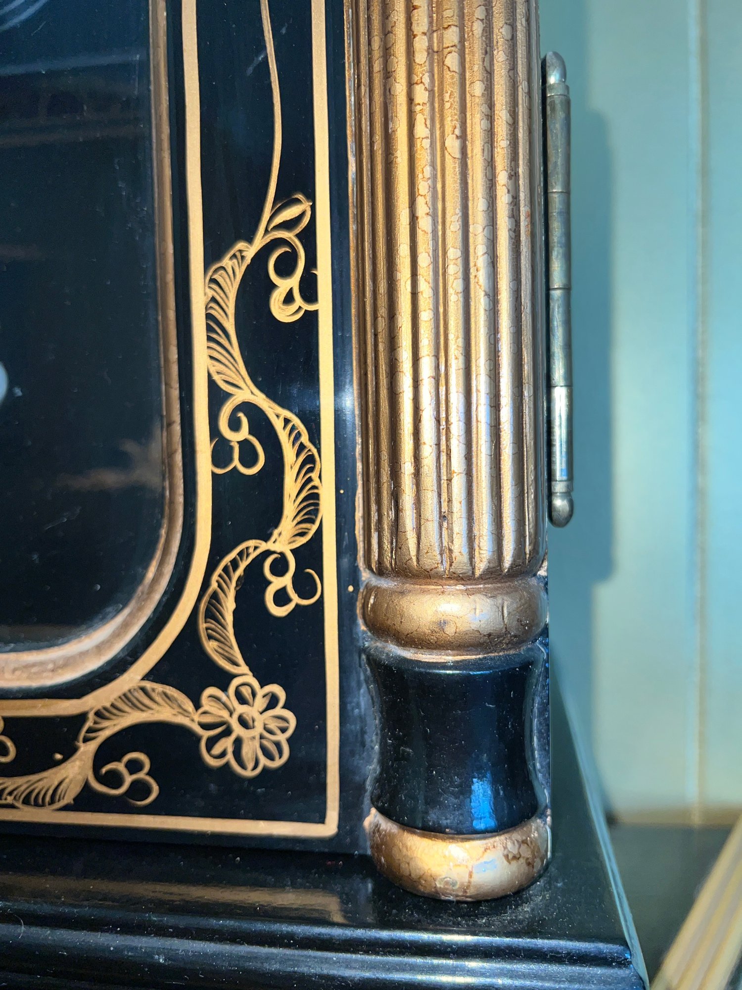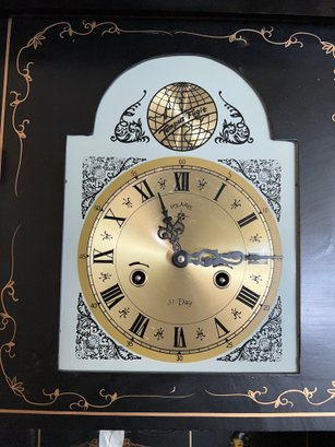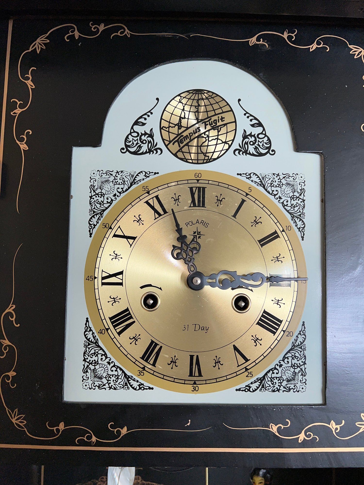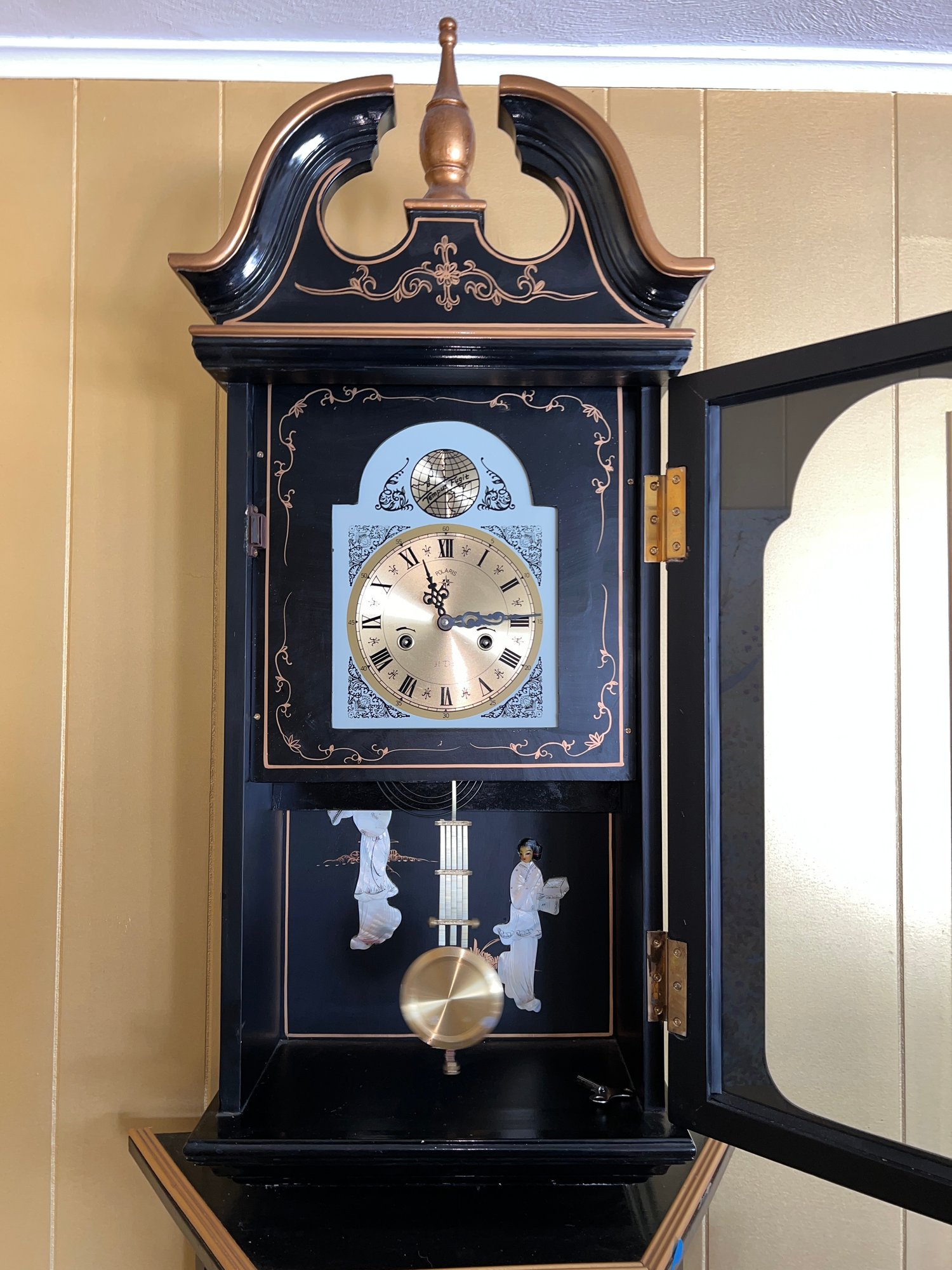 Working Tempus Fugit Polaris chinoiserie-style lacquer wall clock. Hand-painted features and mother-of-pearl figures. Comes with key and pendulum. Working when tested.