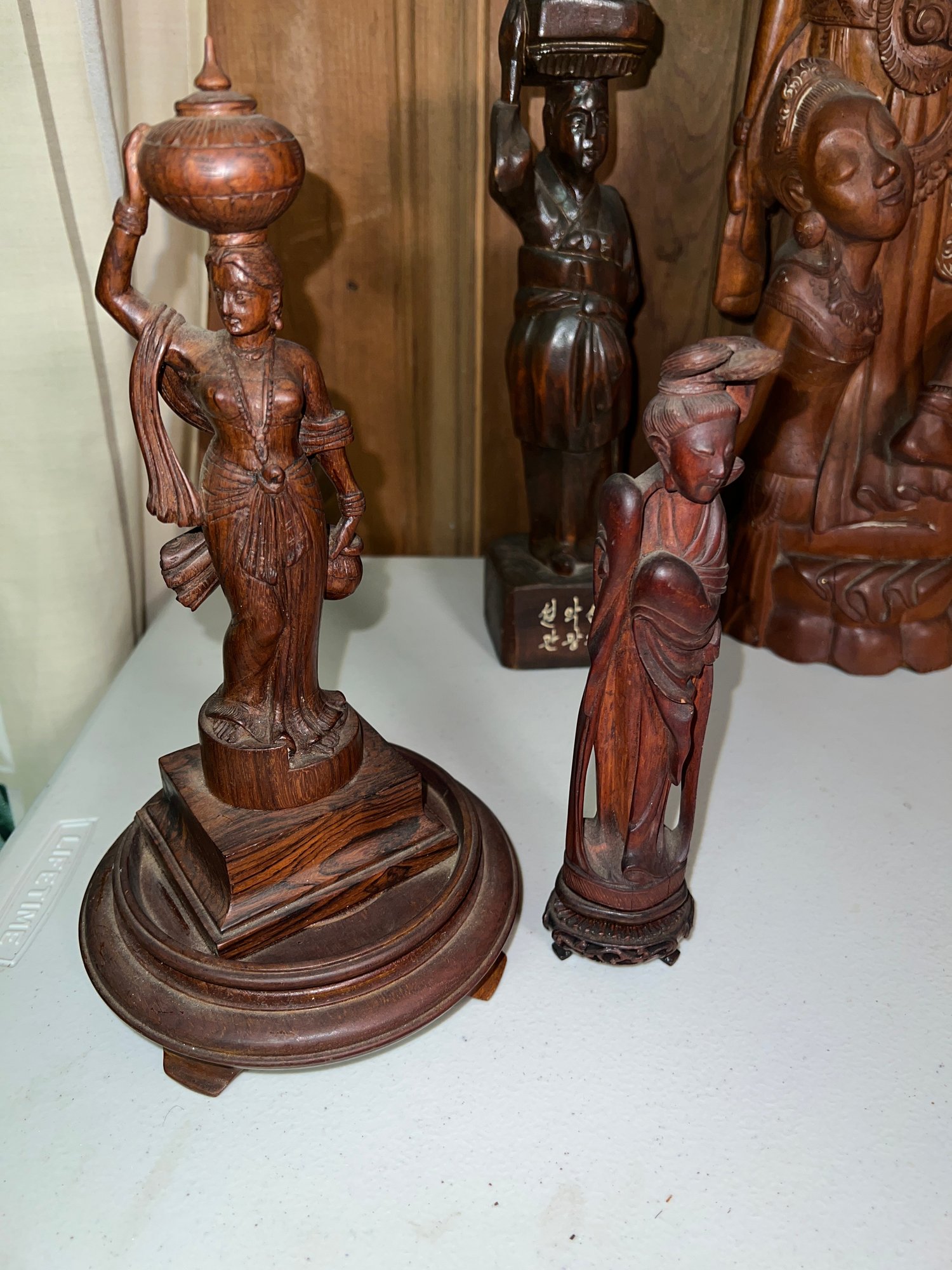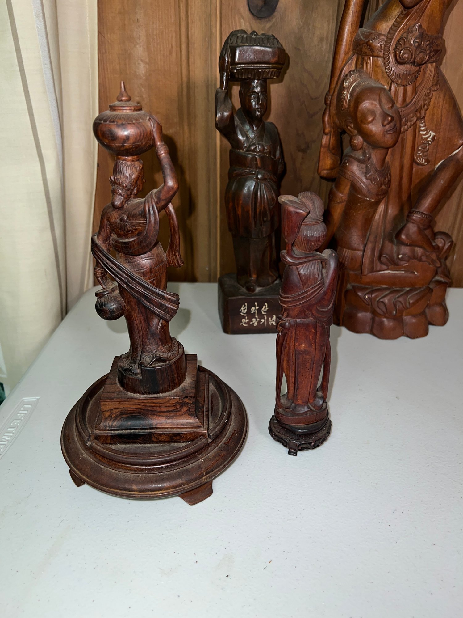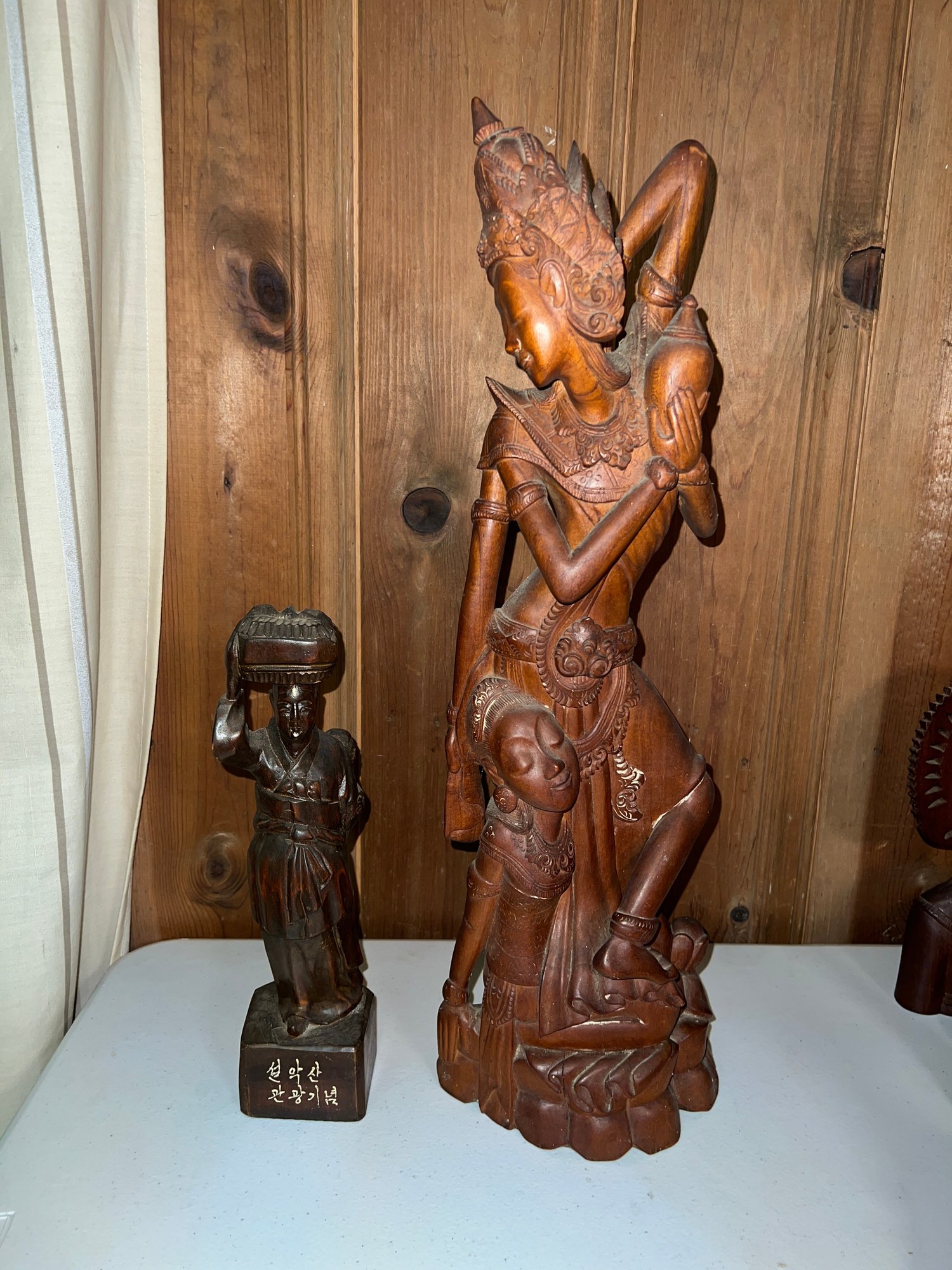 One figure includes Korean text on its base, indicating it may have been a souvenir from Seoraksan National Park in South Korea. seol-agsan gwangwang-ginyeom