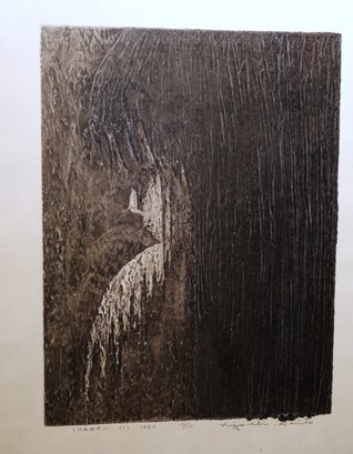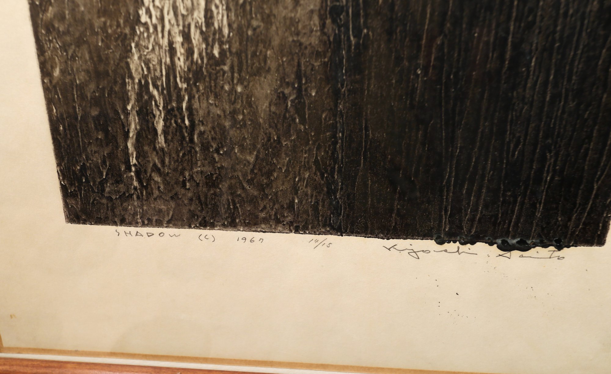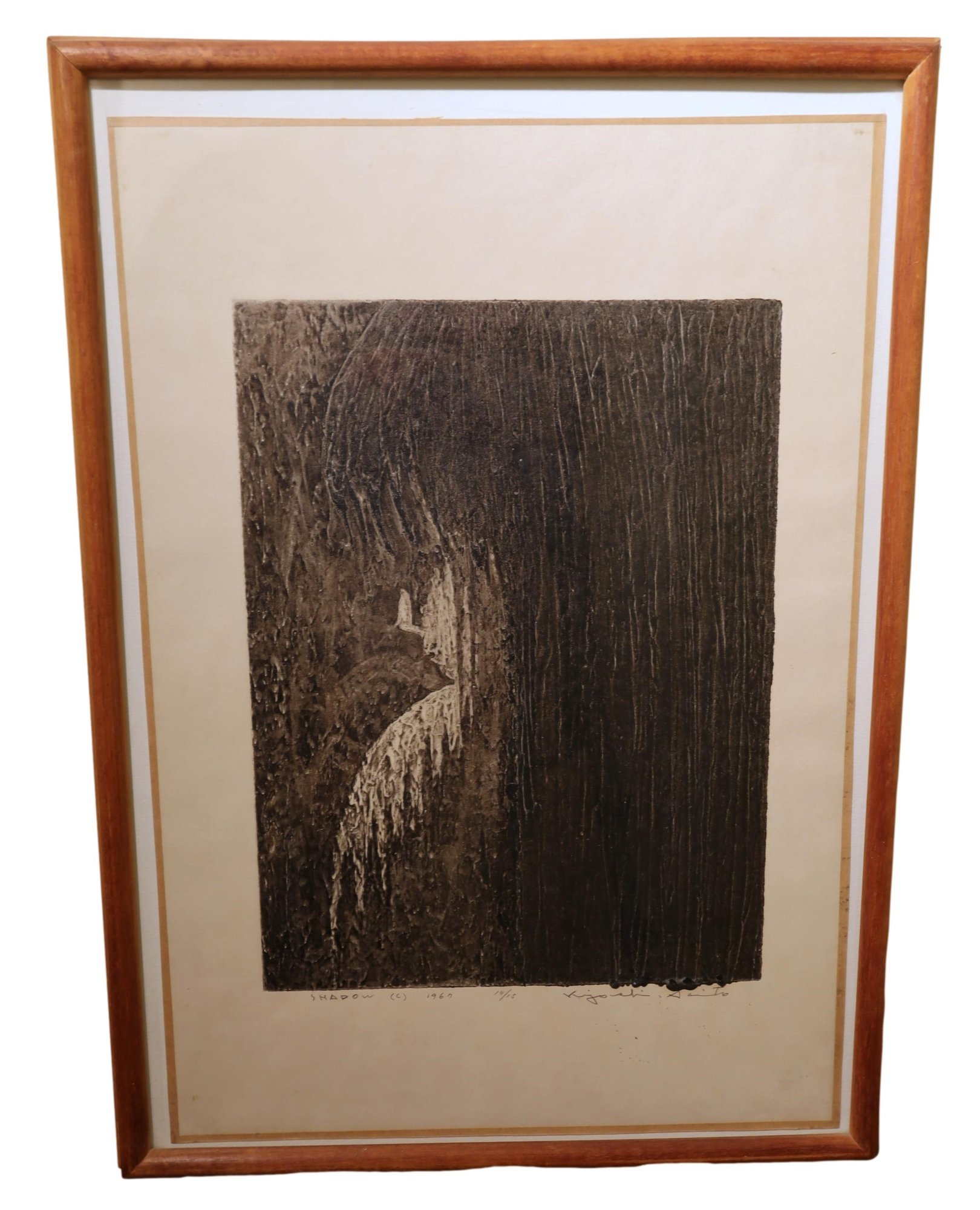A mysterious piece of art by Kiyoshi Saito -B.1907-1997 was a sosaku-hangain in the 20th century Japan. This woodblock is dated 1967 and signed lower right, edition 10/15. "Shadow".