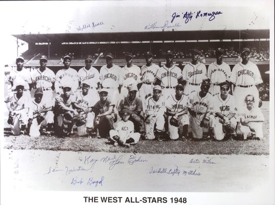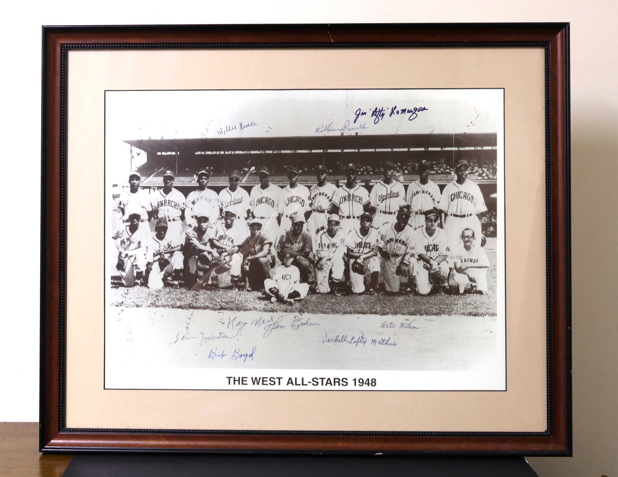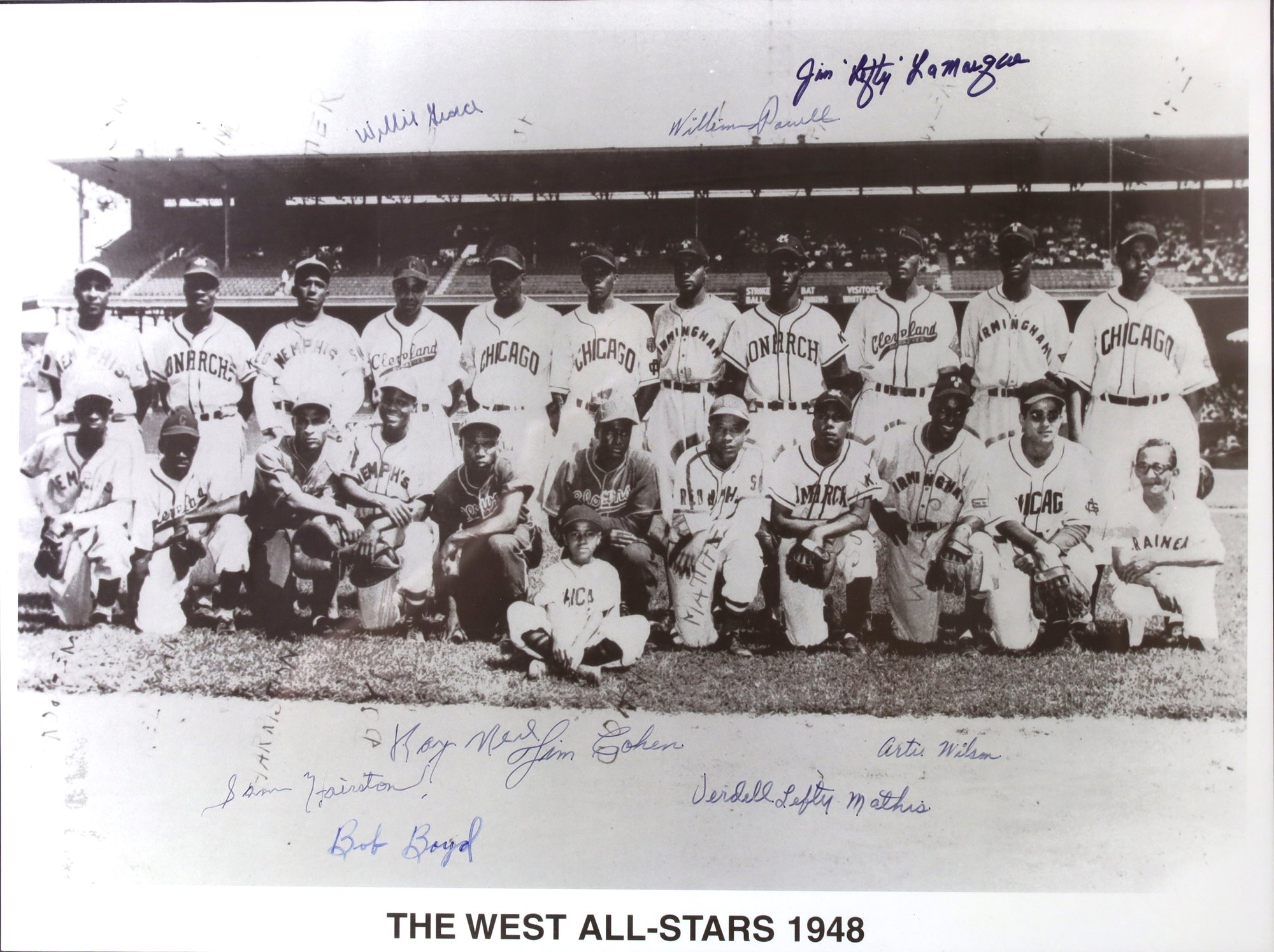 Black and white print of the west all-stars 1948 Artie Wilson, Verdell Lefty Mathis, Bob Boyd, Jim Cohen, Sam Hairston, Ray Neil, Jim LaMarque, William Powell , Willie G.,
