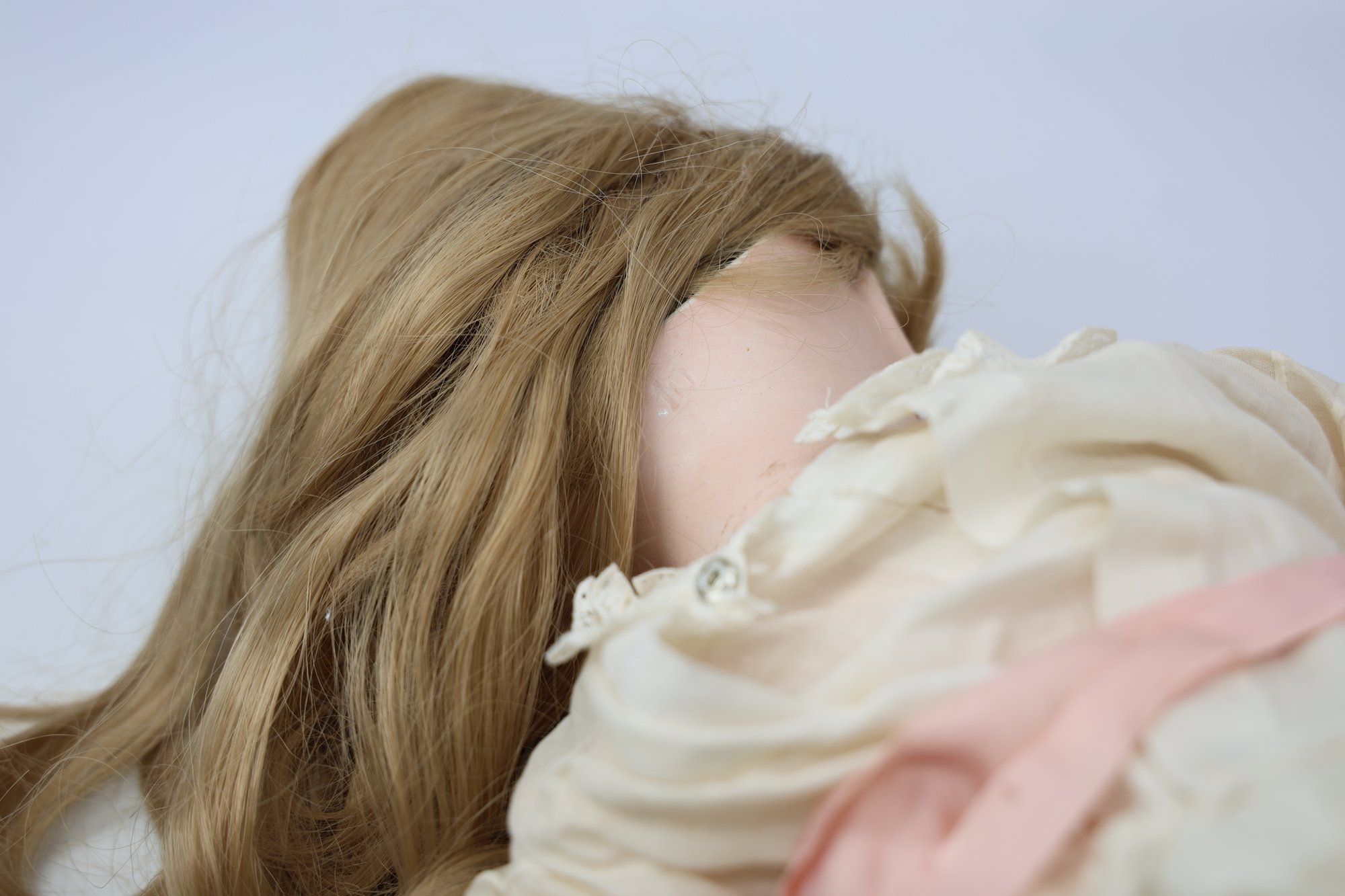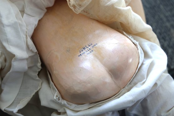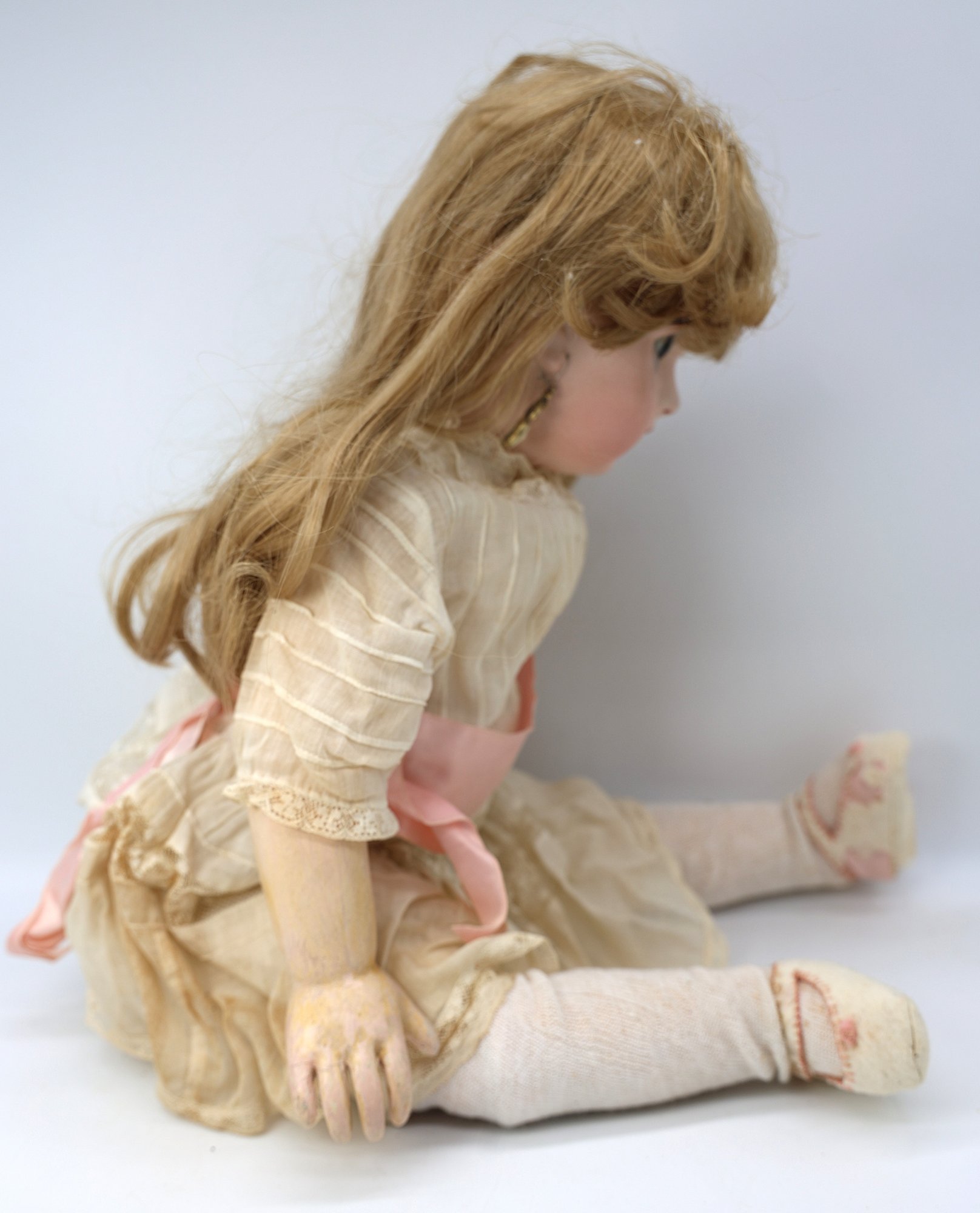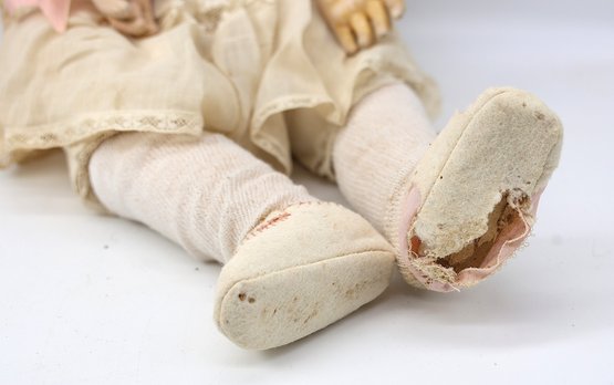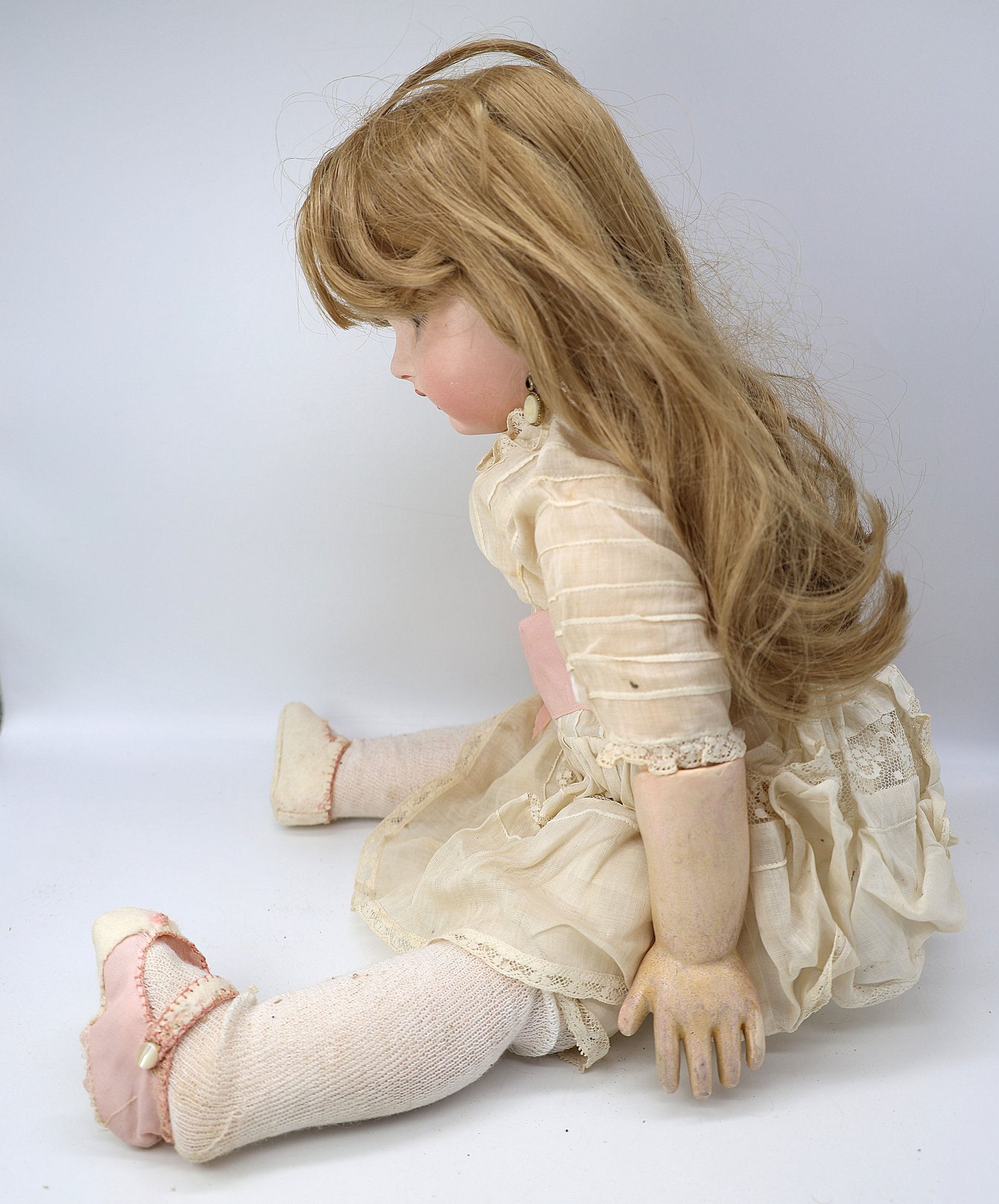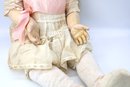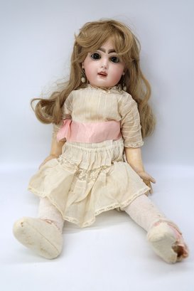 Marked on body in blue. 22"L bisque head with brown eyes open and closed marked 10.- Hand painted eyebrows, eyelashes and lips. Earrings with jointed body .
