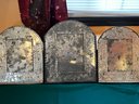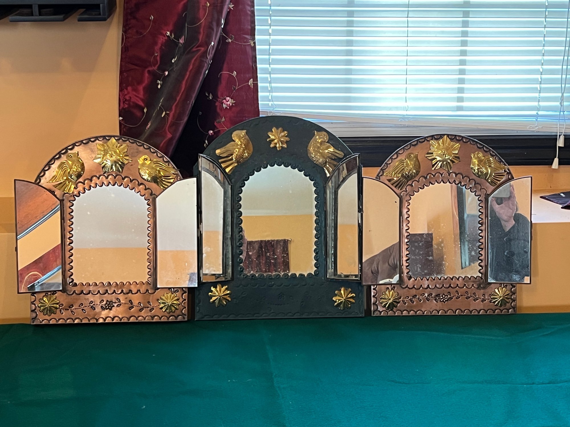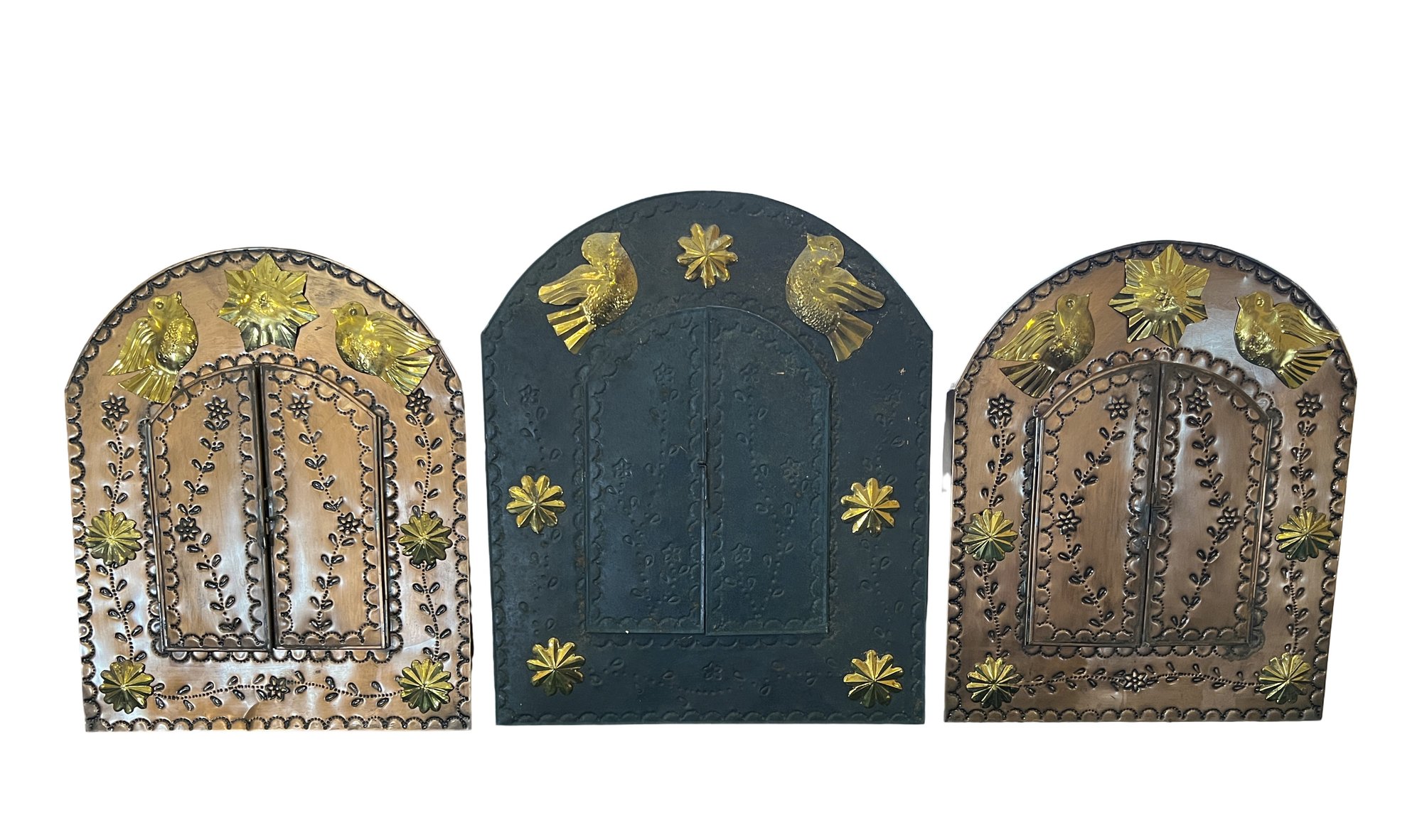 Three Mexican tin arching wall mirrors embossed with birds
