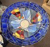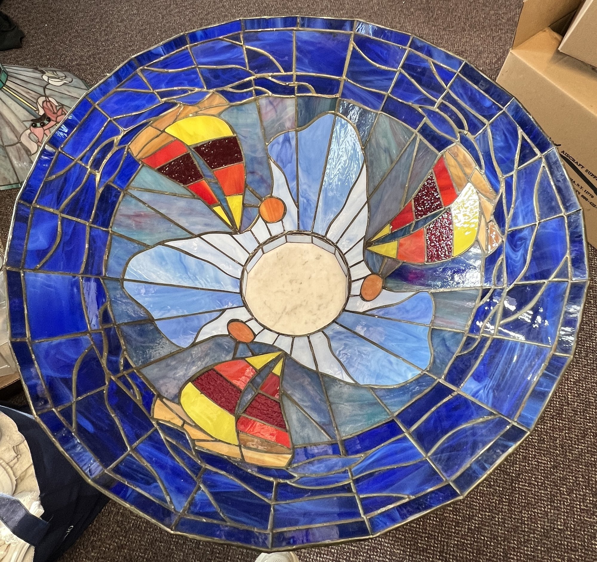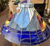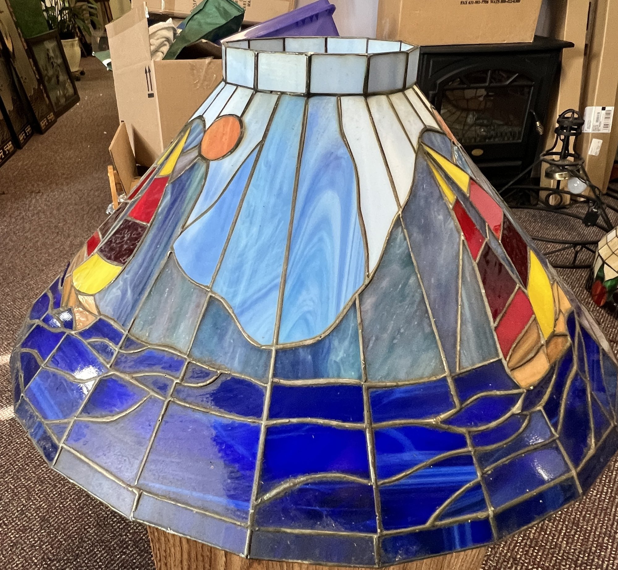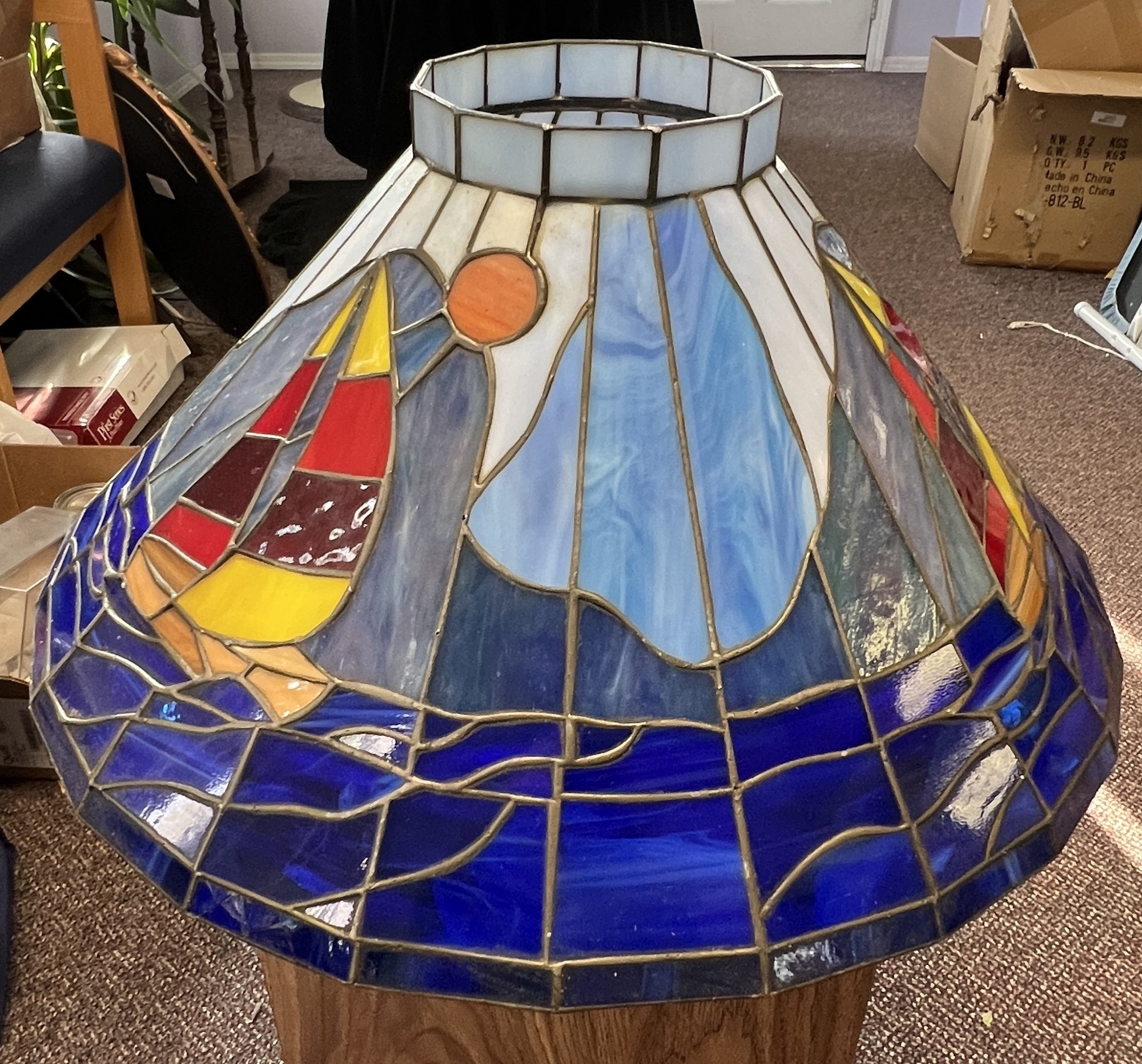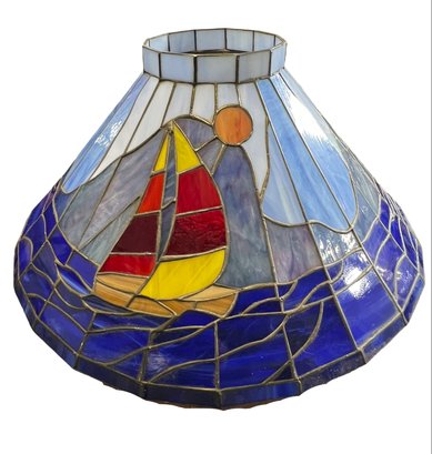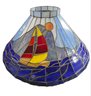 Tiffany stained and slag-lead glass lampshade depicting sailboats with red, white, and black sails set against a hilly coast and a round sun in the sky.