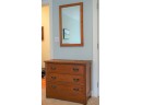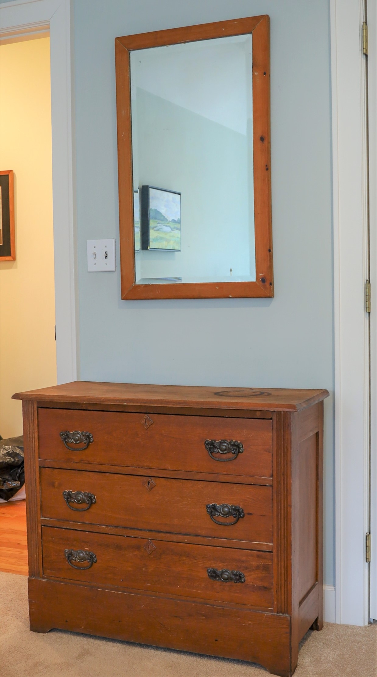 Turn of the century 3 drawer cabinet has a matching beveled mirror to hang above. Top of cabinet needs to be refinished or could even have a marble top put on it.