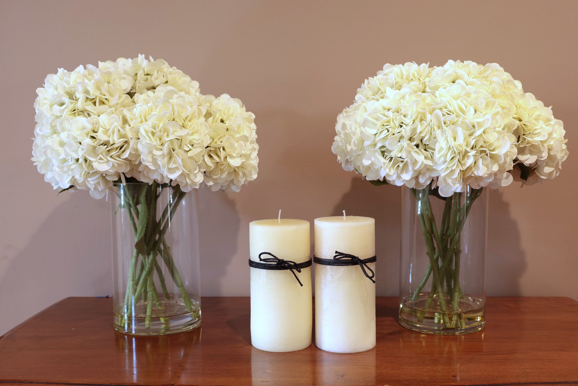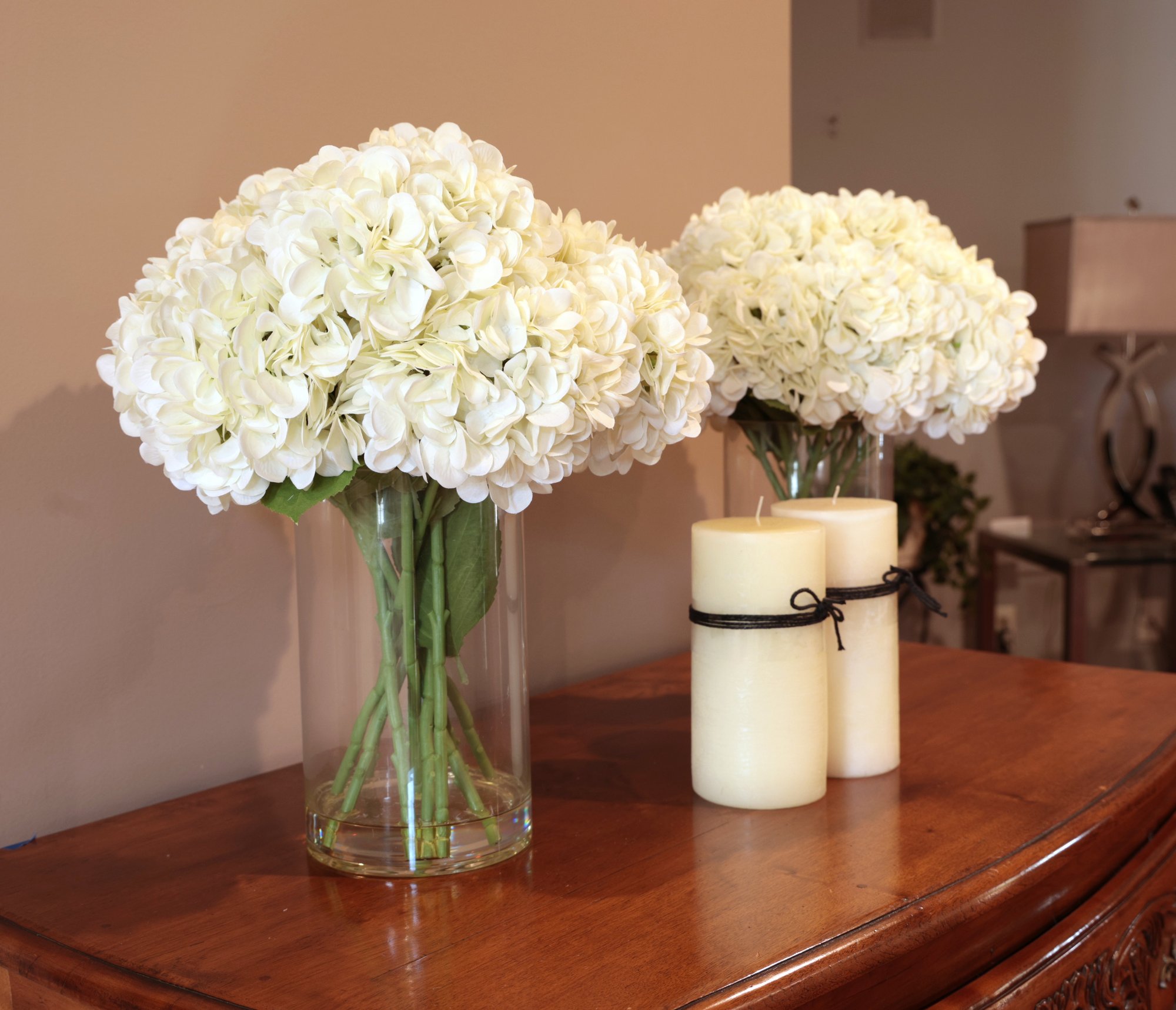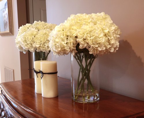 Two Hydrangea In Glass Vase (in simulated water) And 2 Decorative Candles