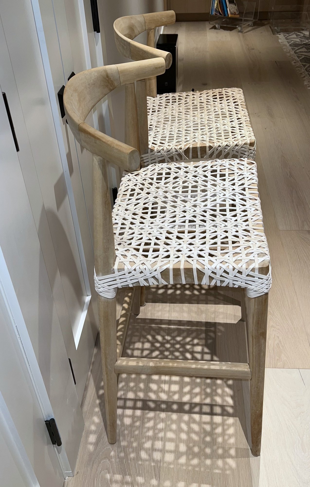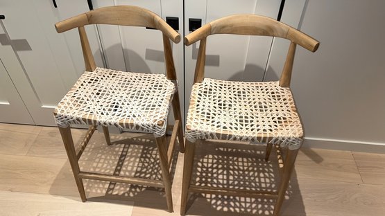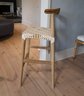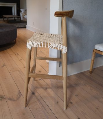 bandelier counter/bar stool natural contemporary design. Clean lines, subtle curves and nice details. Woven white leather seat in a geometric lattice with natural teak frame.