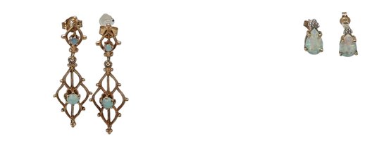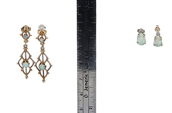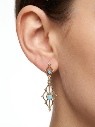 Pair of Victorian-style 14k yellow gold dangle earrings with opal gemstones. - 1.25"L