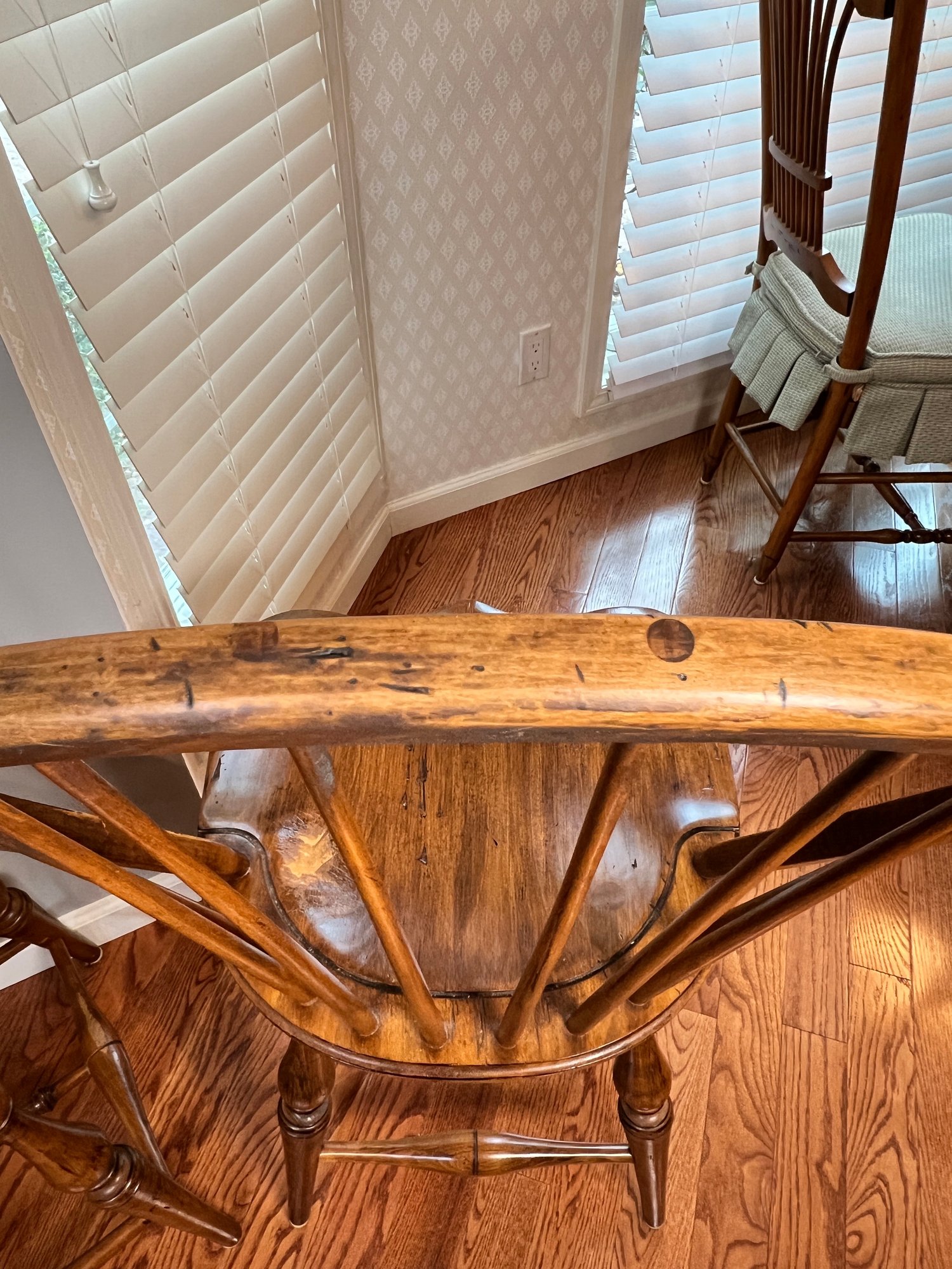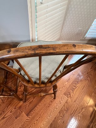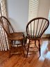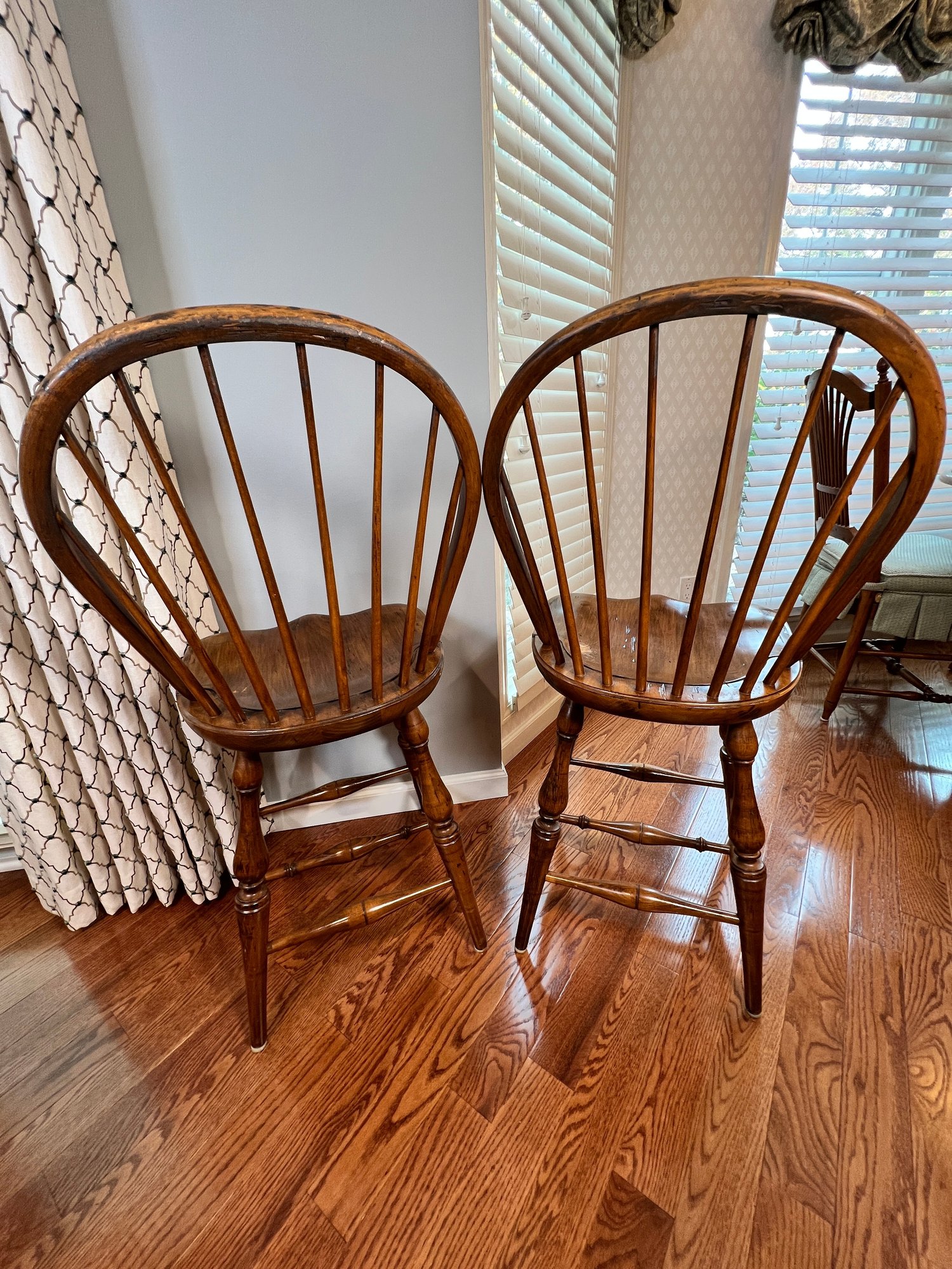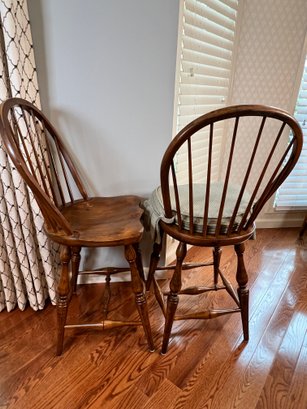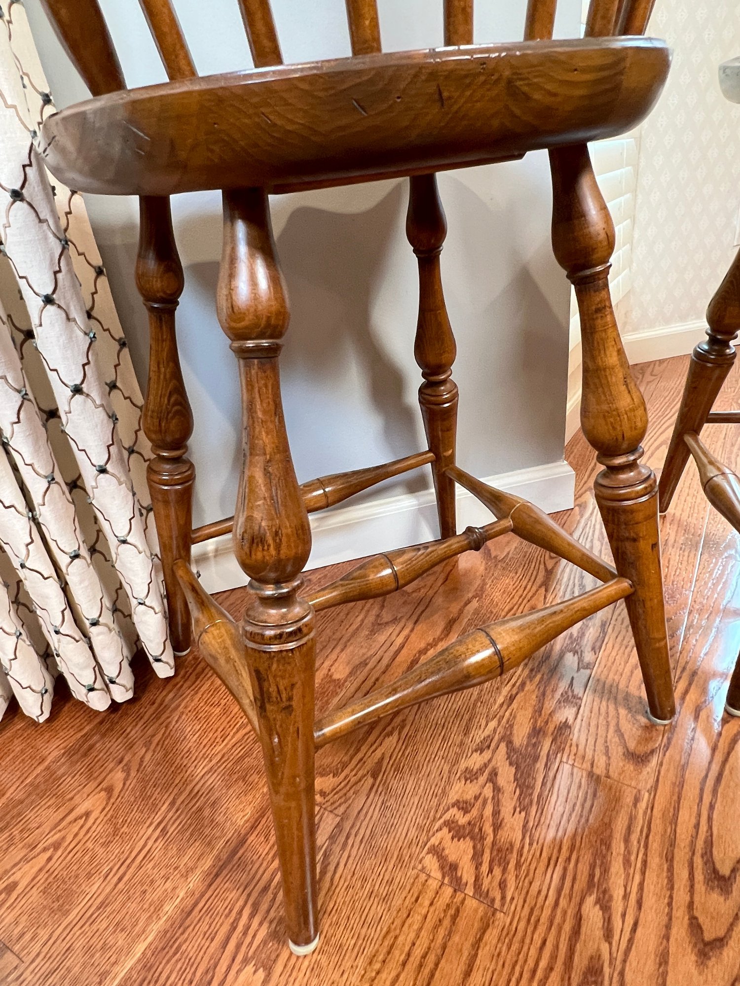 Two wood Windsor back bar stools with or without cushions. Both chairs have minor blemishes on the seats; otherwise, they are very sturdy! (see Photos)
