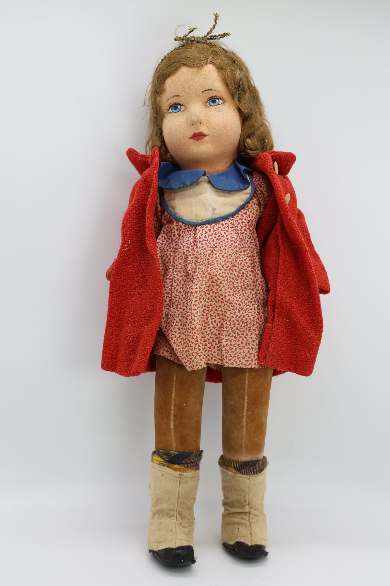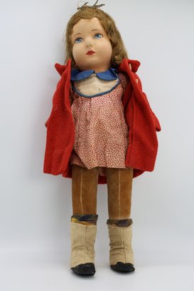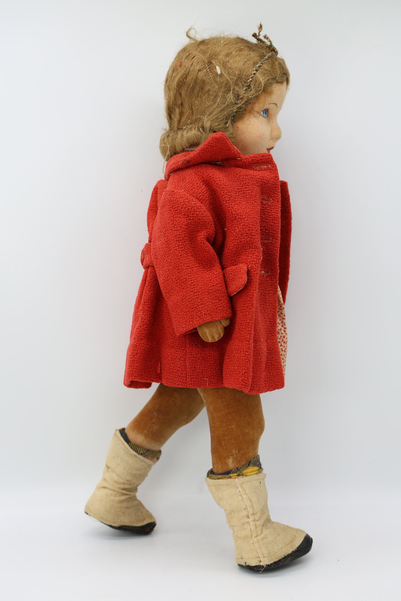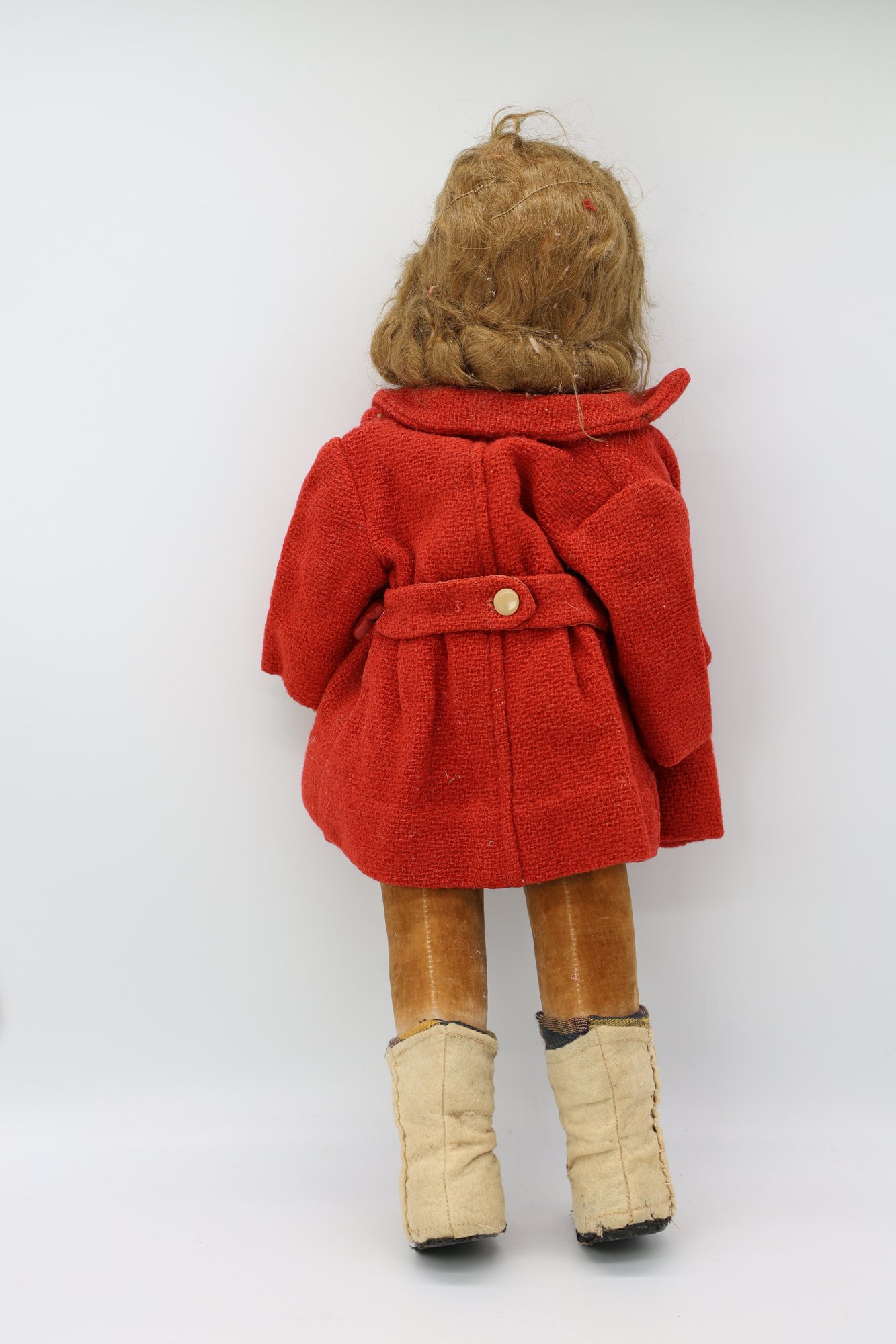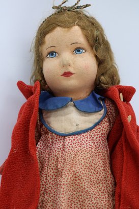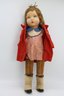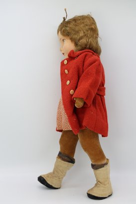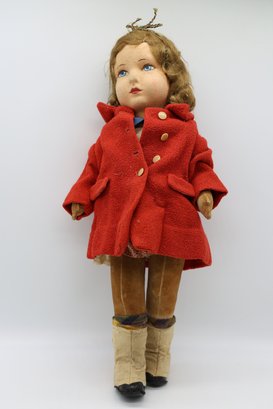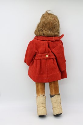 Molded and painted facial features with mohair wig and jointed arms and legs.