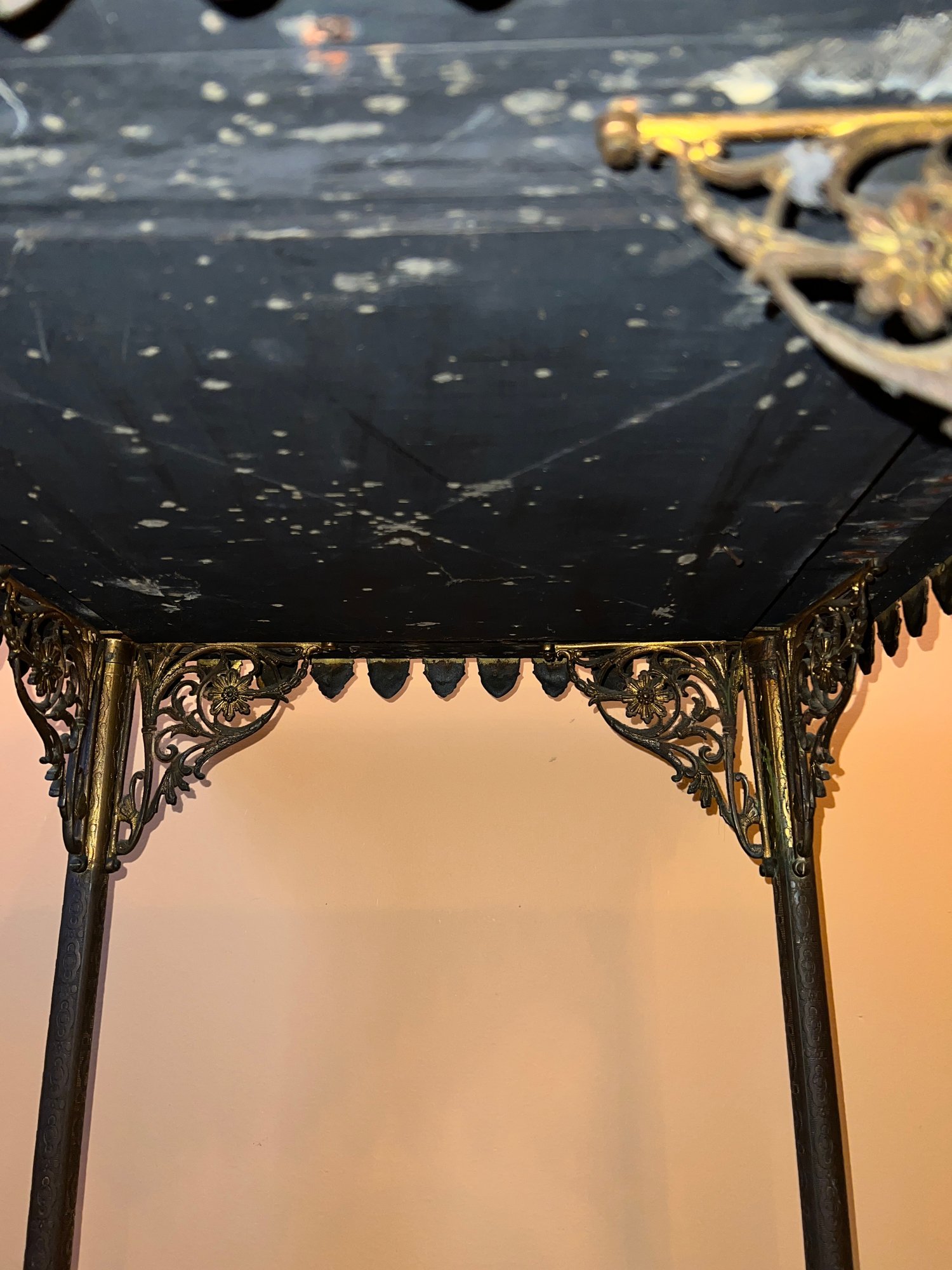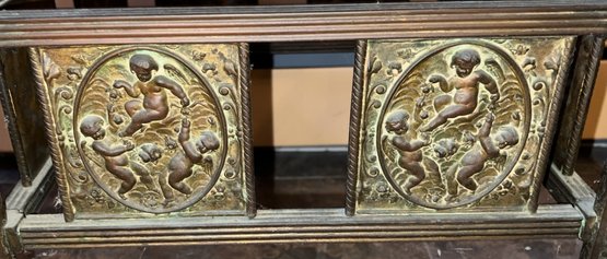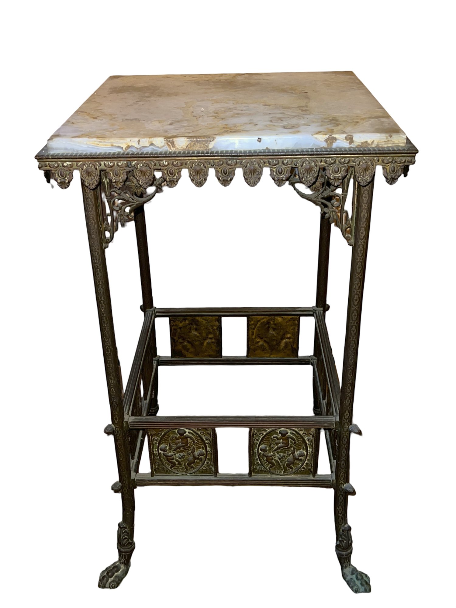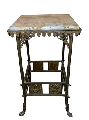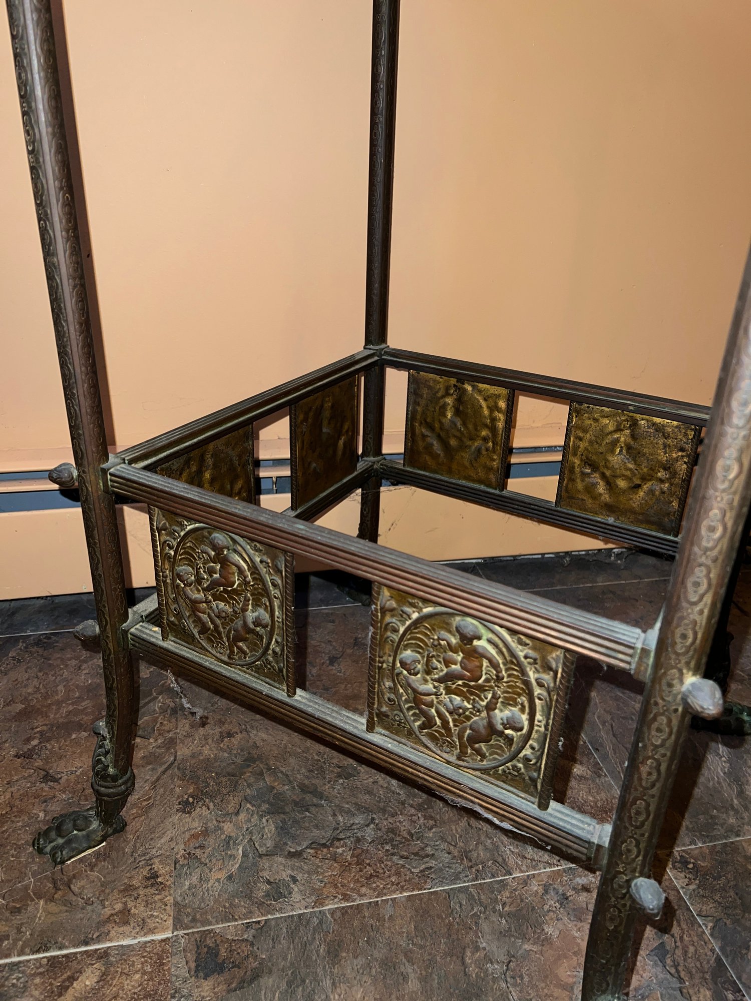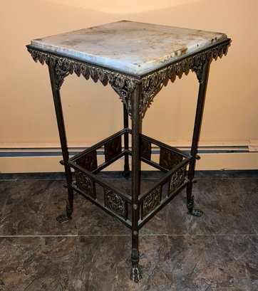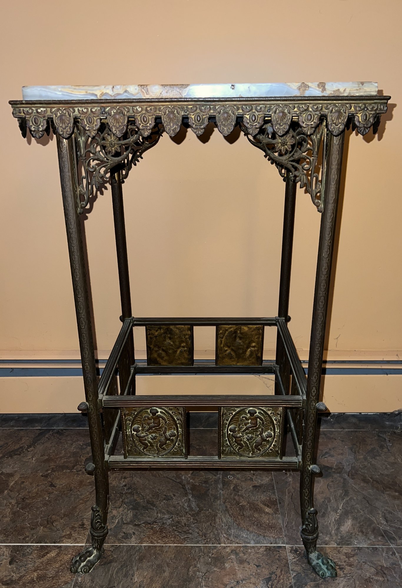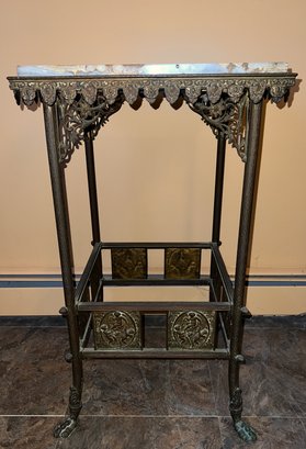Finely ornate with cupids in a cast brass standing on four claw feet. Very nice marble top!!