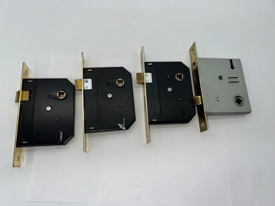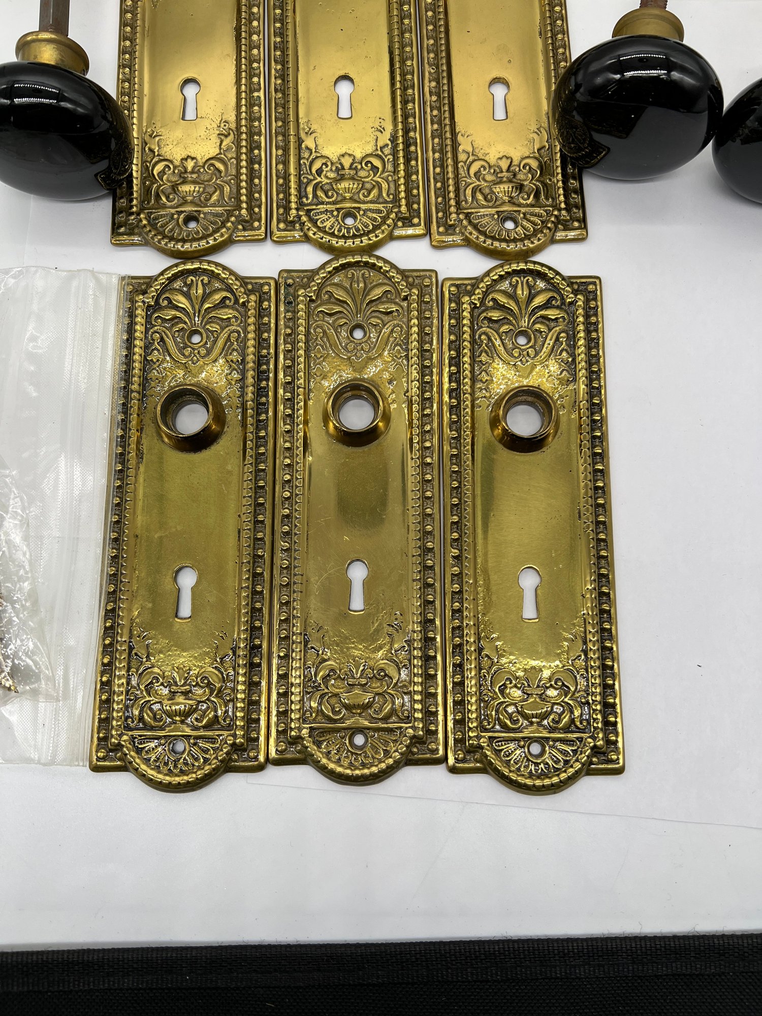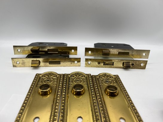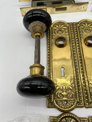 The set includes four Ilco complete sets of backplates and doorknobs, plus two mortise lock mechanisms, keys, and screws.
