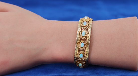 Featuring 14 natural opals and intricate filigree work with clasp lock. -.75"W