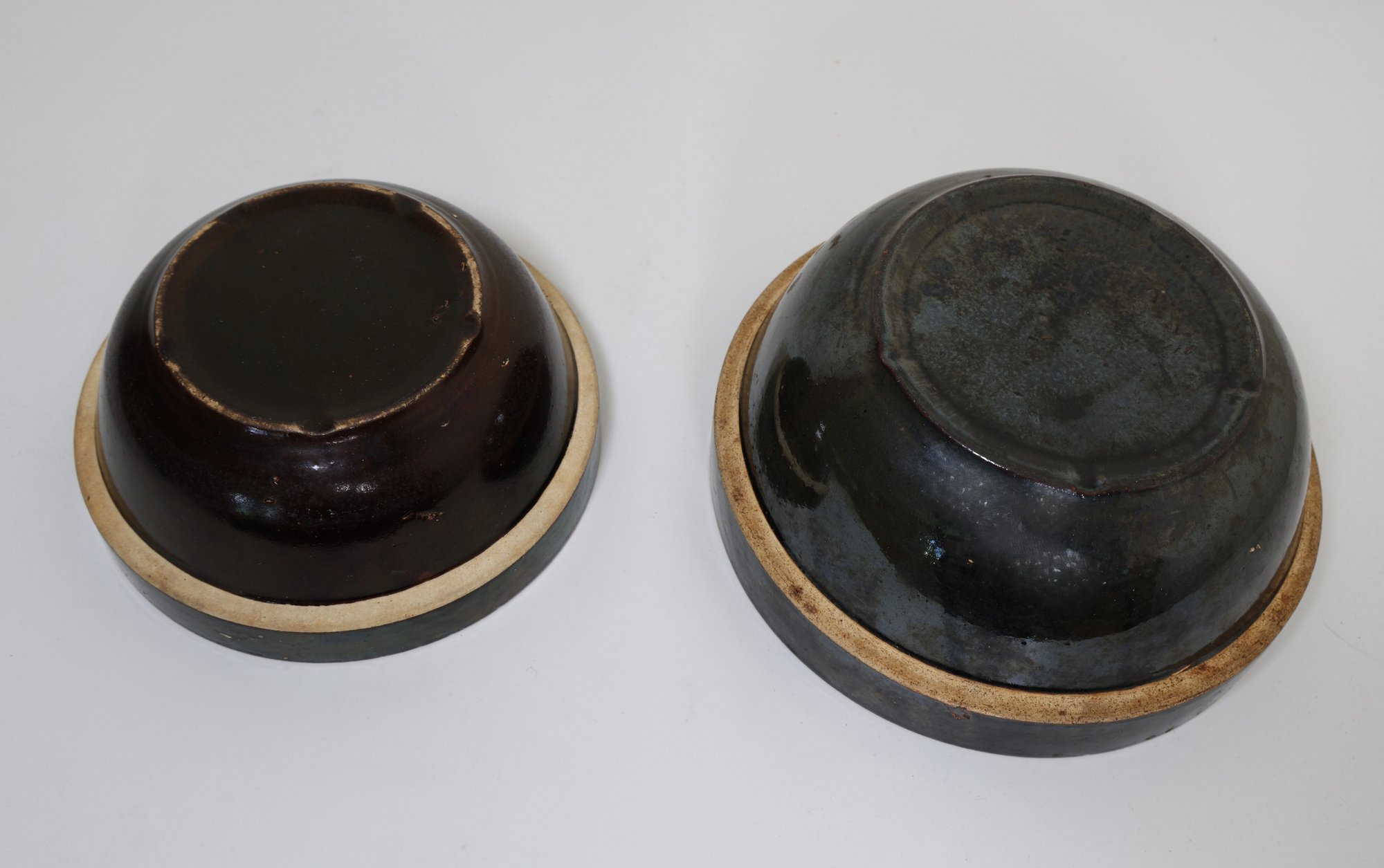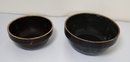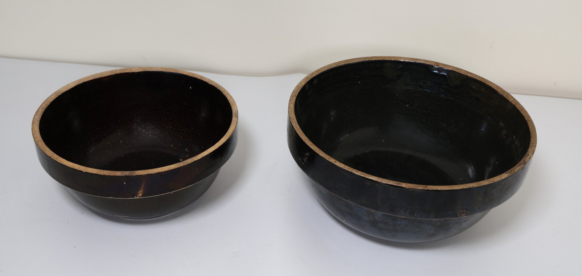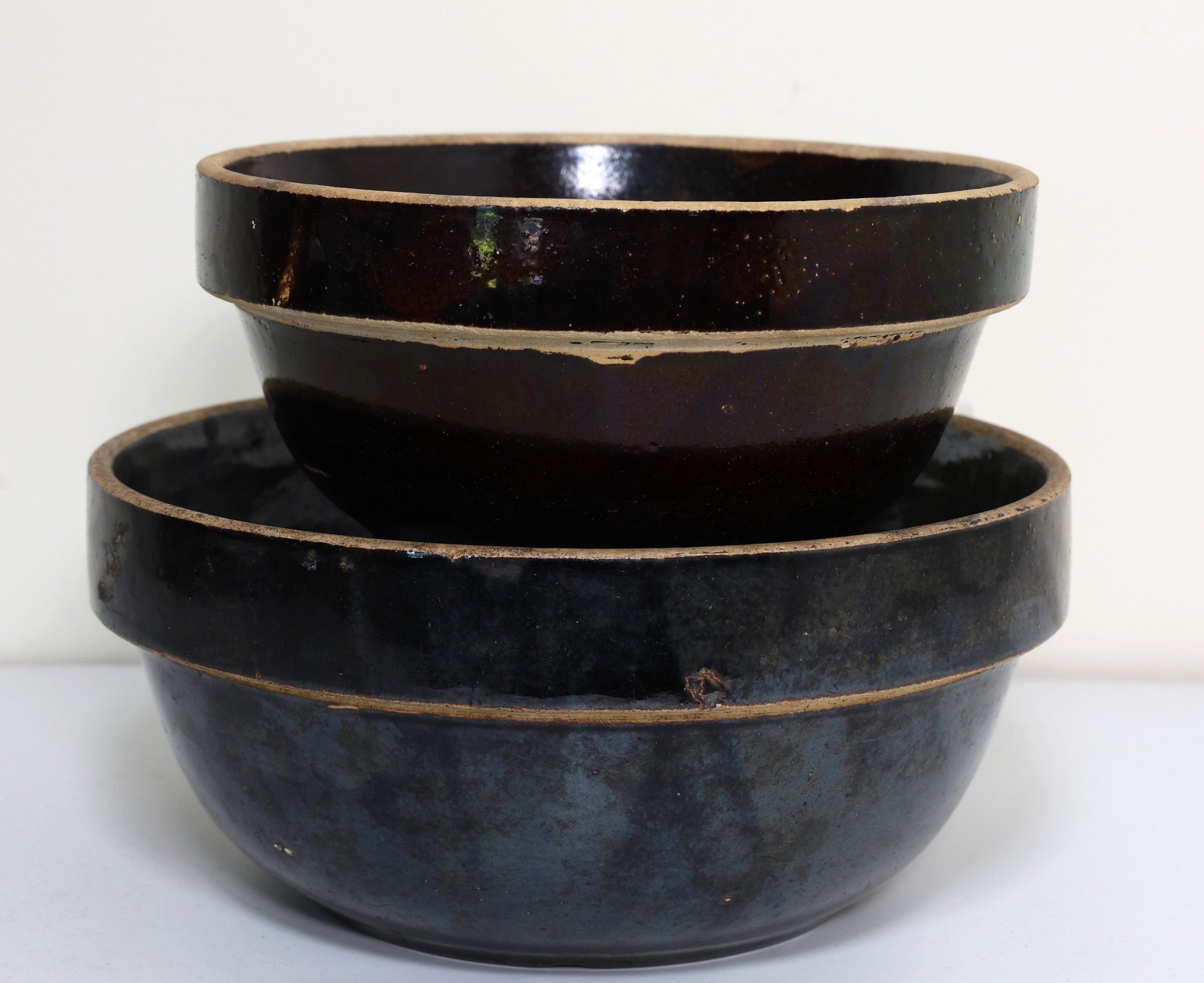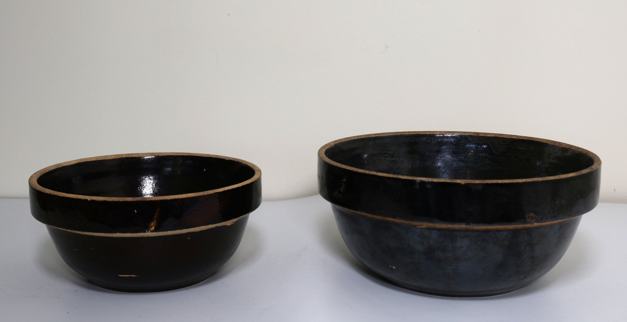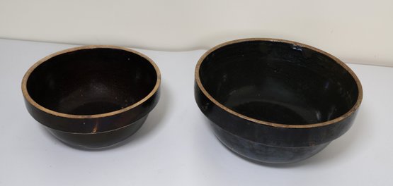 2 salt-glazed band stoneware mixing bowls, 8.5" and 10.5". They appear to be in nice condition.
