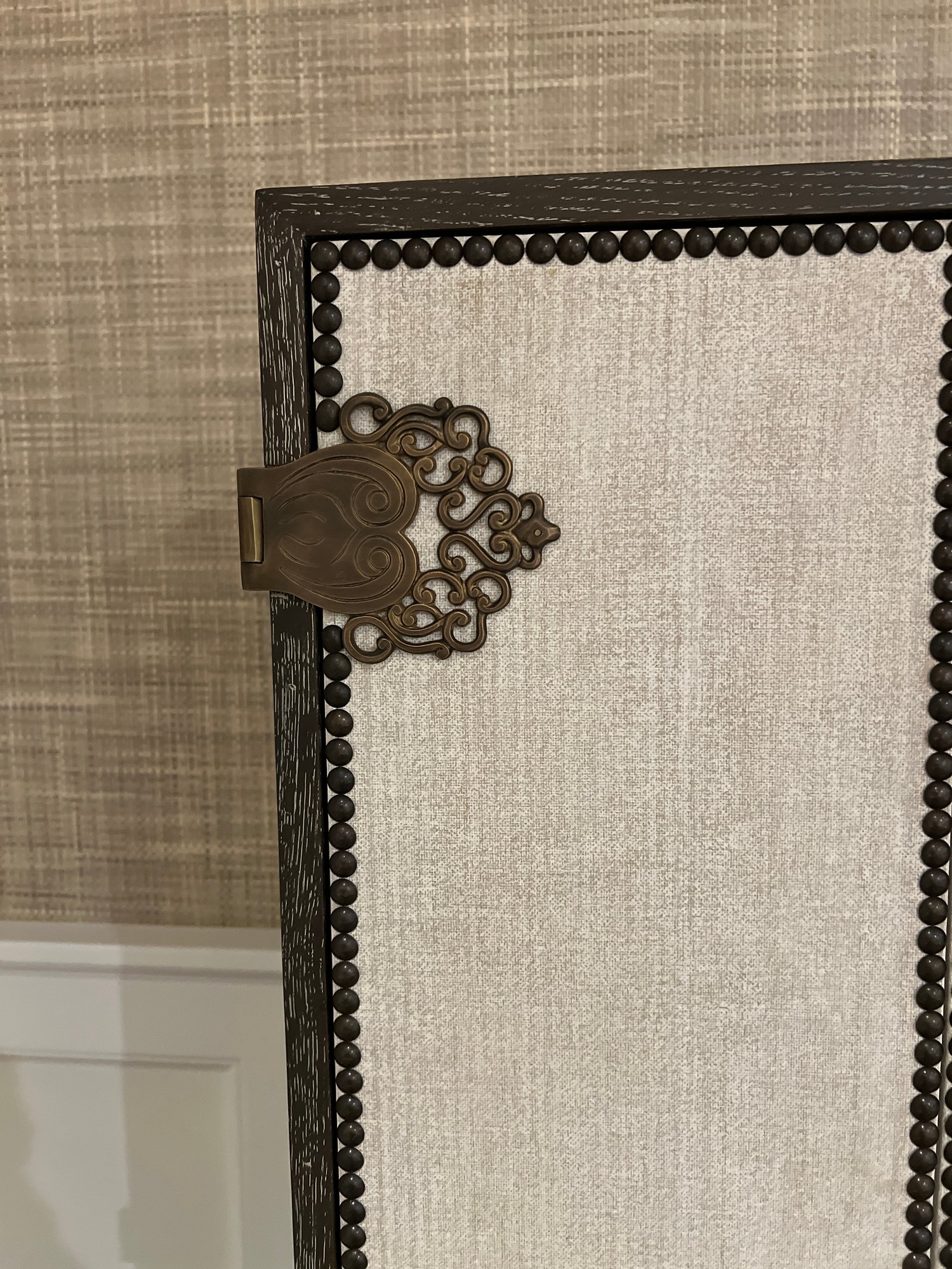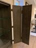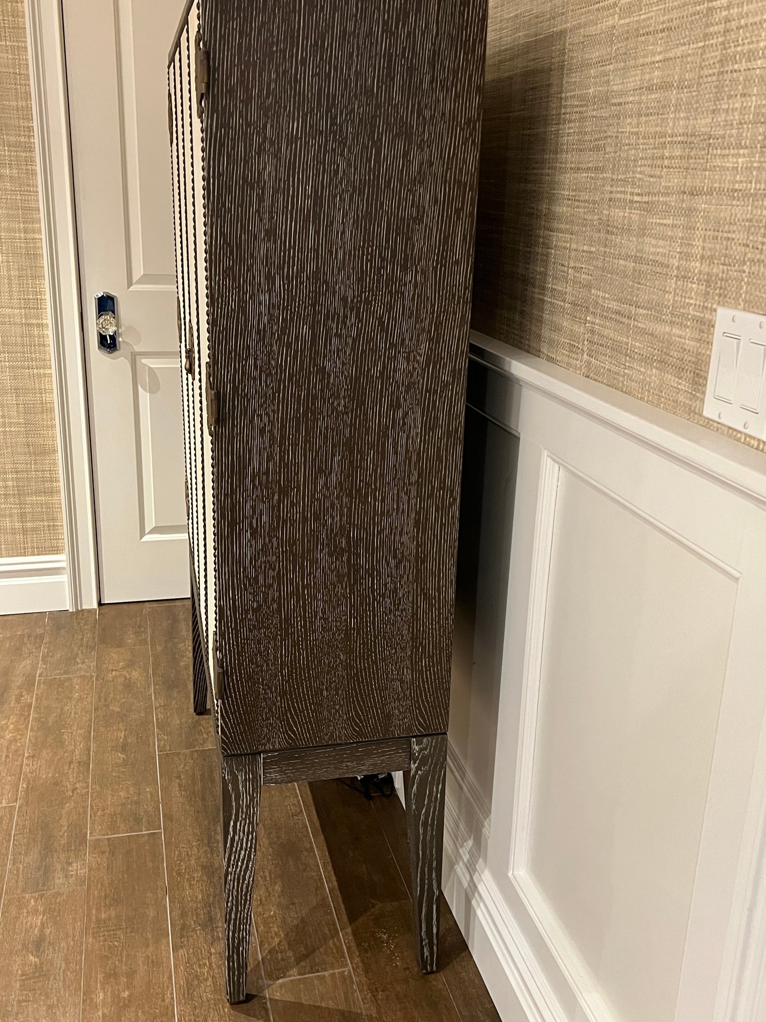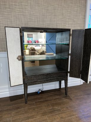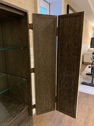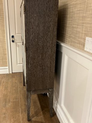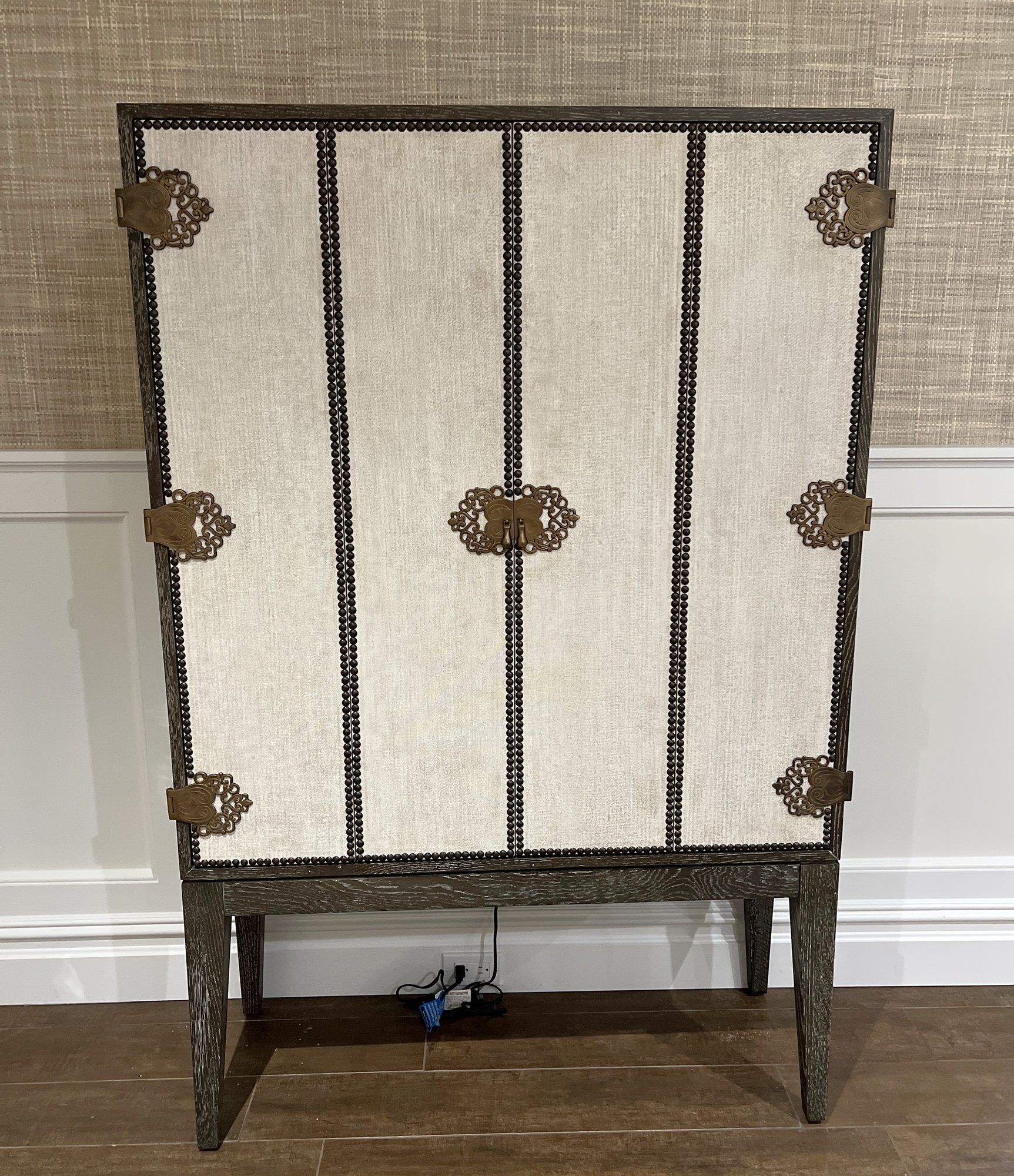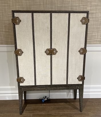 Wood bar/cabinet in a veneered gray limed oak finish features a pair of bi-fold natural linen doors with nail head trim and ornate antiqued brass hinges. Interior features mirrored back with recessed light 3 adjustable shelves and 2 drawers.