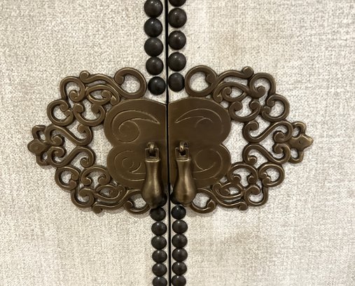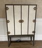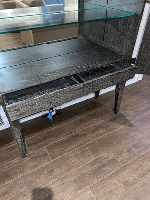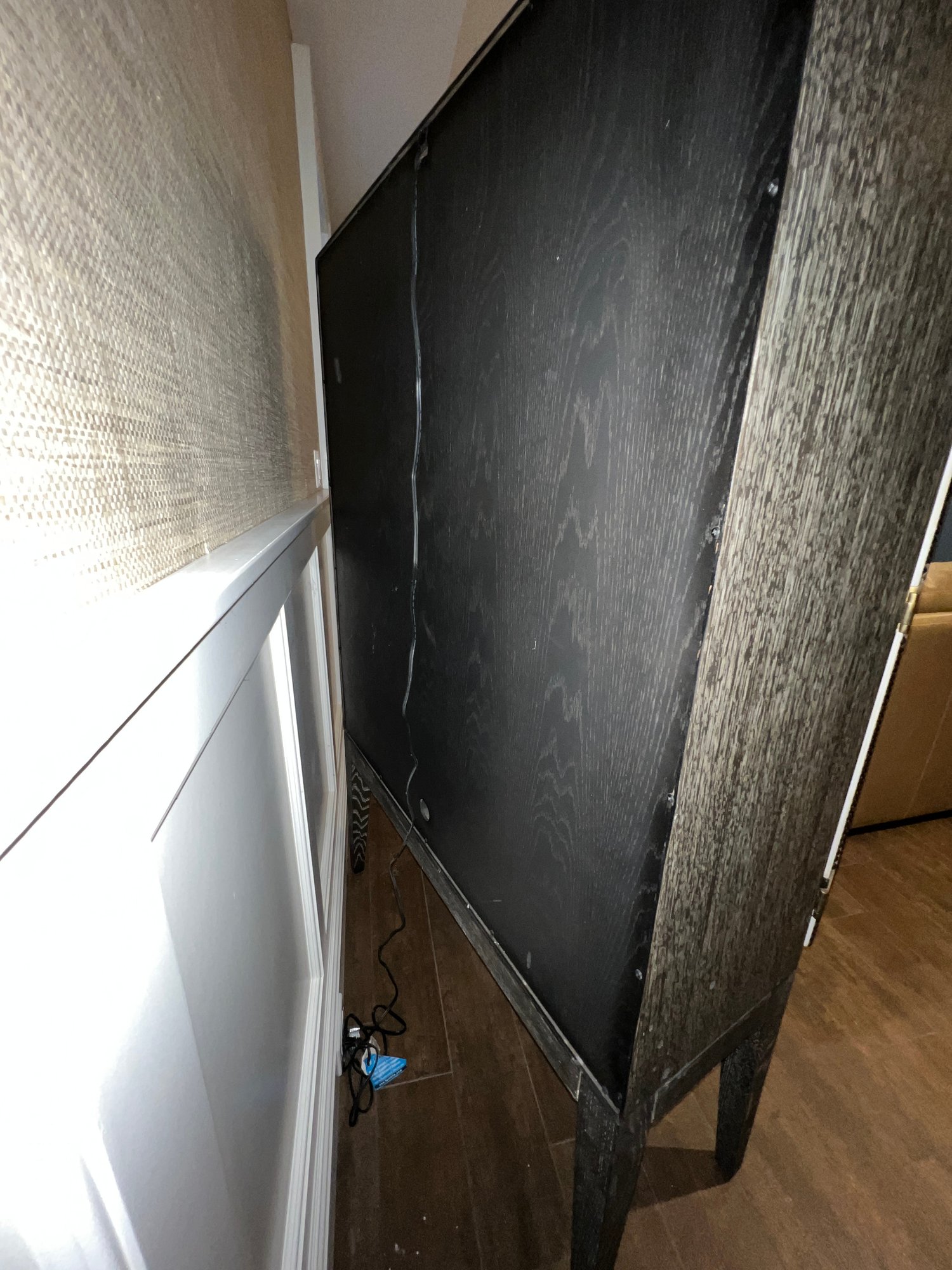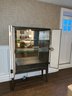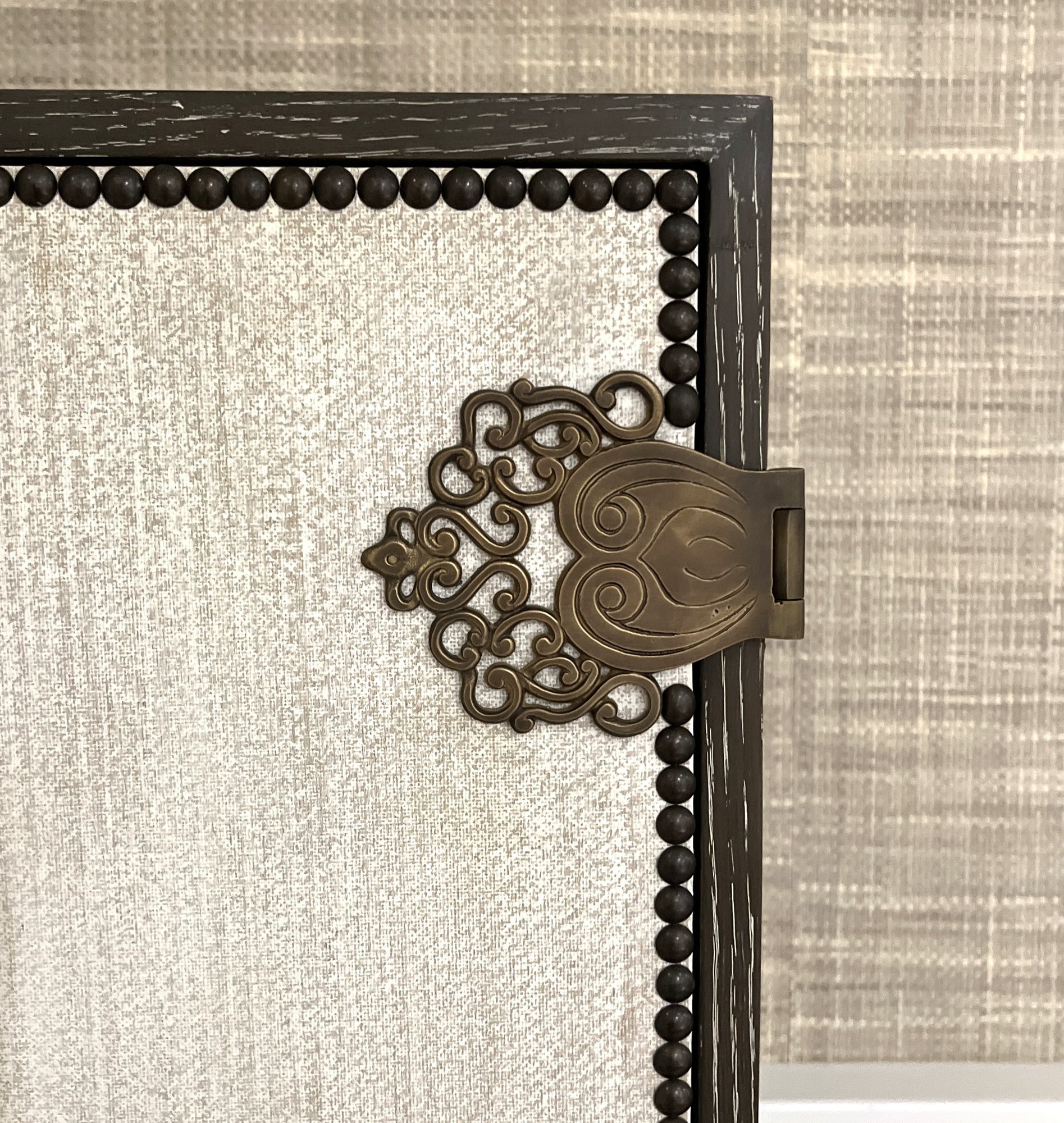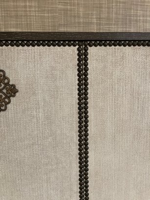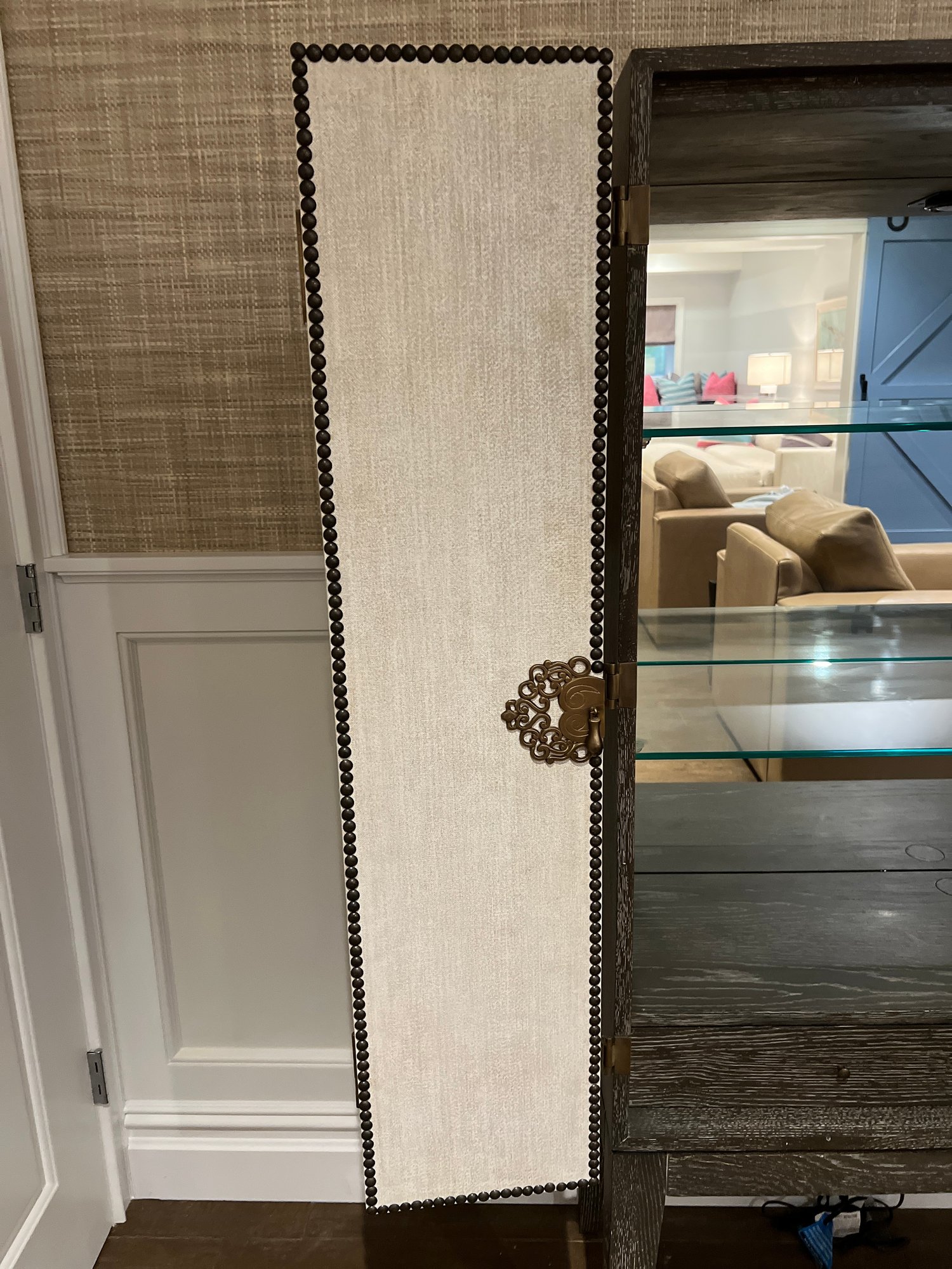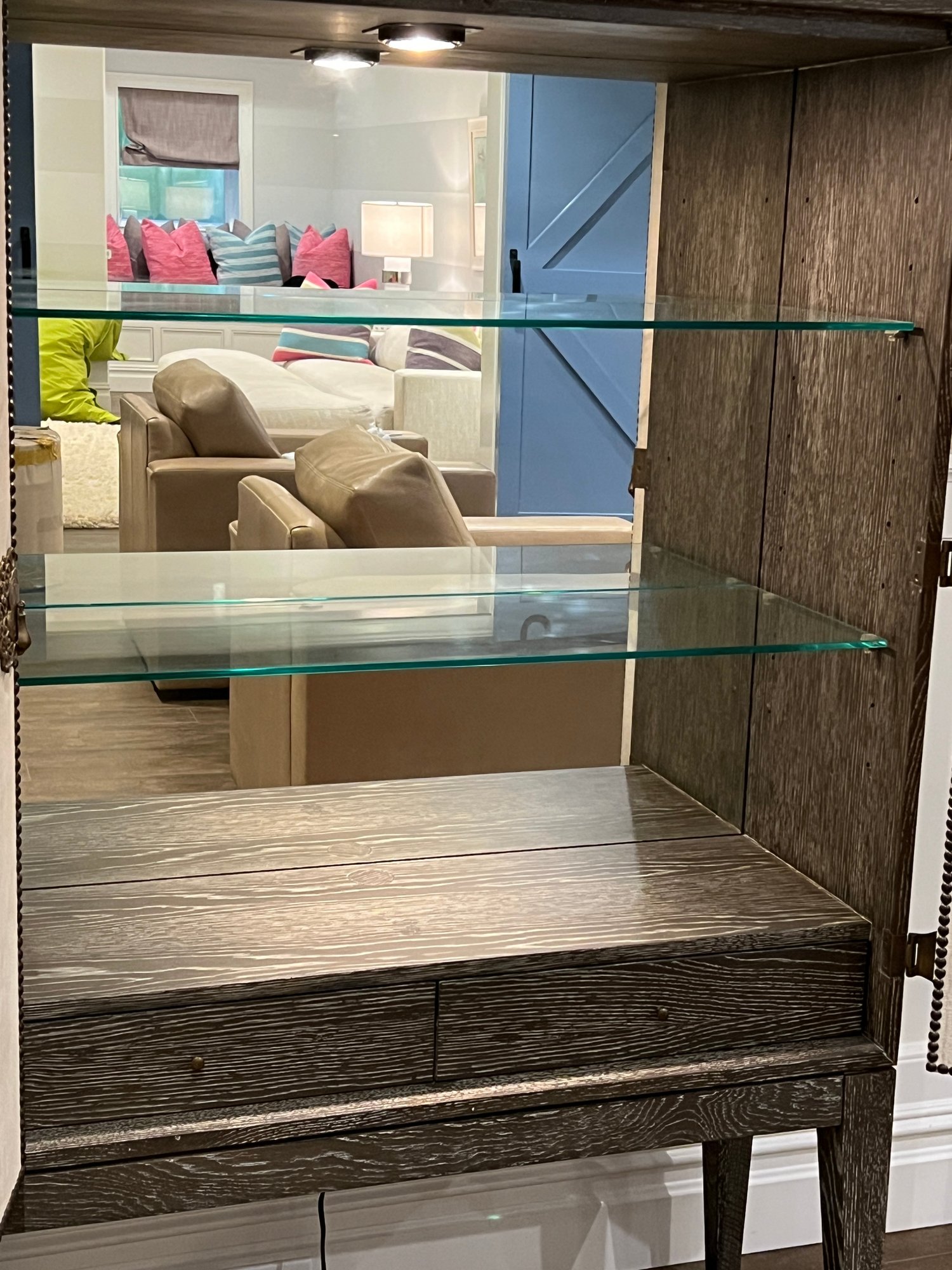 Wood bar/cabinet in a veneered gray limed oak finish features a pair of bi-fold natural linen doors with nail head trim and ornate antiqued brass hinges. Interior features mirrored back with recessed light 3 adjustable shelves and 2 drawers.