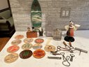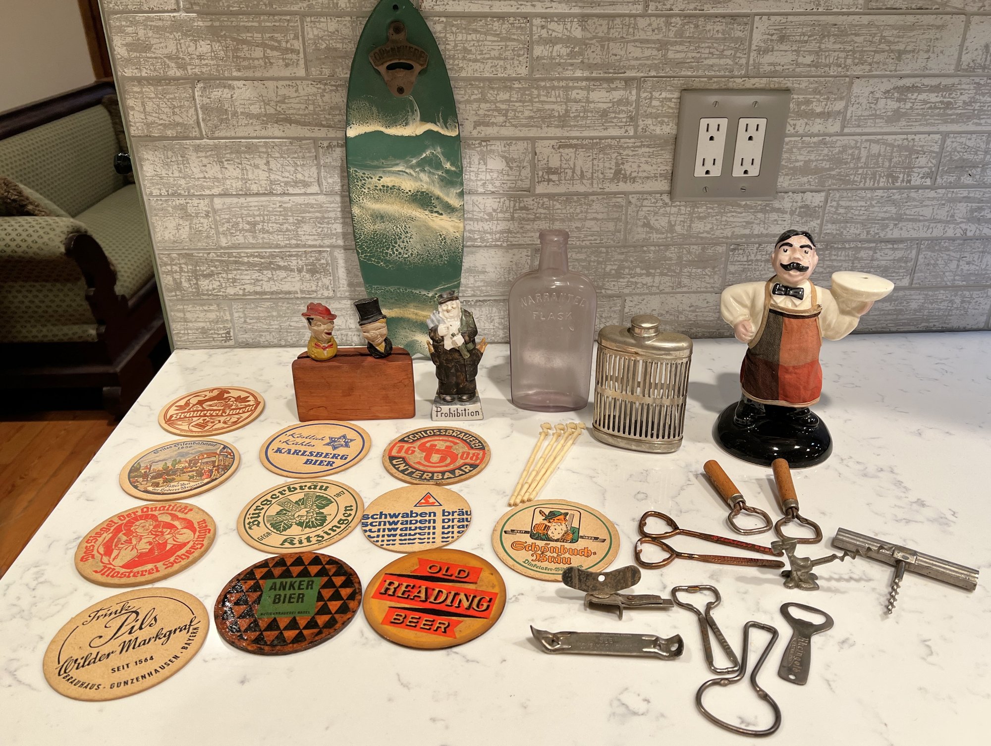 surfboard with opener, beer coasters, stirrers, opener, bartender, ,flasks, corkscrews