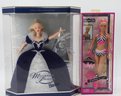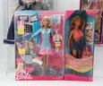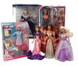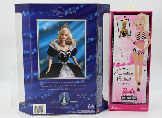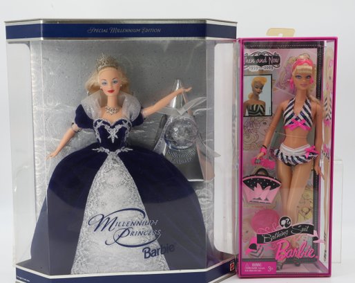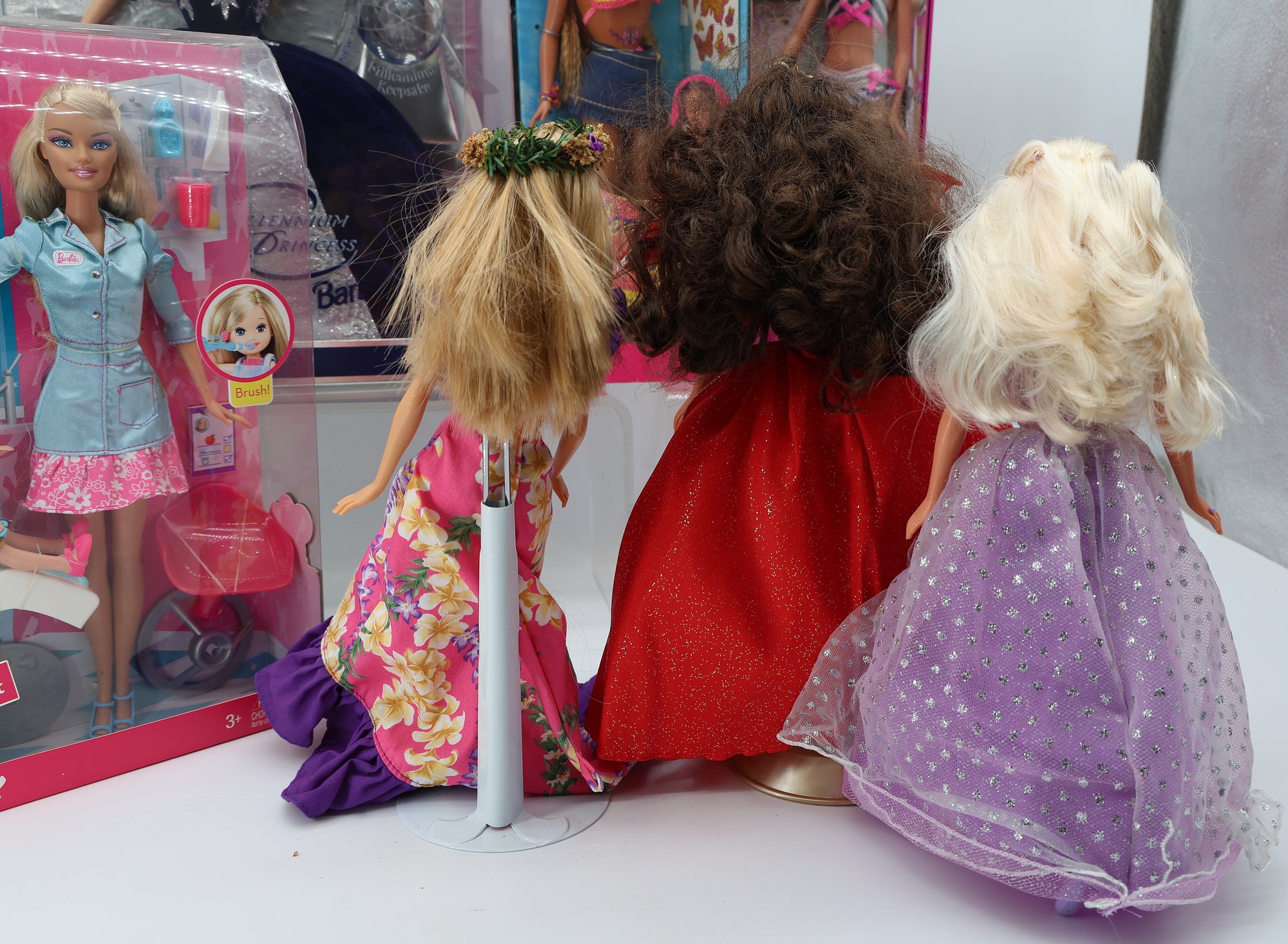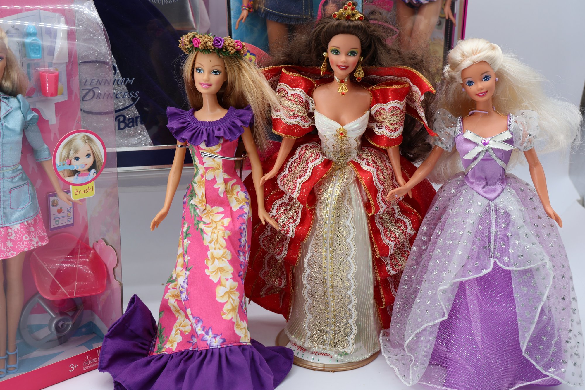 The "Special Millennium Edition" doll, dressed in a dark blue gown, was released in 1999 to mark the arrival of the new millennium. There is also a "Dentist Barbie" playset that features a Barbie doll, a smaller child doll, a dentist's chair, and assorted accessories. The 1997 Happy Holidays Special Edition Barbie showcases a white and gold gown with a red velvet overskirt and a gold choker necklace. This particular doll commemorates the 10th anniversary of the Holiday Barbie series. The doll on the left seems to be from the "Dolls of the World" collection, specifically the Princess of the Pacific Islands Barbie. Additionally, several other dolls are present in various outfits, ranging from intricate gowns to casual attire.