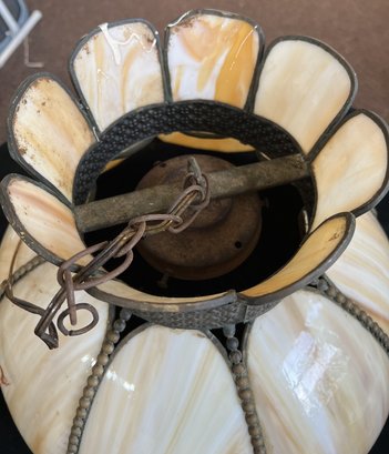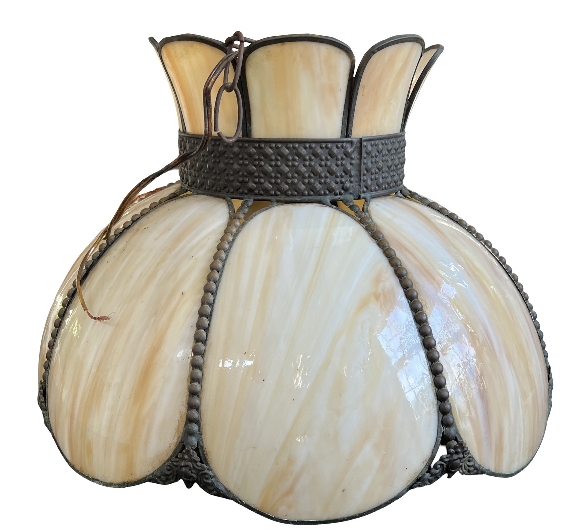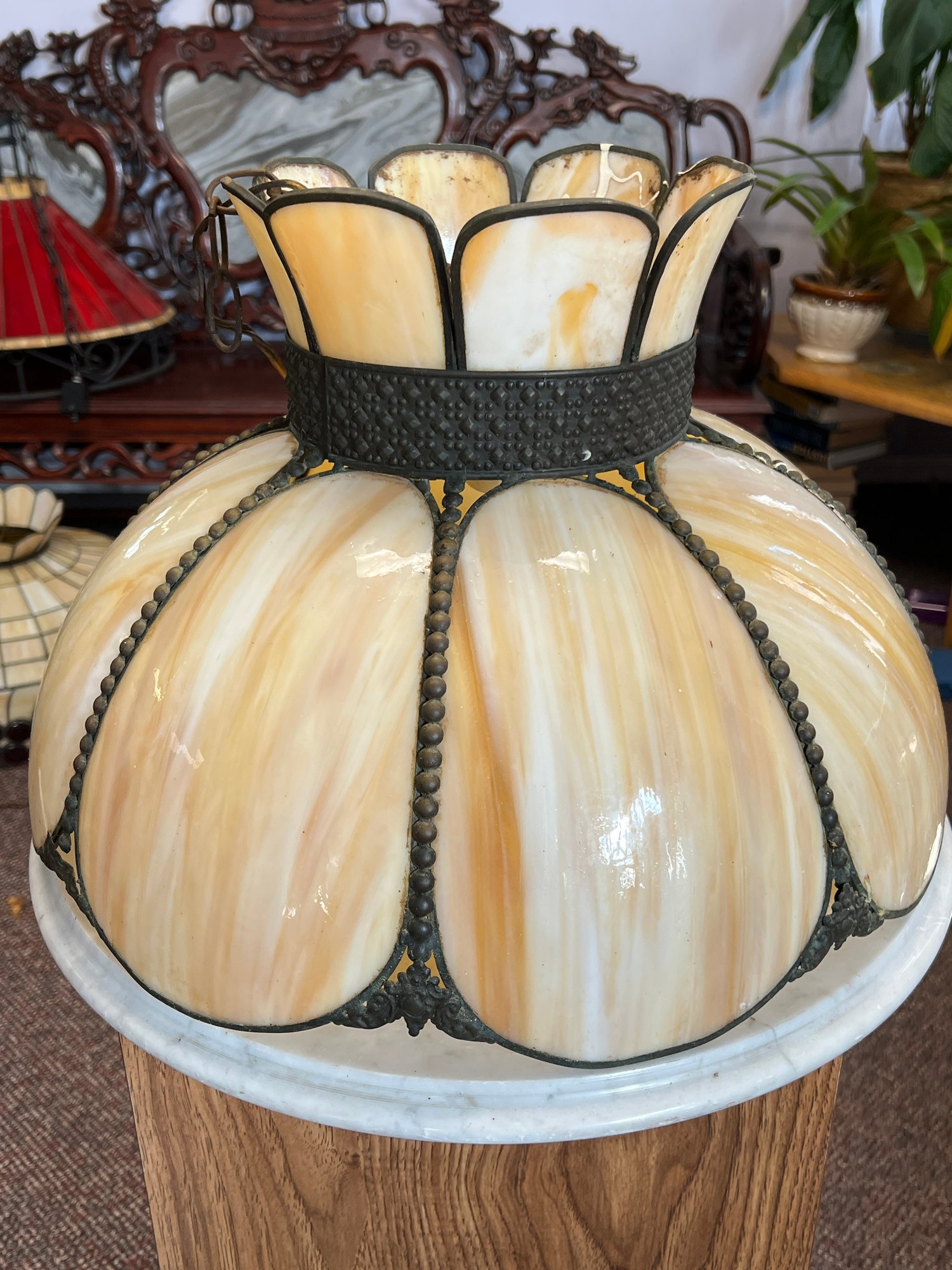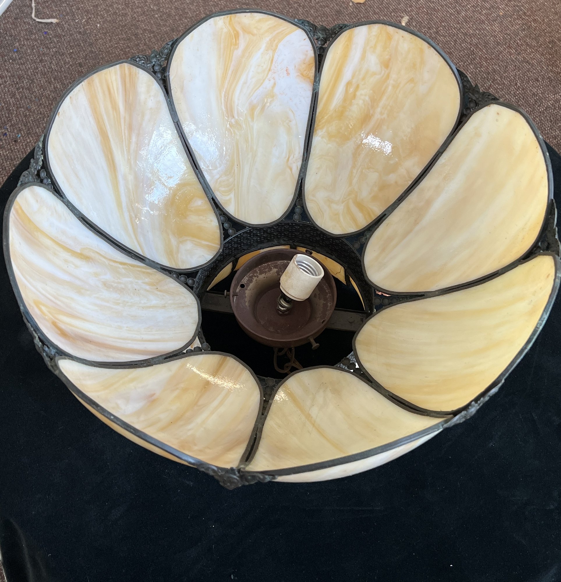 Often called "Tiffany style" (though not crafted by Tiffany Studios), it showcases white and caramel-colored marbled or "slag" glass panels. The shade has a unique "tulip" or "lotus" form, with panels bent both vertically and horizontally. These panels are held together by metal banding known as "came," which features a beaded trim along the seams. Such shades were widely mass-produced, especially in the 1970s, as a retro design style.