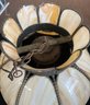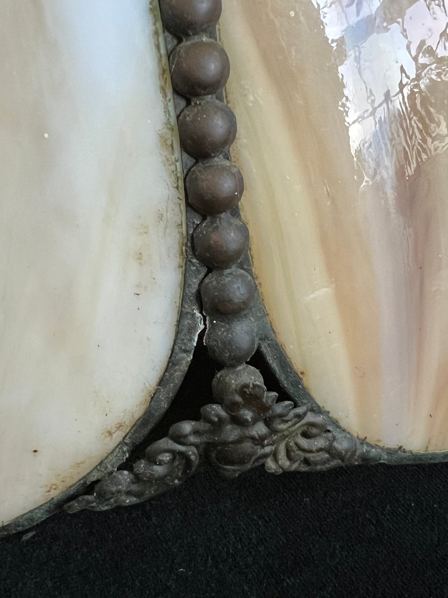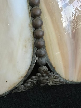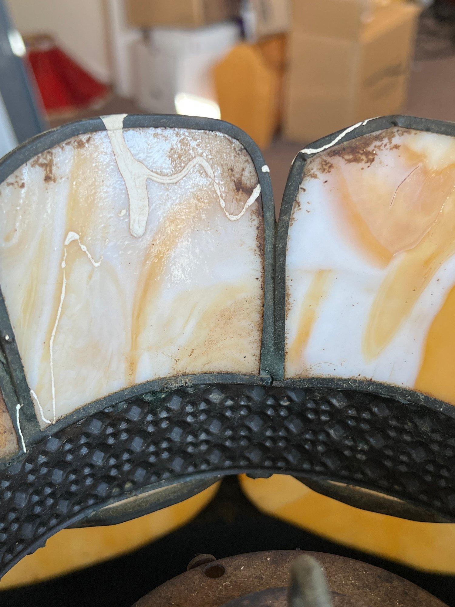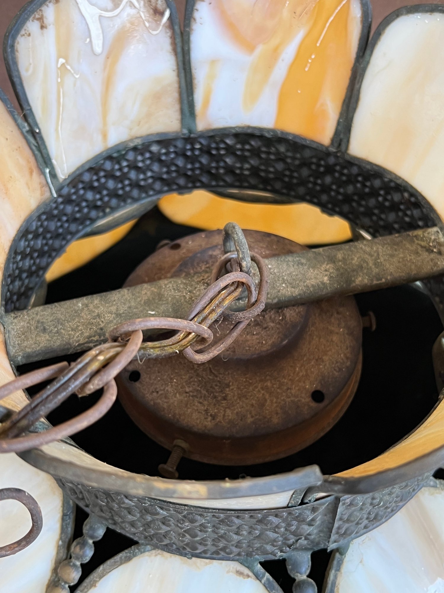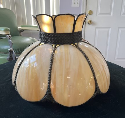 Often called "Tiffany style" (though not crafted by Tiffany Studios), it showcases white and caramel-colored marbled or "slag" glass panels. The shade has a unique "tulip" or "lotus" form, with panels bent both vertically and horizontally. These panels are held together by metal banding known as "came," which features a beaded trim along the seams. Such shades were widely mass-produced, especially in the 1970s, as a retro design style.