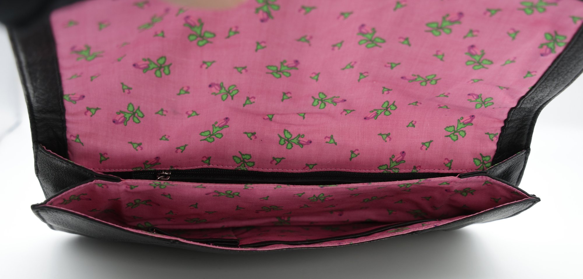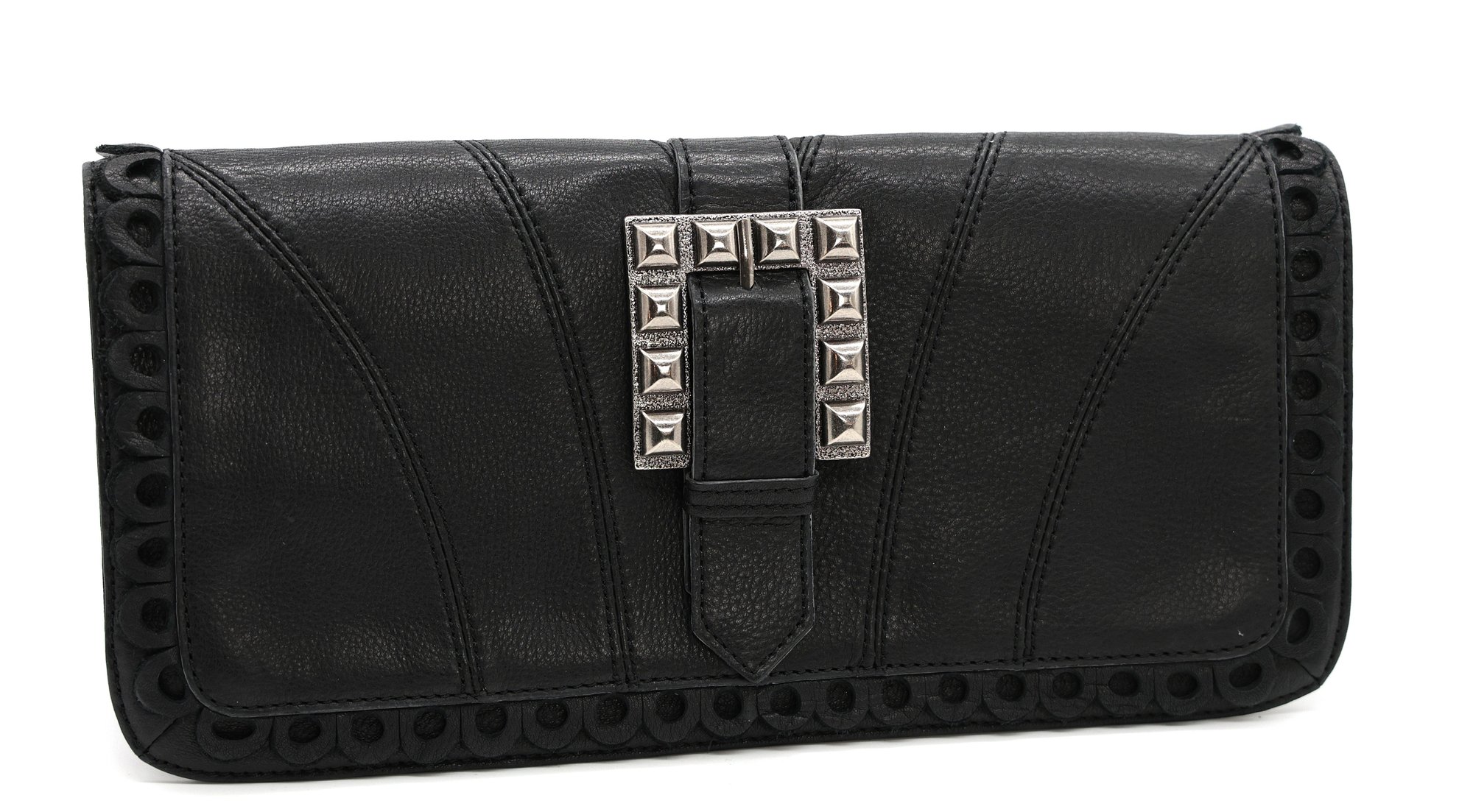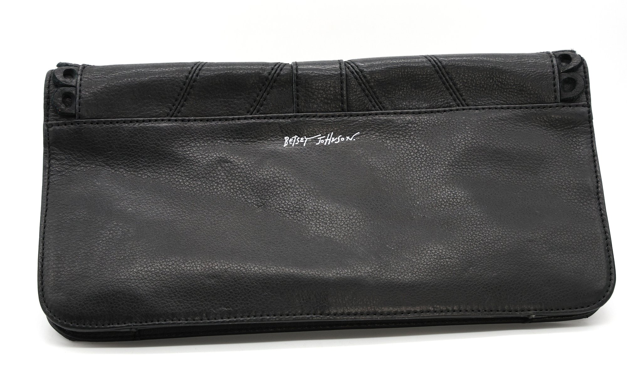 Vintage Betsy Johnson Black Leather Clutch with metal buckle. Zipper, divider, and two pockets inside, magnetic closure.