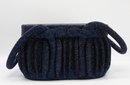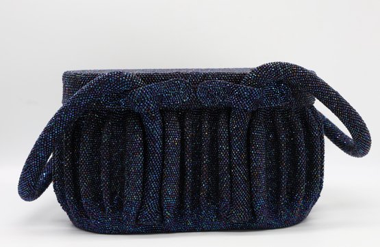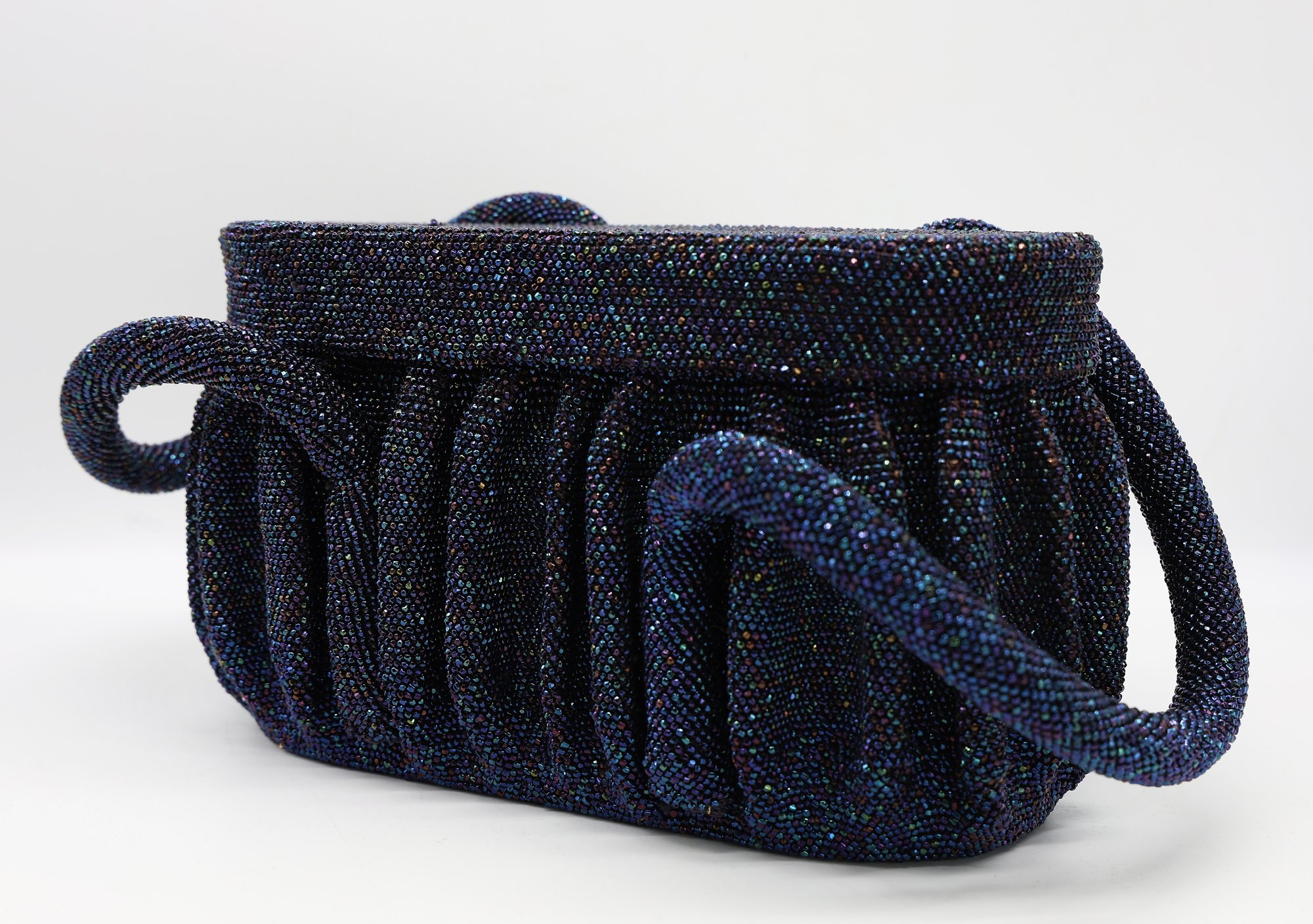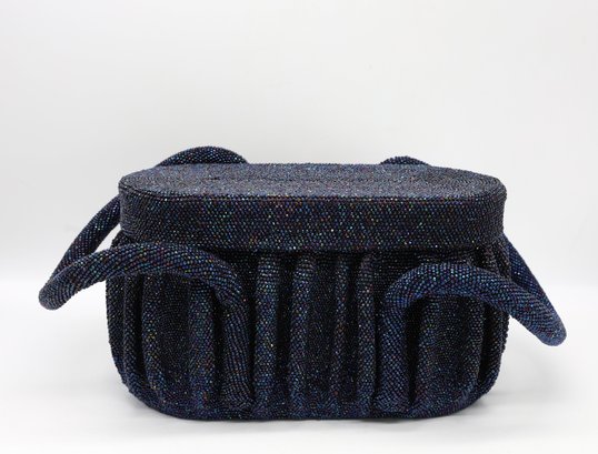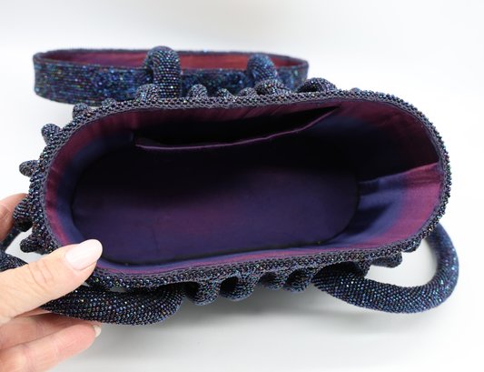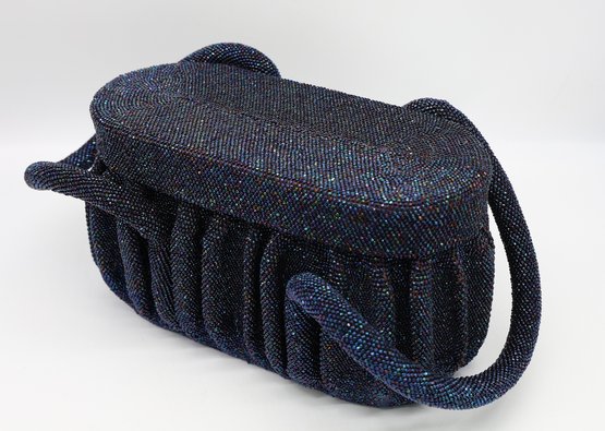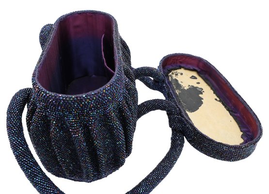 Vintage 1940's hand beaded metallic bag with boxy gathered oval shape, coiled strap and missing original mirror.
