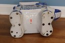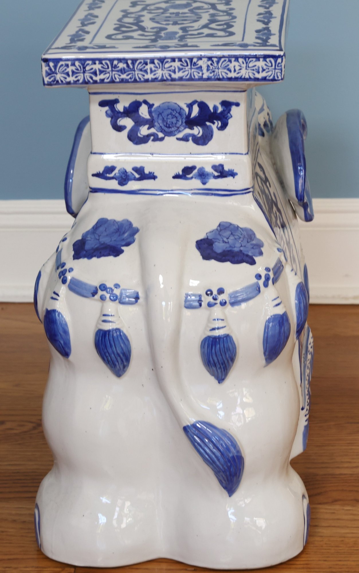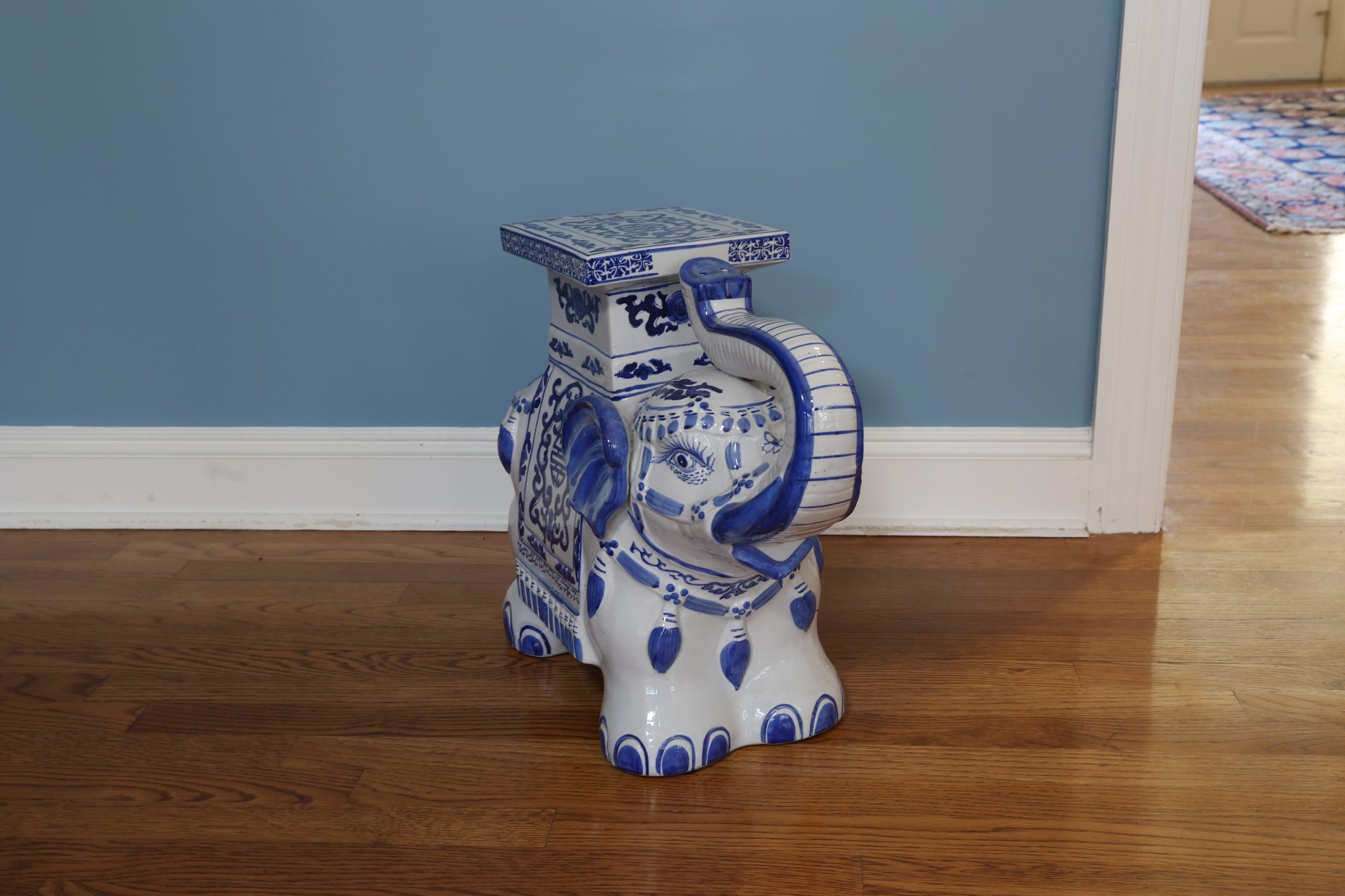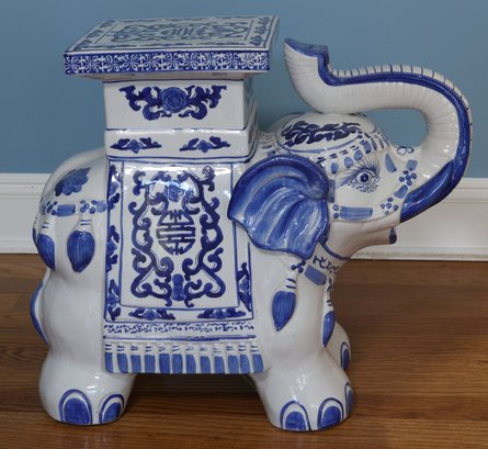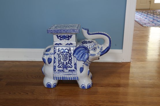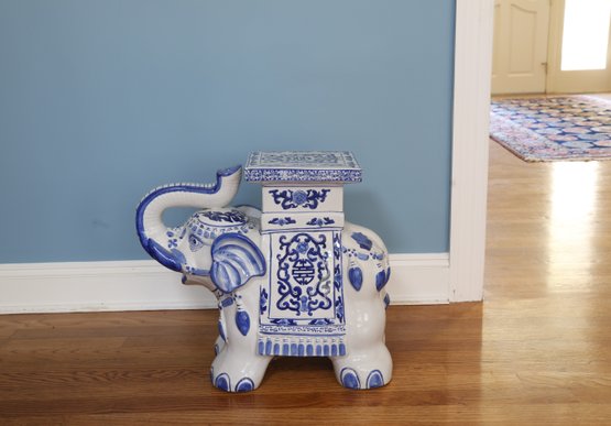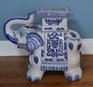 lovely Asian inspired elephant table/ plant stand in blue and white with tusk up for good luck!!