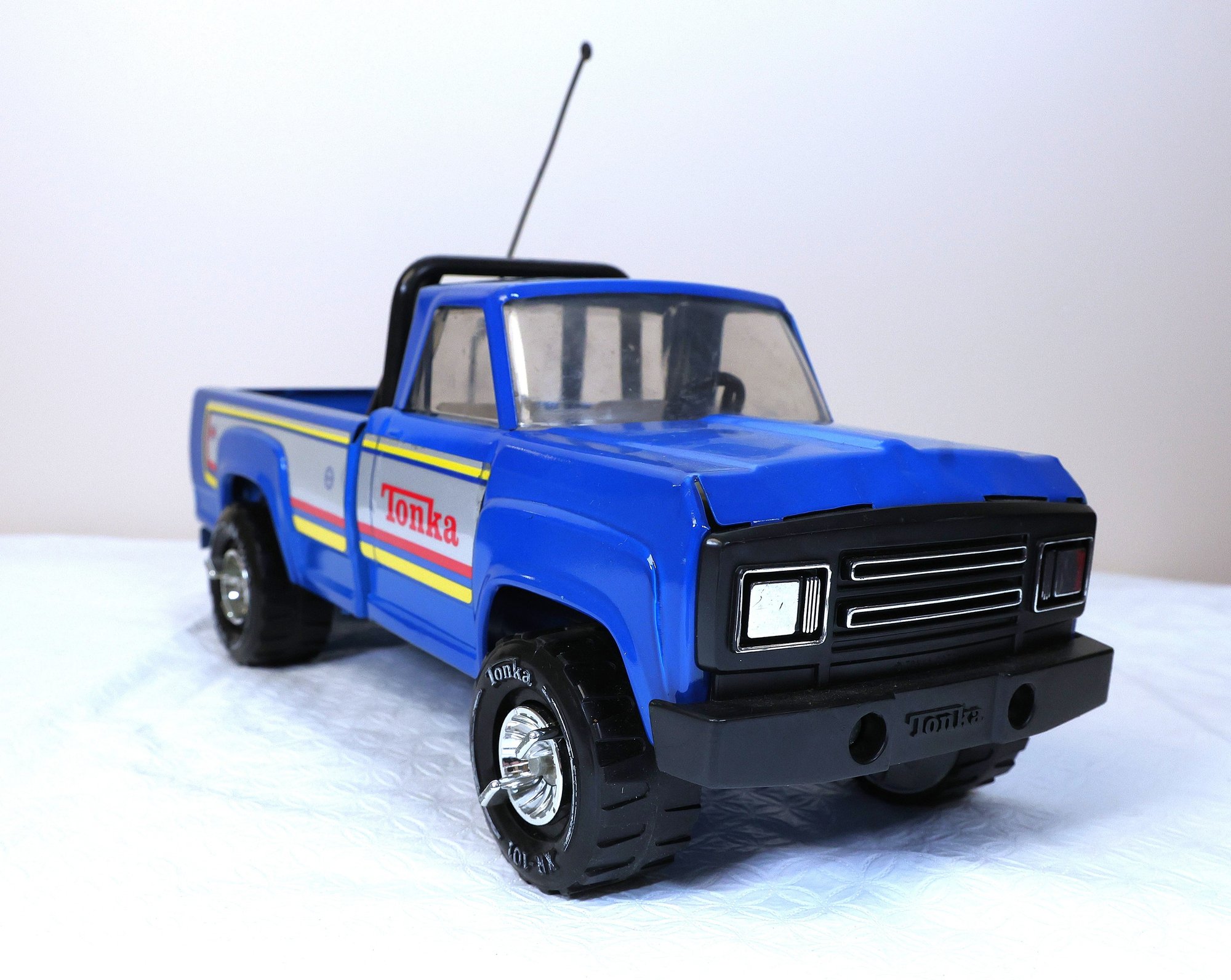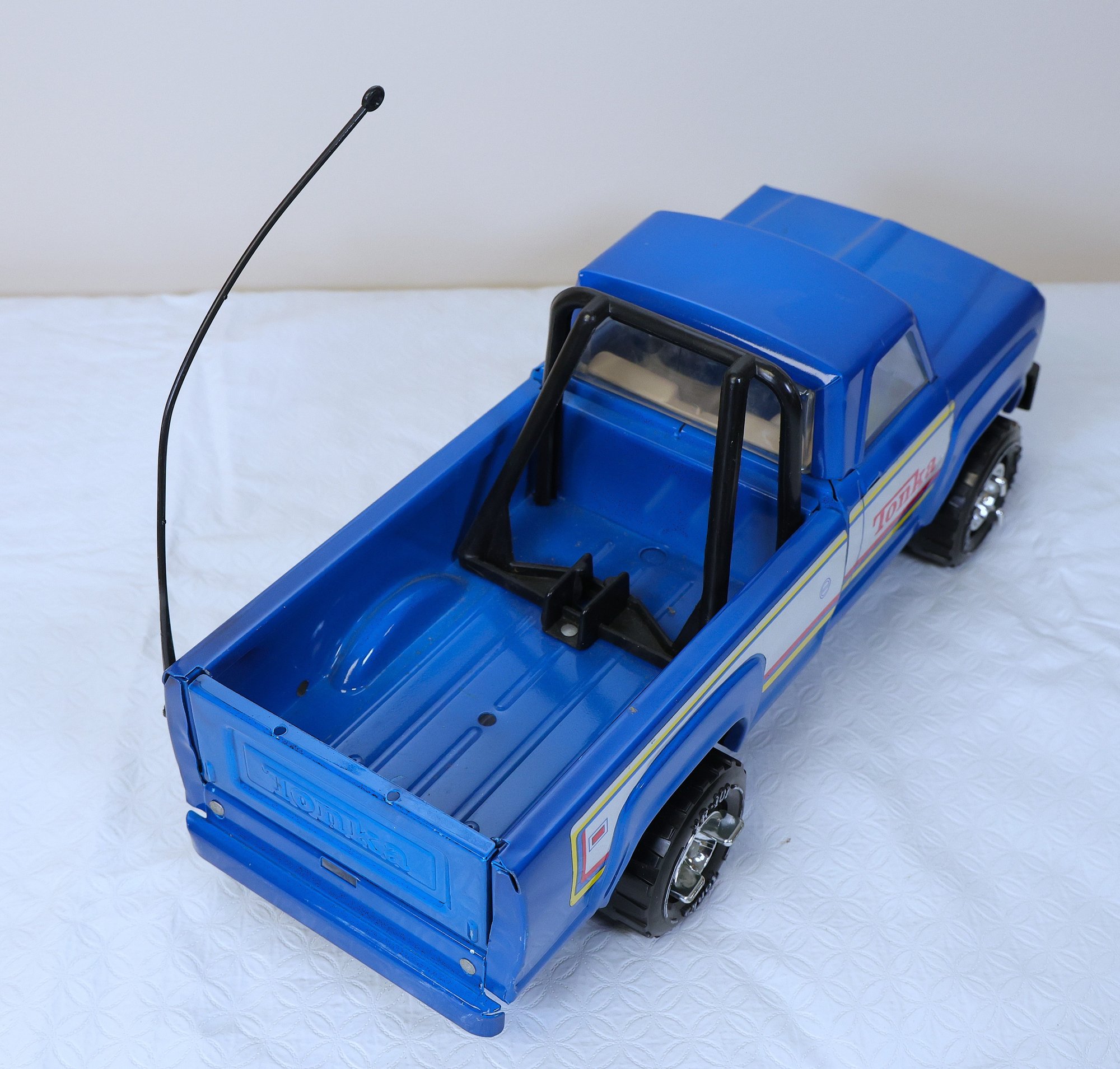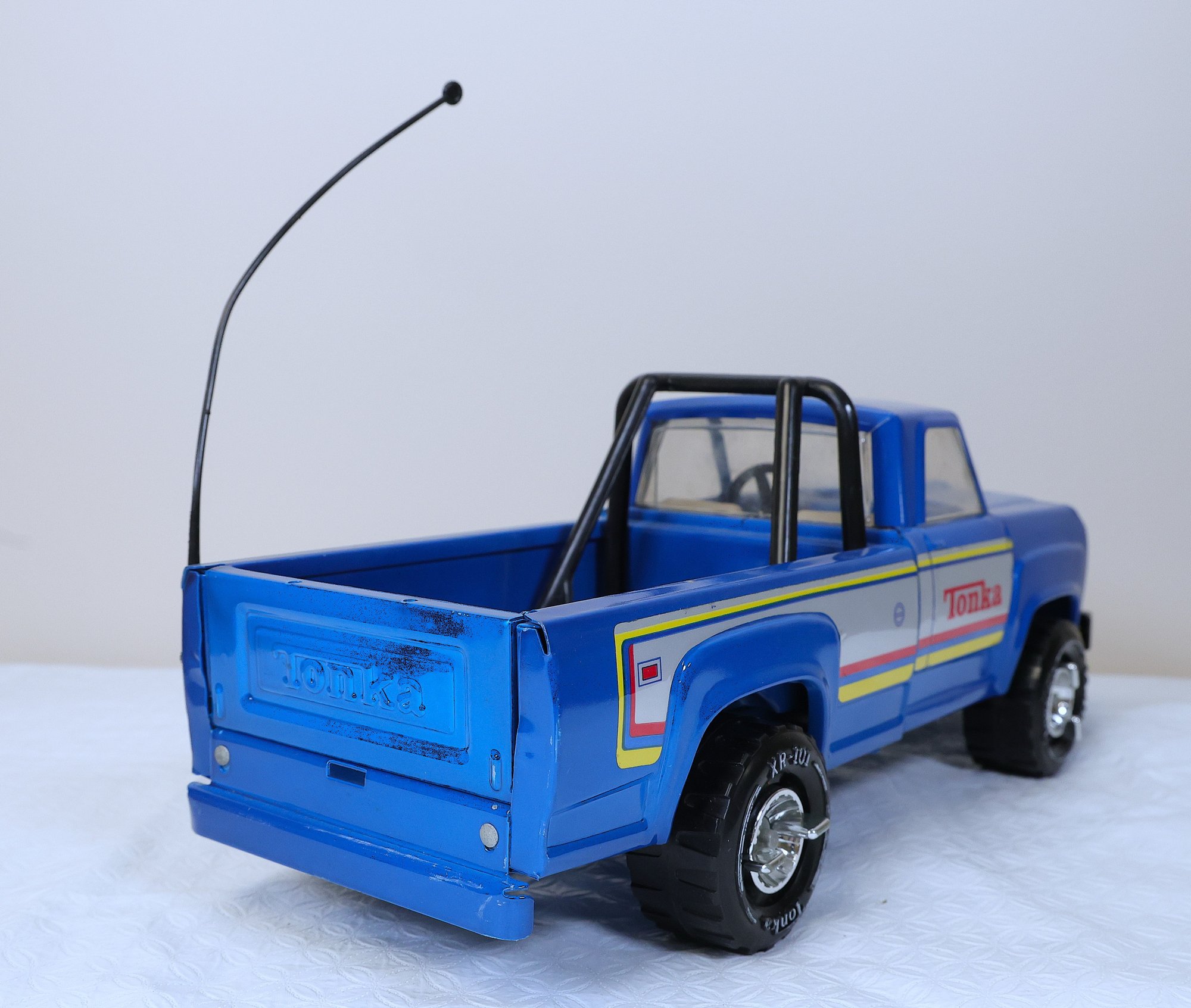 vintage blue Tonka 4 x 4 pressed steel toy pickup truck made in USA. 1970's-80's. Pressed steel Xr-101 Antenna