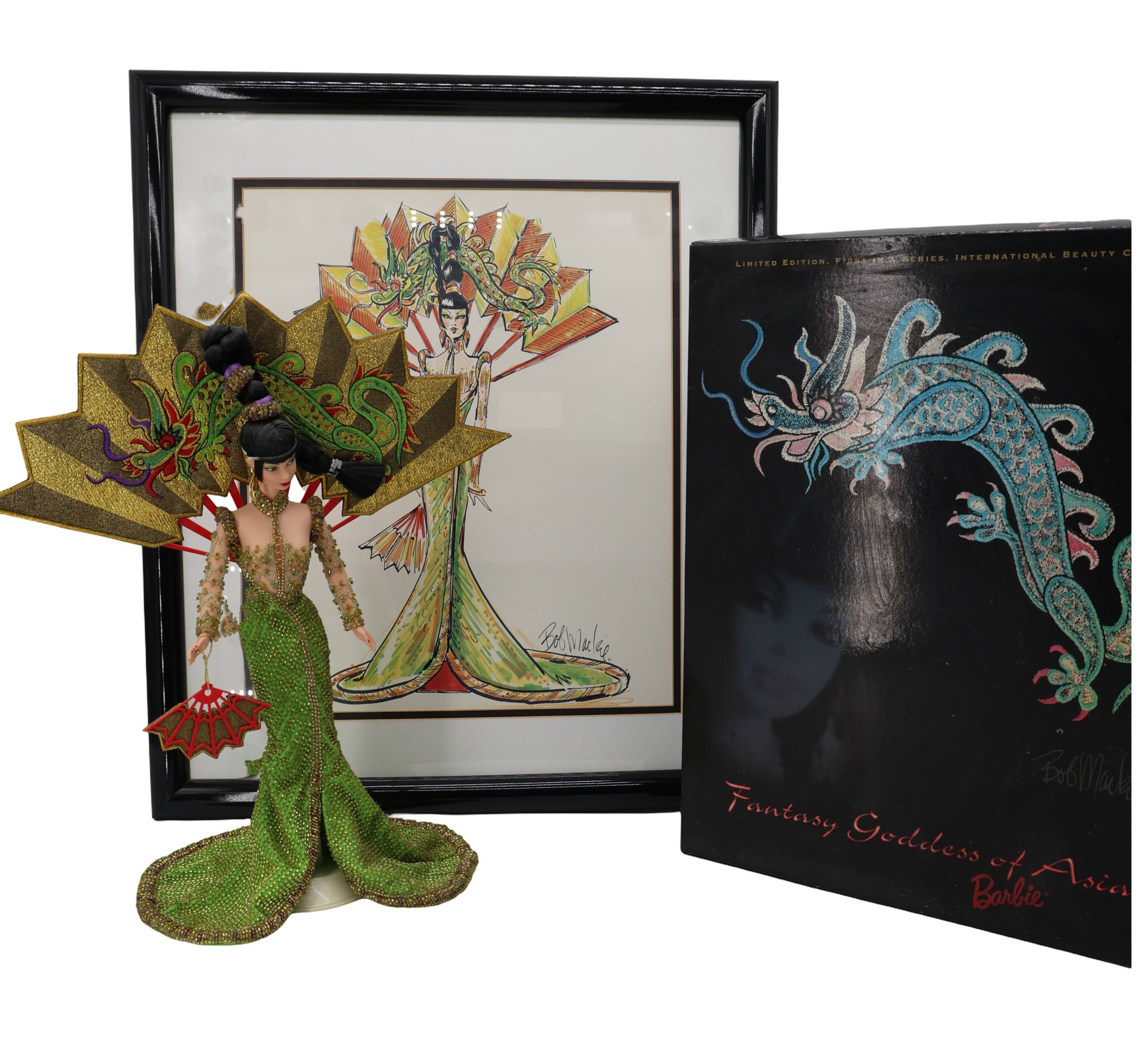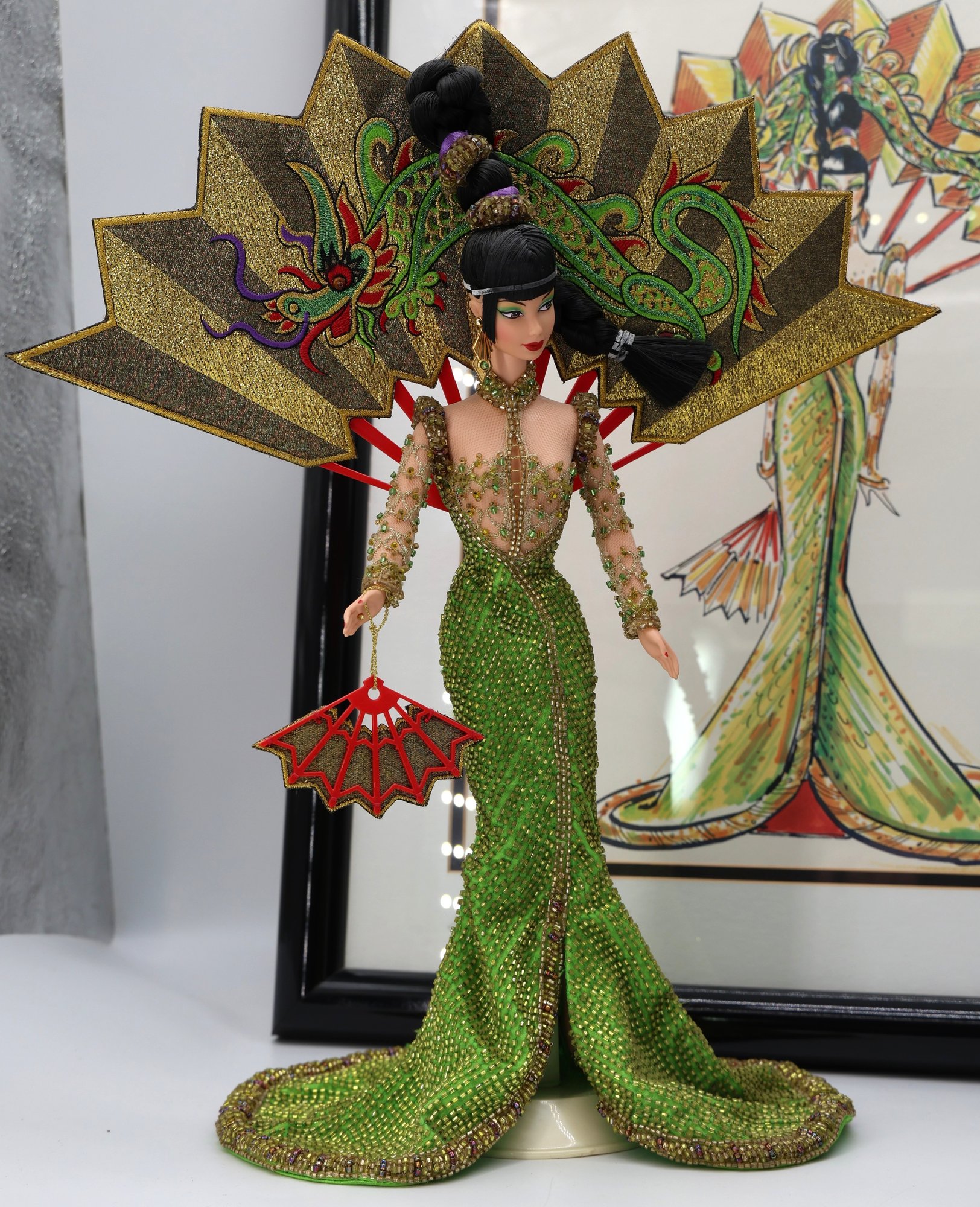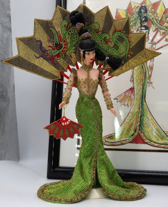 This Limited Edition doll is the inaugural piece in the International Beauty Collection series. Manufactured by Mattel and released approximately between 1998 and 2000, it draws inspiration from Asian colors and symbols, showcasing a vivid green gown and a large fan headdress. The set typically includes the doll, often still in its original box (NRFB), along with a print of the design by Bob Mackie.