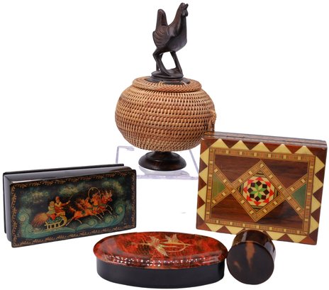 1- Vintage handmade lacquered wooden trinket box with inlaid marquetry design, measuring 4.5"W x 3.5"D x 1.5"H