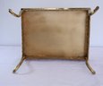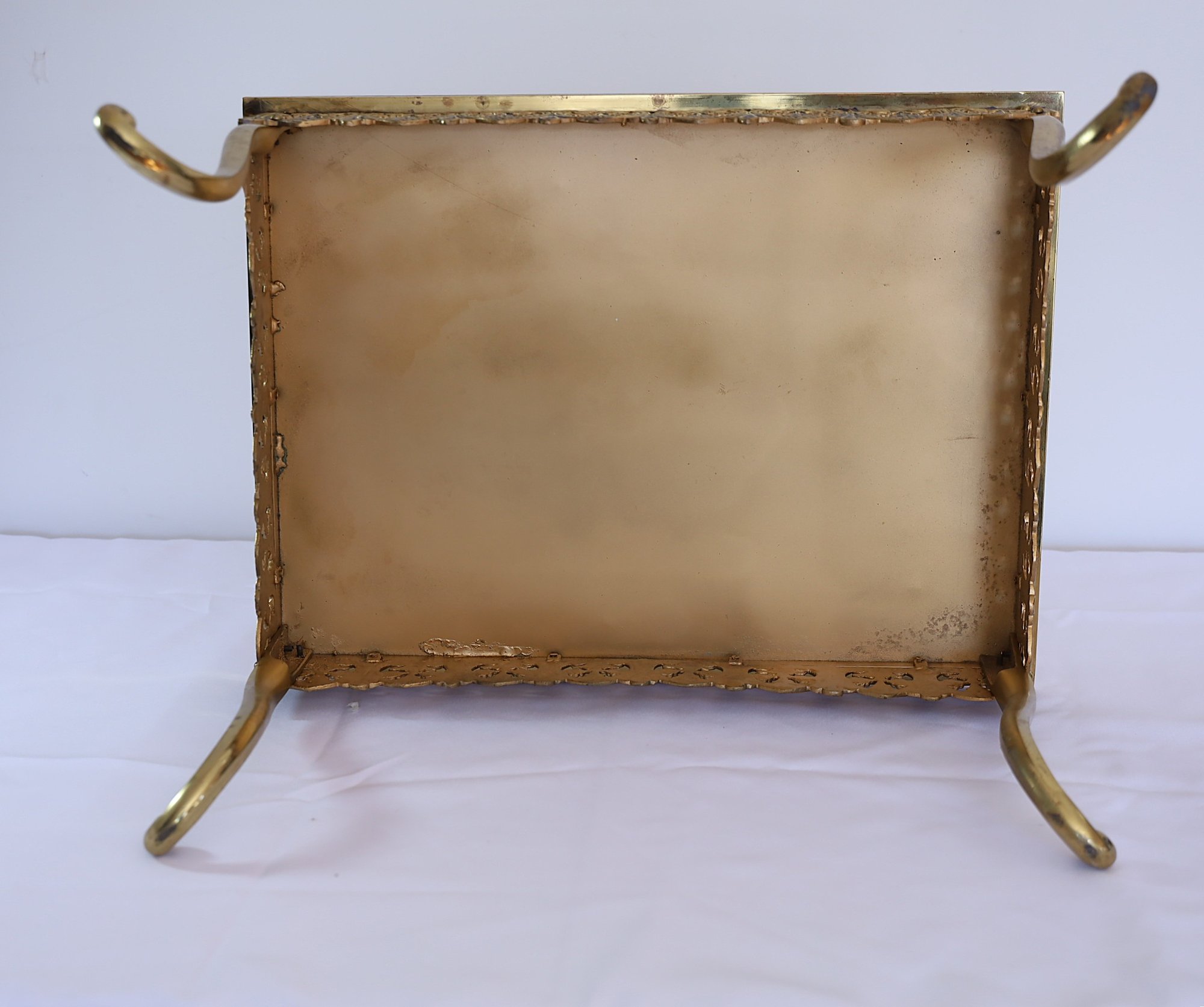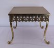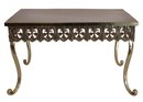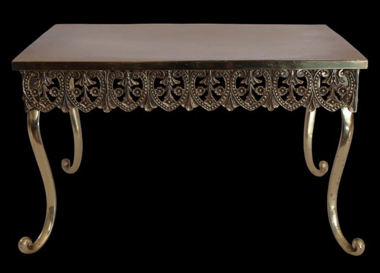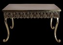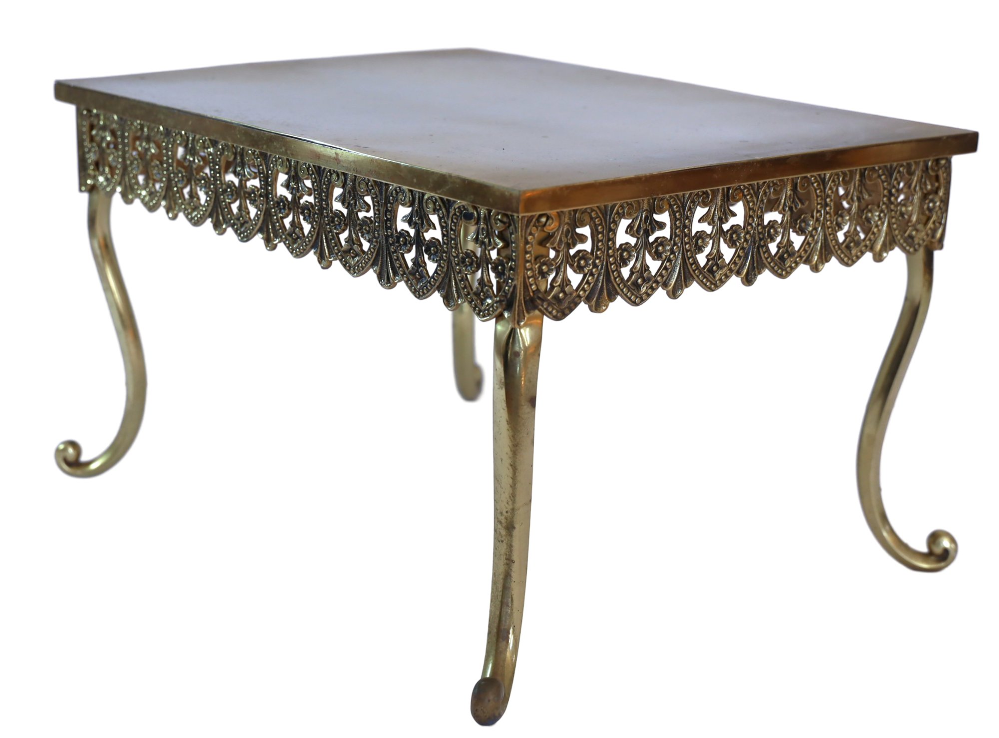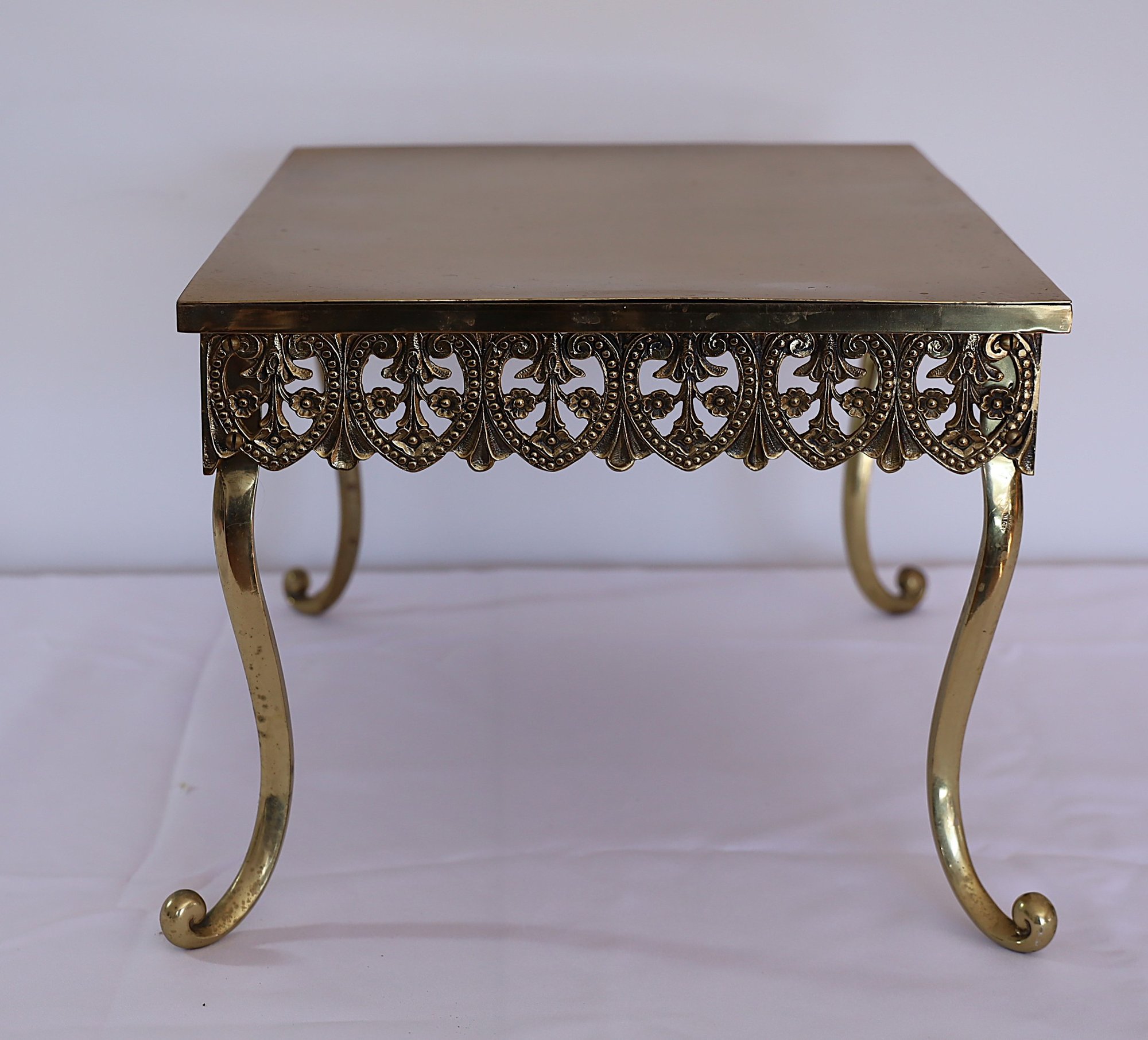 A small metal table features a square top with an intricate, open-work gallery of repeating heart or lyre shapes. It is supported by slender, gracefully curved legs.