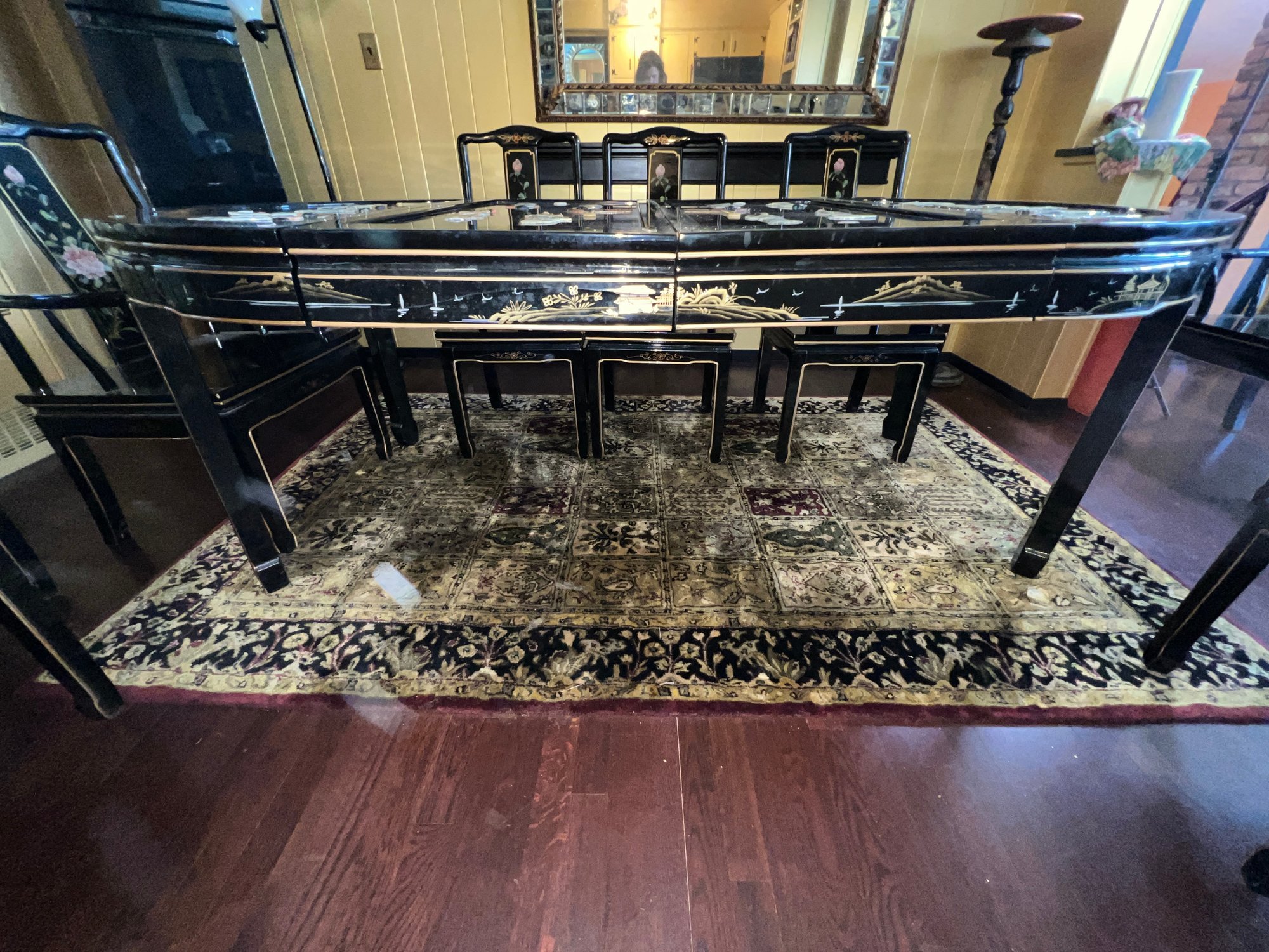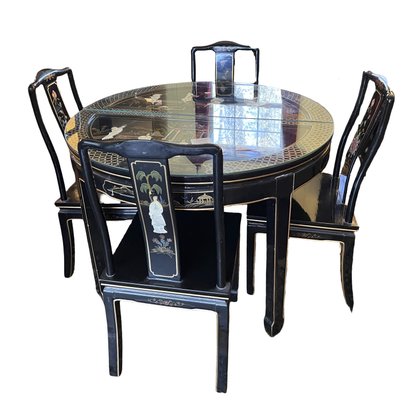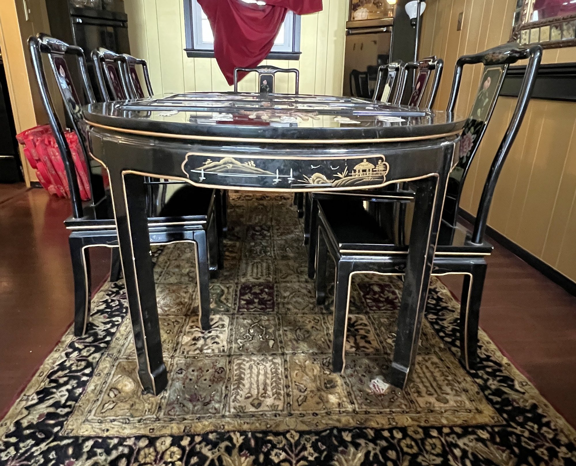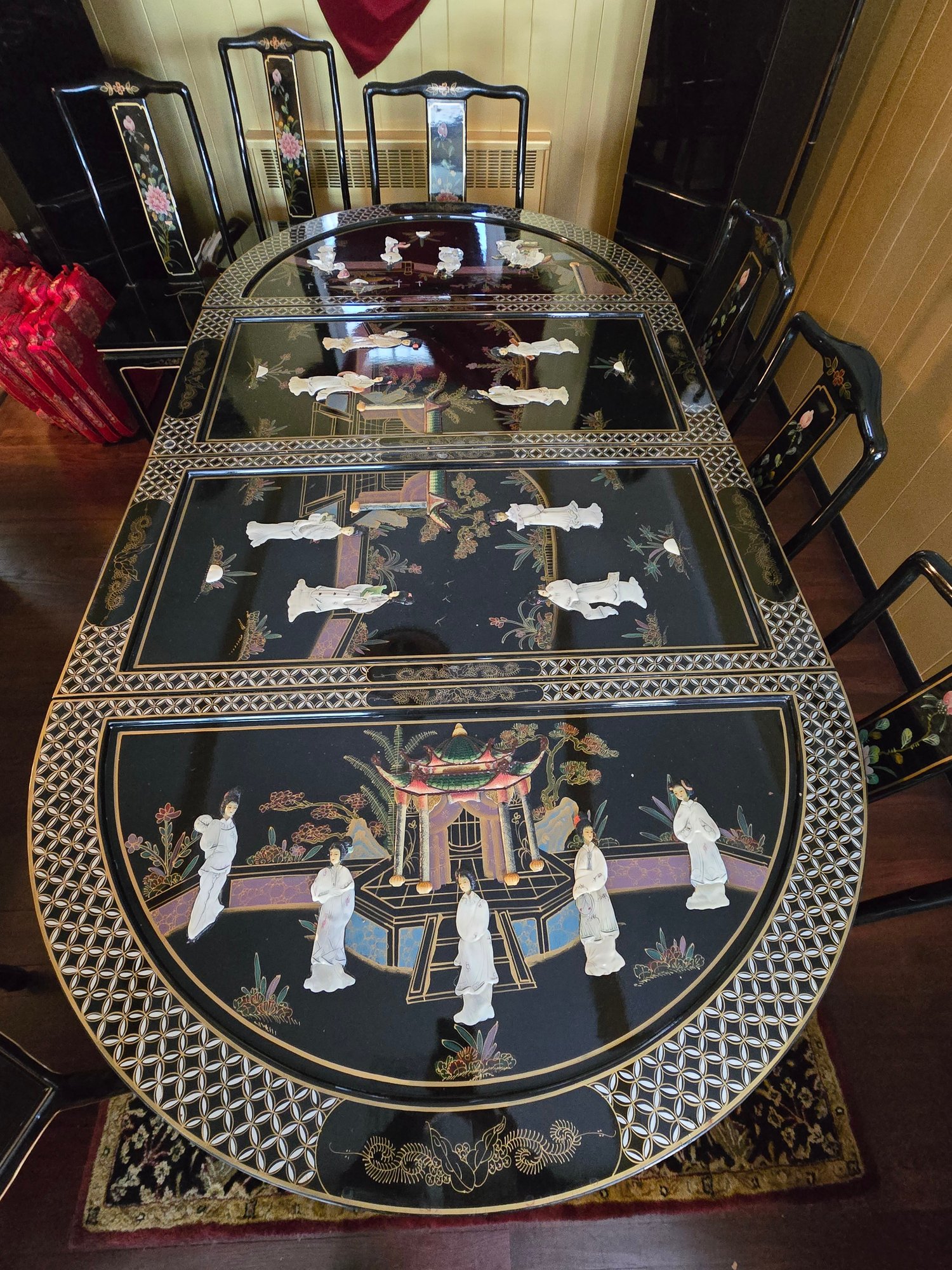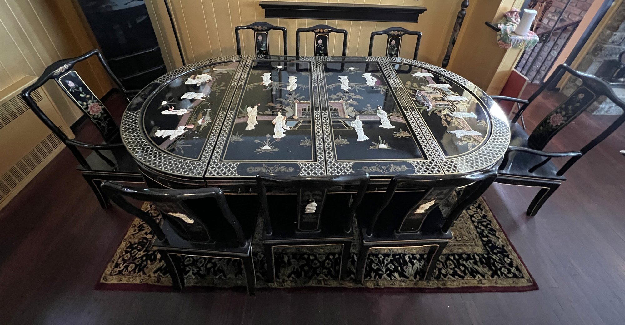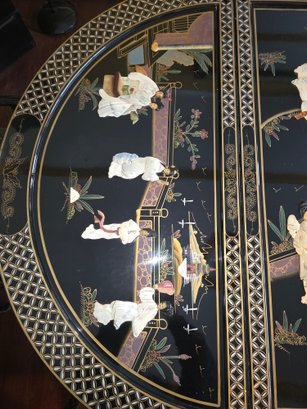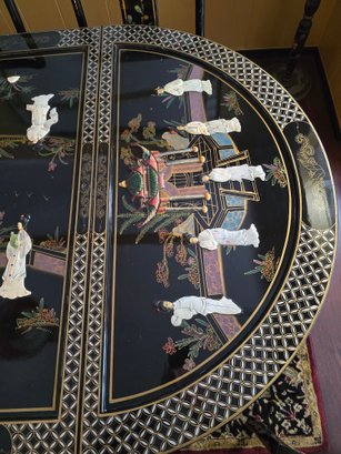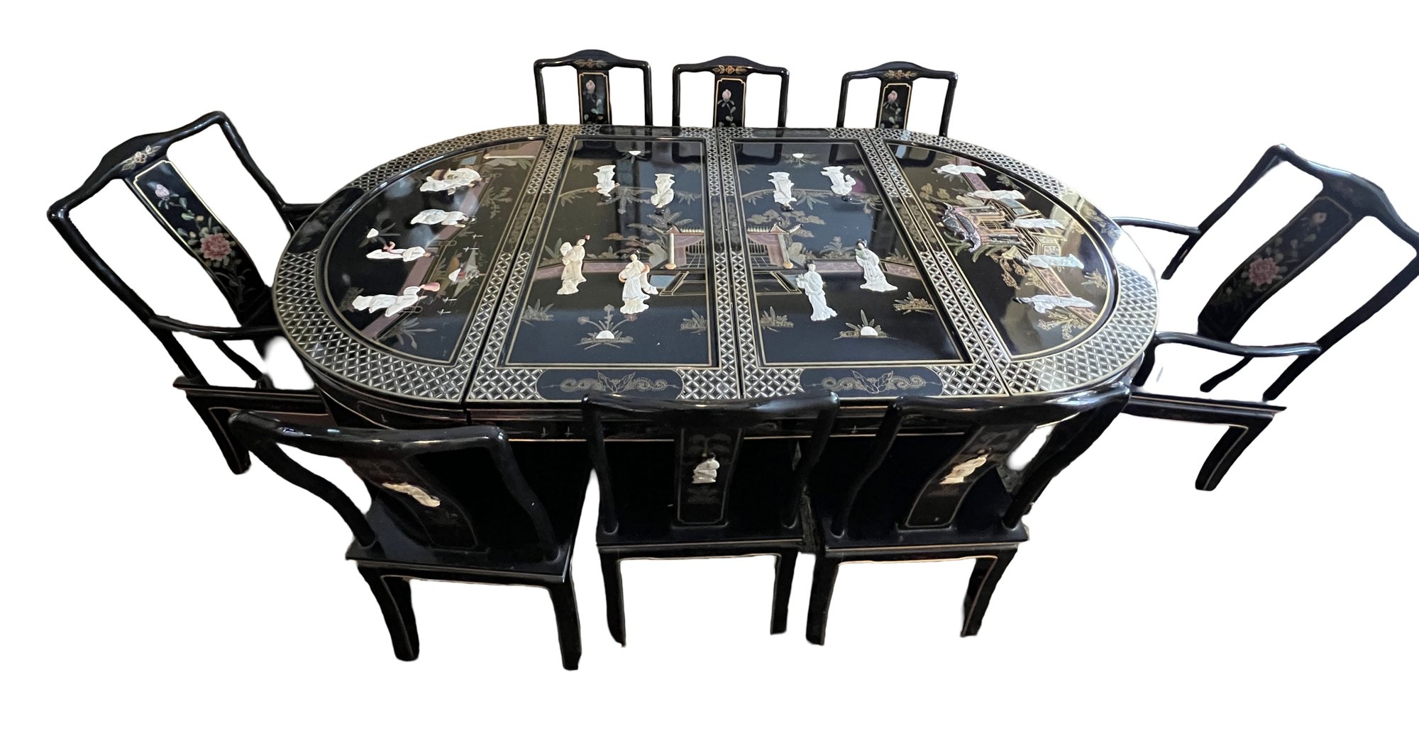 Vintage Chinese Black Lacquer Round /Oval Table featuring mother of pearl figures and painted scenes with hand-carved hardstones. Includes glass that fits each section. The table can have two leaves in for an oval or taken out to make round. Four pieces of custom protective glass. Eight chairs, two arm four armless and eight cushions. Chairs are very sturdy!