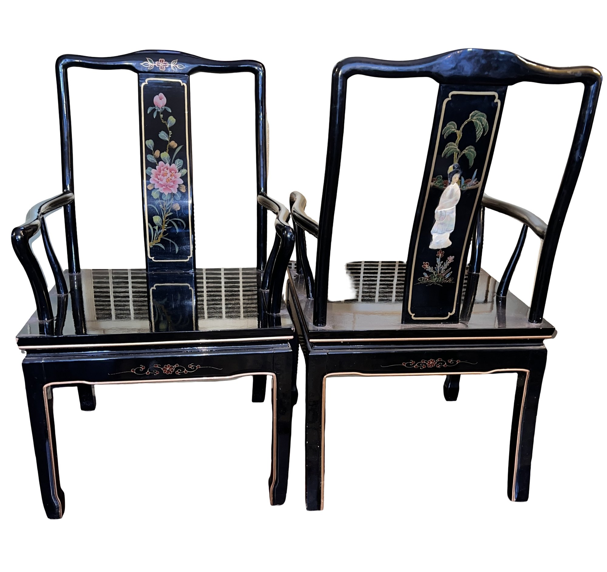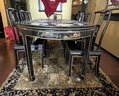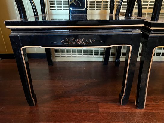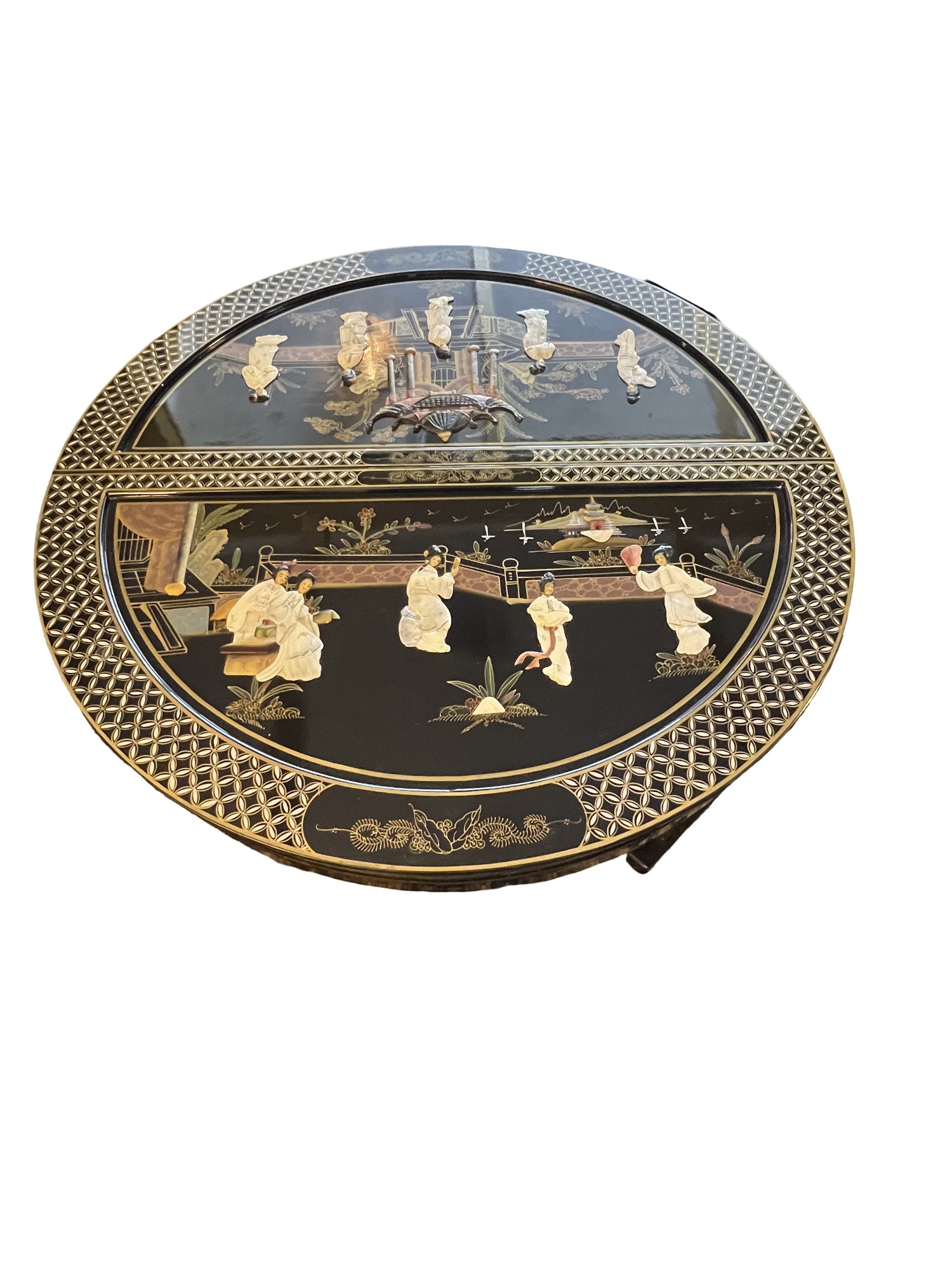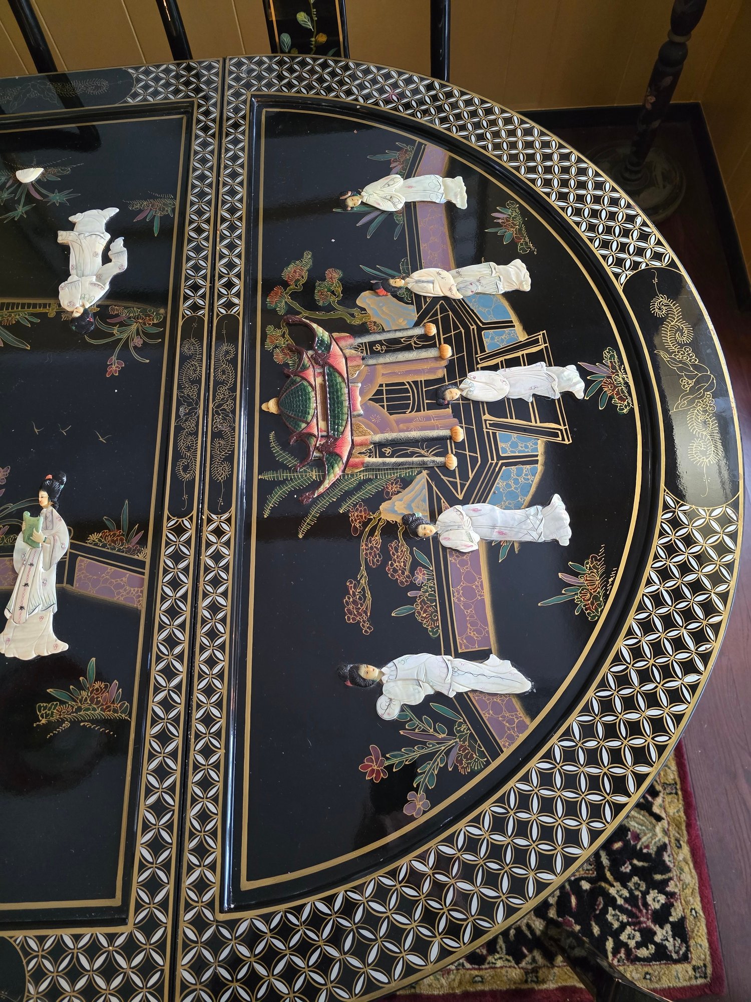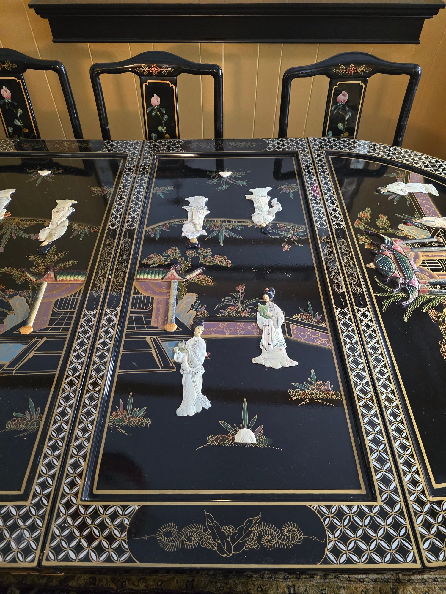 Vintage Chinese Black Lacquer Round /Oval Table featuring mother of pearl figures and painted scenes with hand-carved hardstones. Includes glass that fits each section. The table can have two leaves in for an oval or taken out to make round. Four pieces of custom protective glass. Eight chairs, two arm four armless and eight cushions. Chairs are very sturdy!