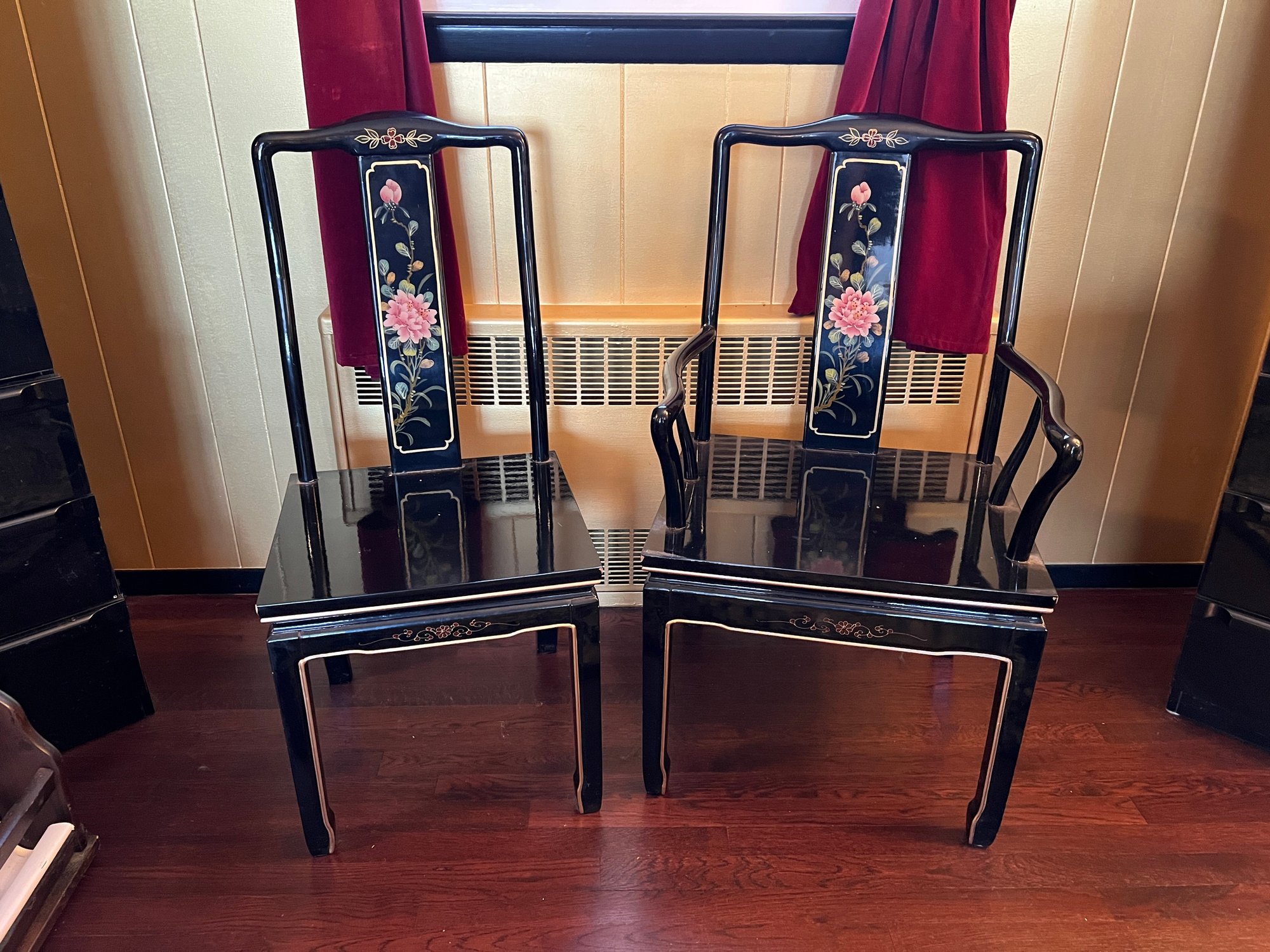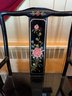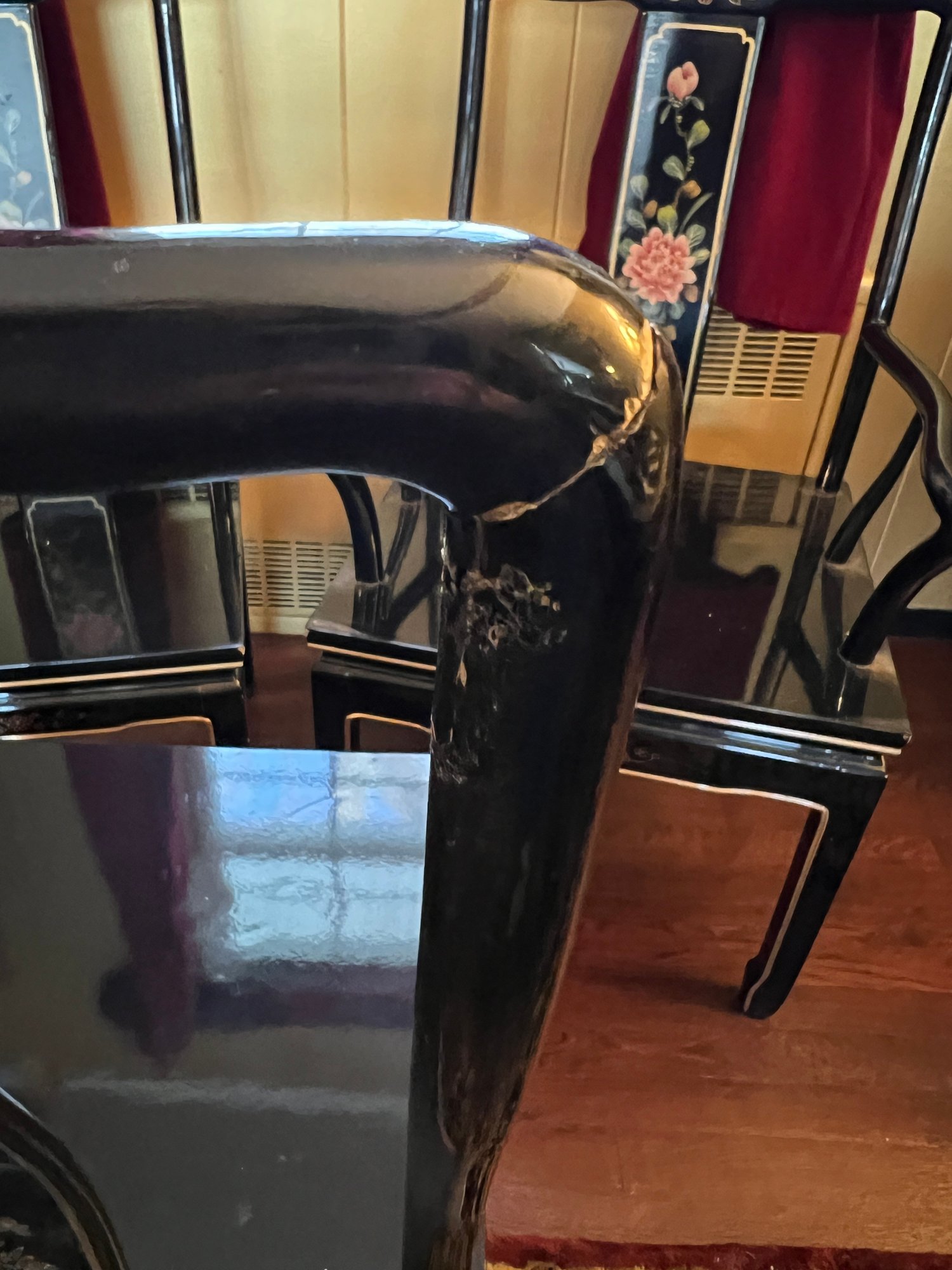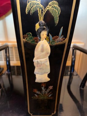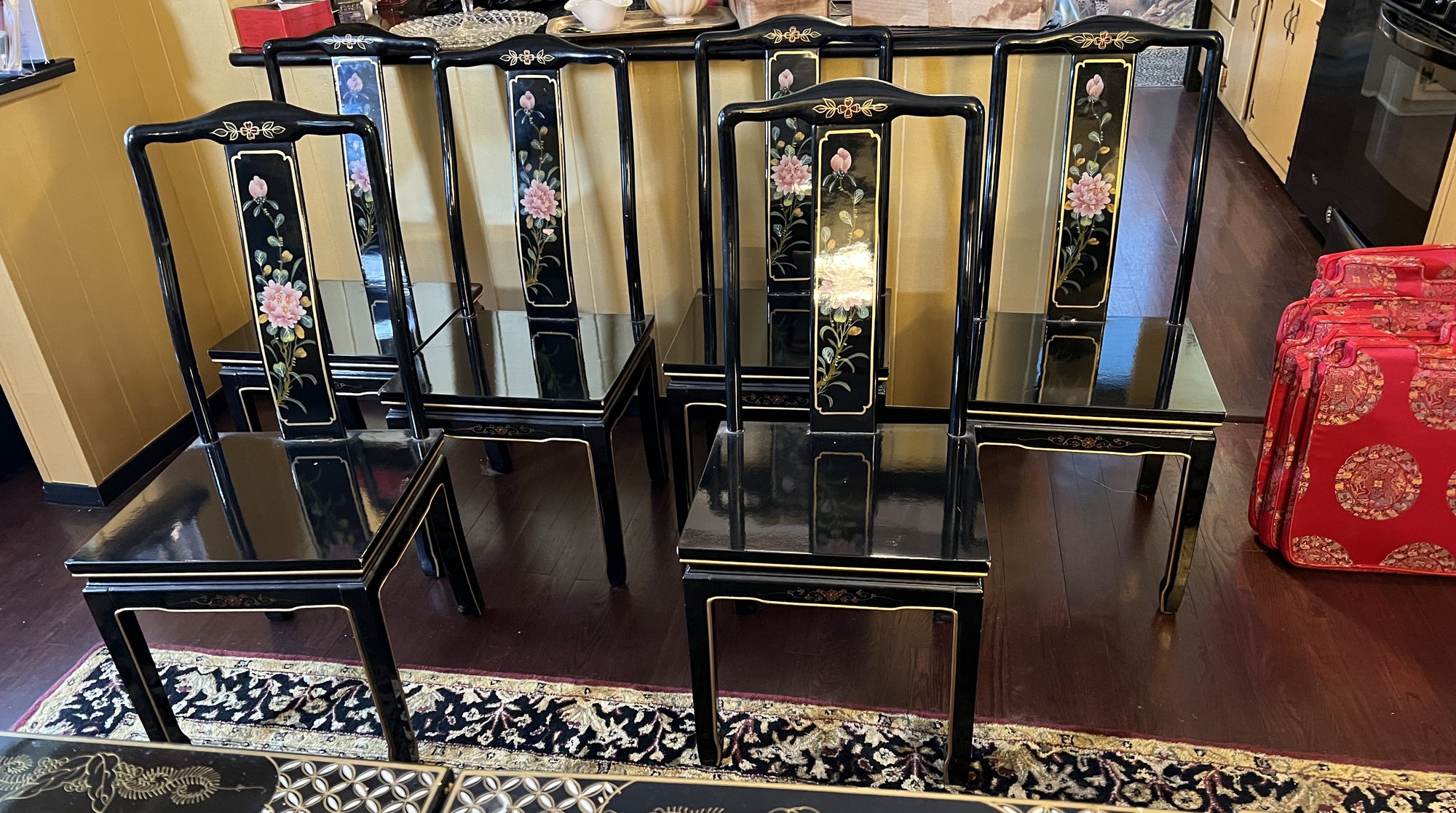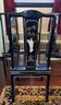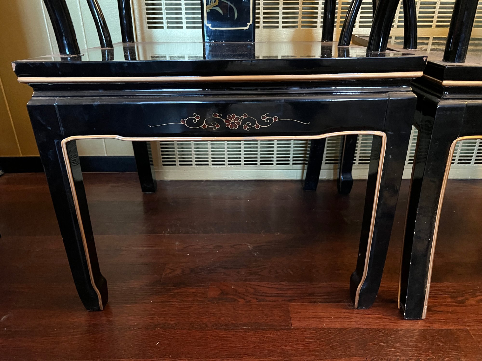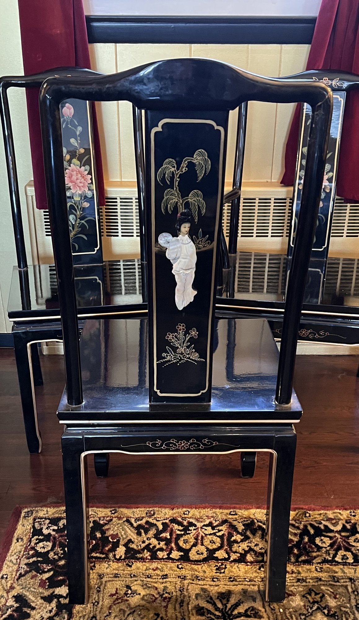 Vintage Chinese Black Lacquer Round /Oval Table featuring mother of pearl figures and painted scenes with hand-carved hardstones. Includes glass that fits each section. The table can have two leaves in for an oval or taken out to make round. Four pieces of custom protective glass. Eight chairs, two arm four armless and eight cushions. Chairs are very sturdy!