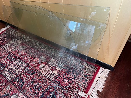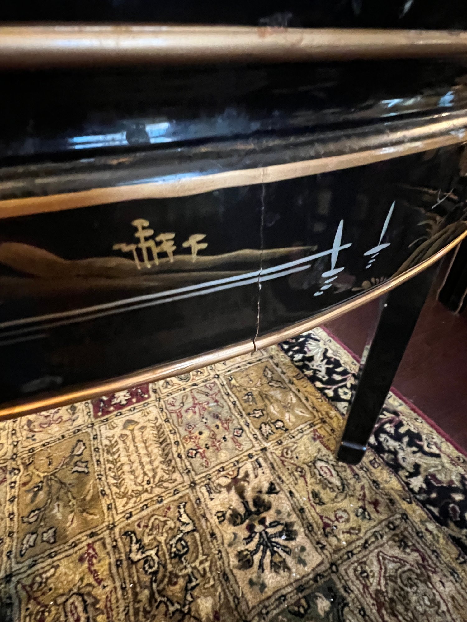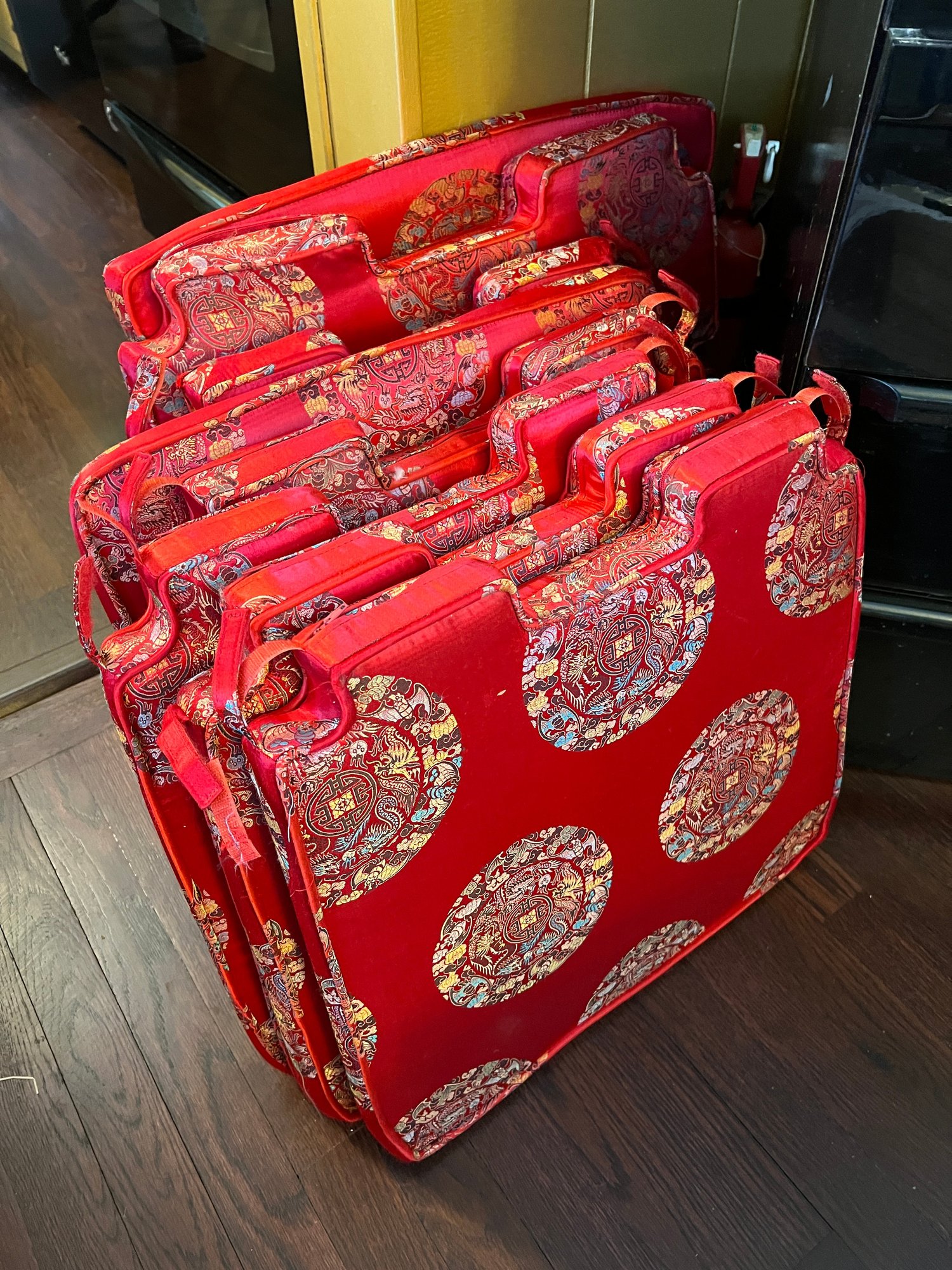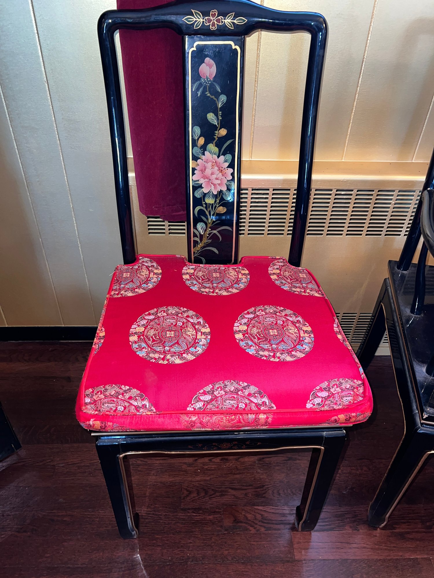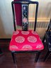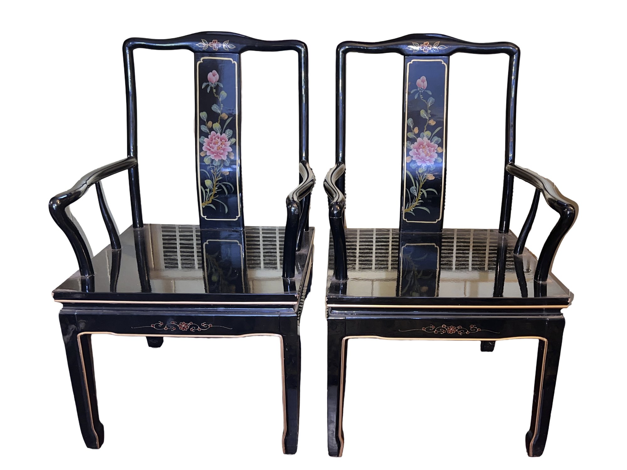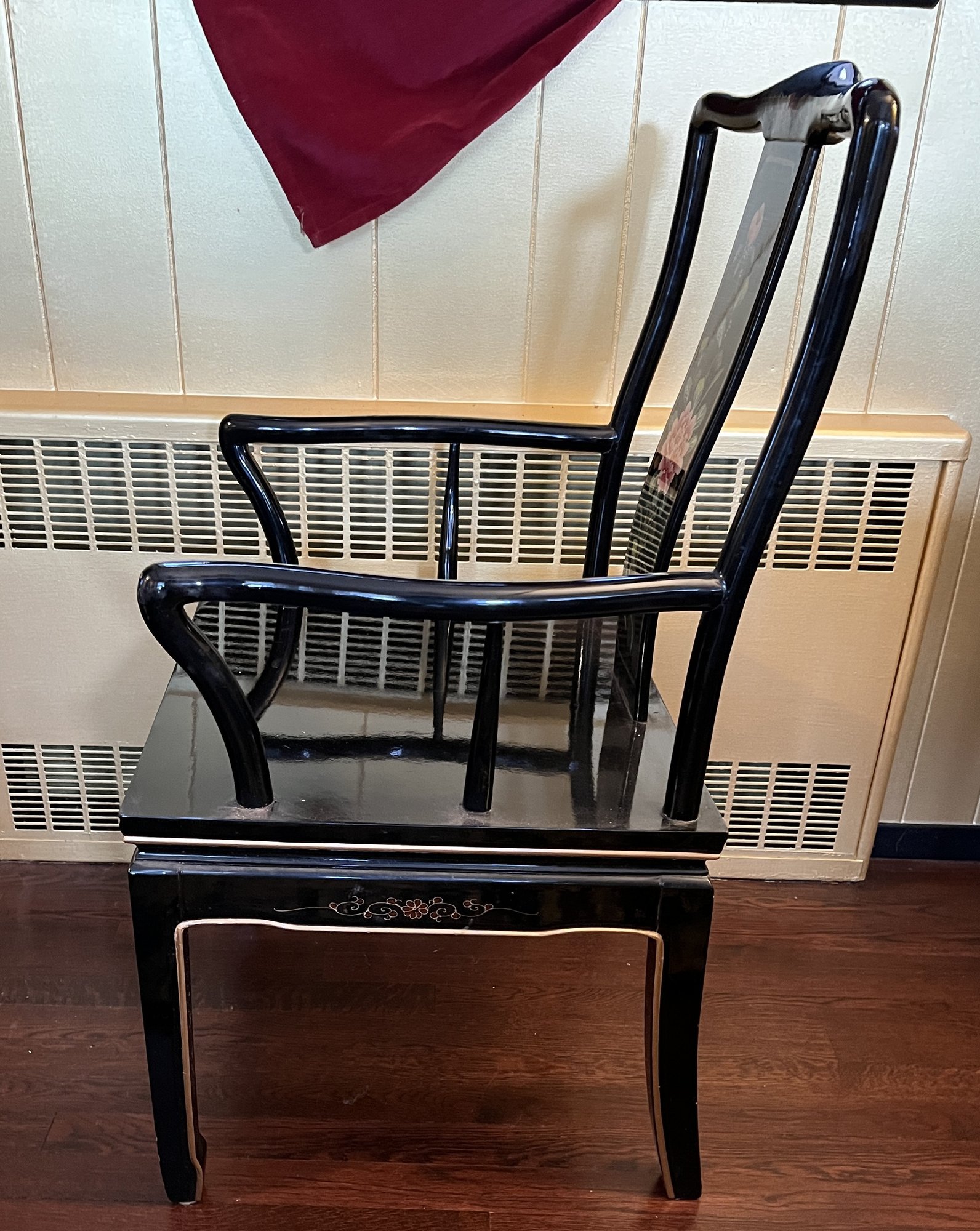 Vintage Chinese Black Lacquer Round /Oval Table featuring mother of pearl figures and painted scenes with hand-carved hardstones. Includes glass that fits each section. The table can have two leaves in for an oval or taken out to make round. Four pieces of custom protective glass. Eight chairs, two arm four armless and eight cushions. Chairs are very sturdy!