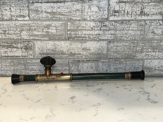 18"L - Chinese opium pipe, soapstone or could be Jade with metal accents.