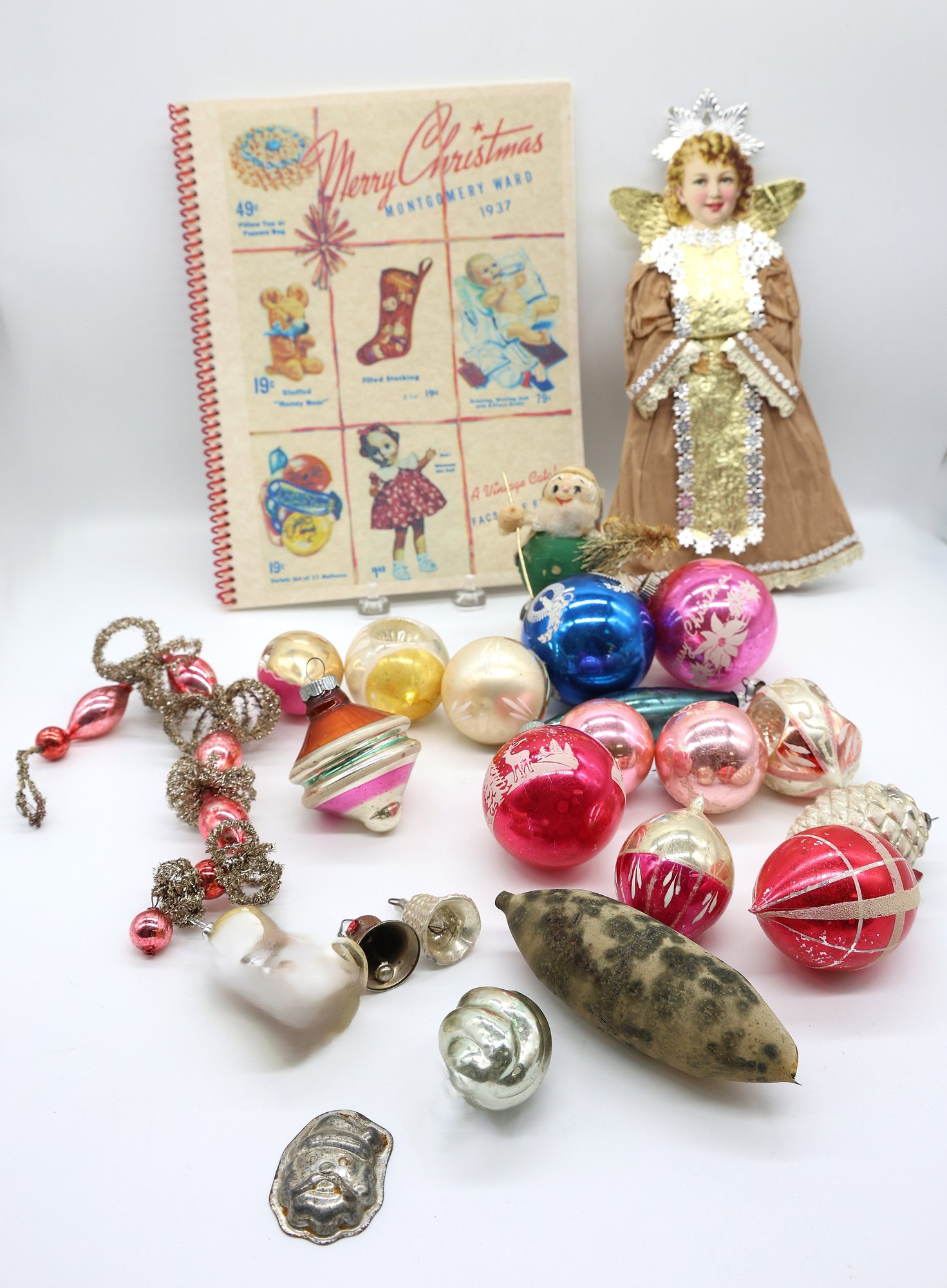 Vintage ornaments, vintage paper angel and fun facsimile of 1937 Christmas catalog