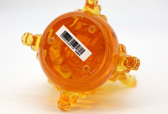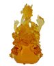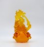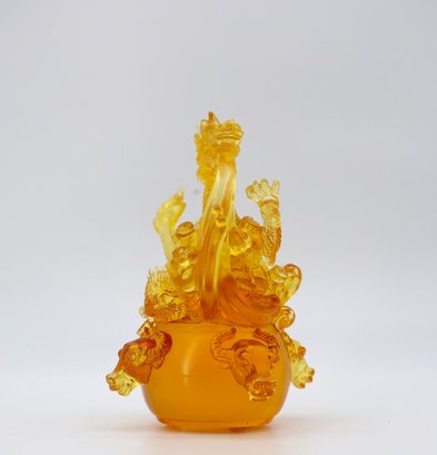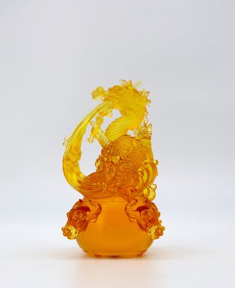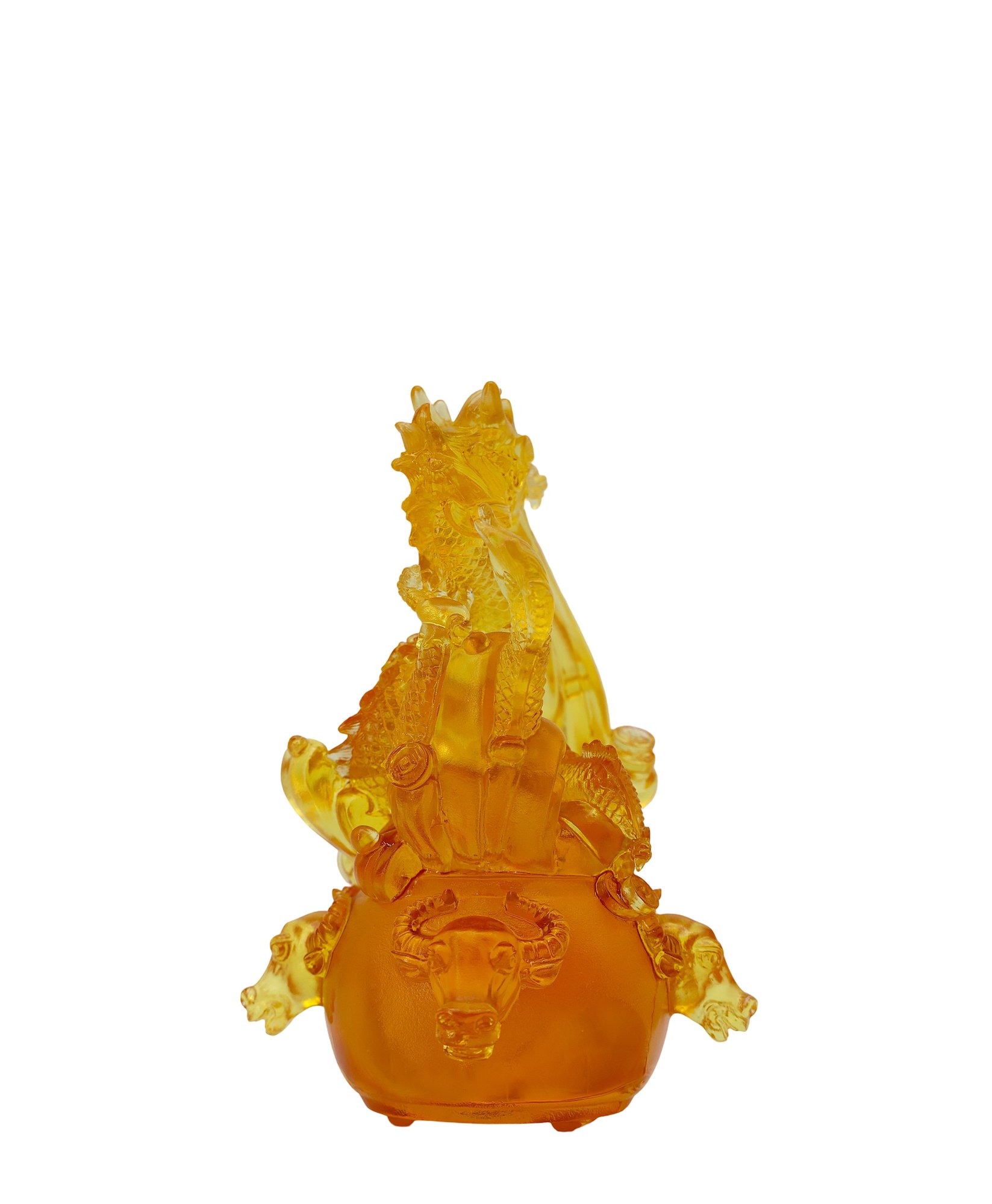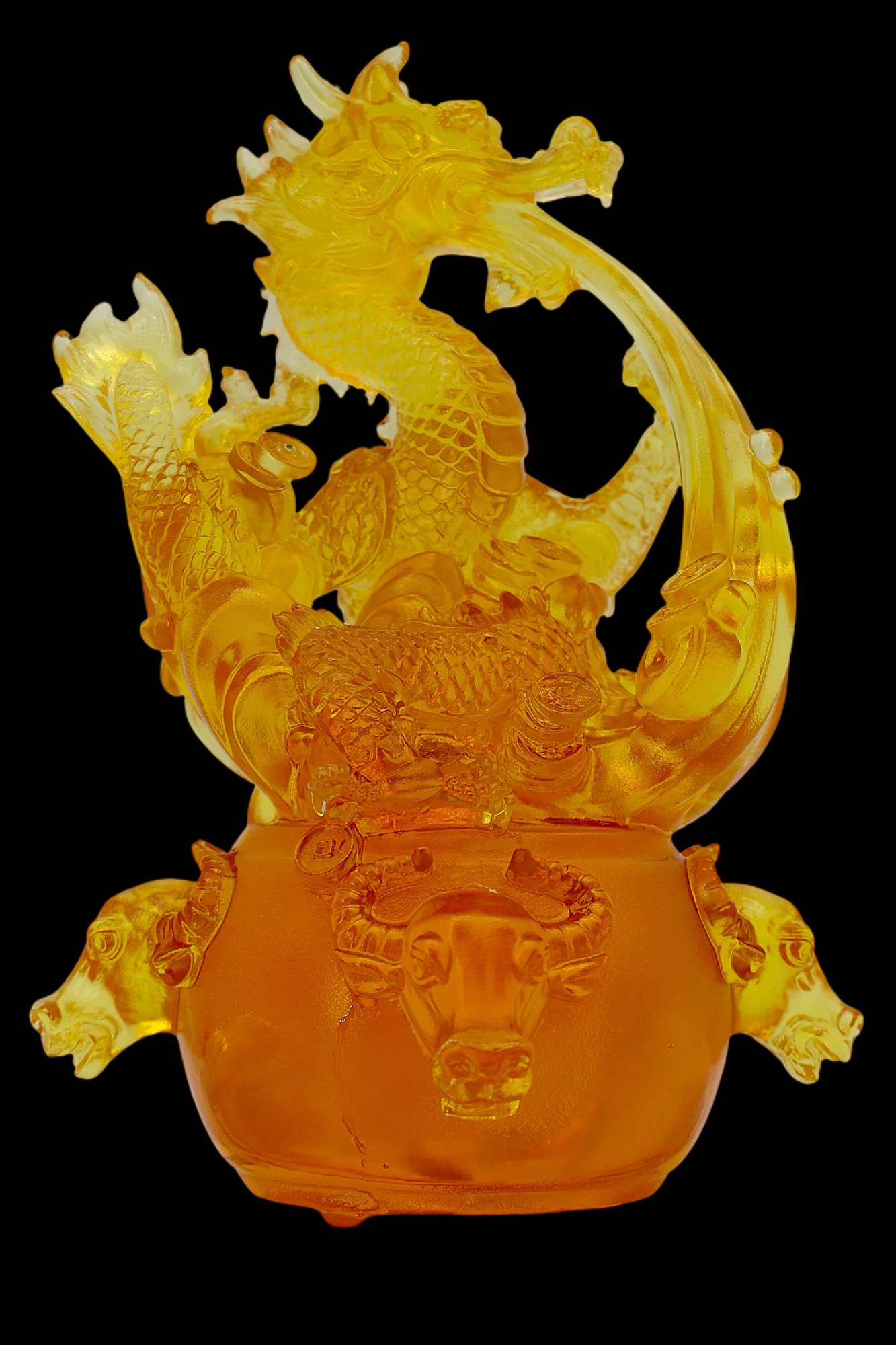 Chinese Feng Shui in the style of Liu Li, crystal dragon and wealth pot statue, crafted from colored glass for home decor to attract prosperity and positive energy. Signed at the bottom.