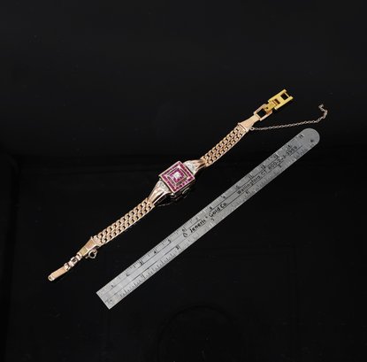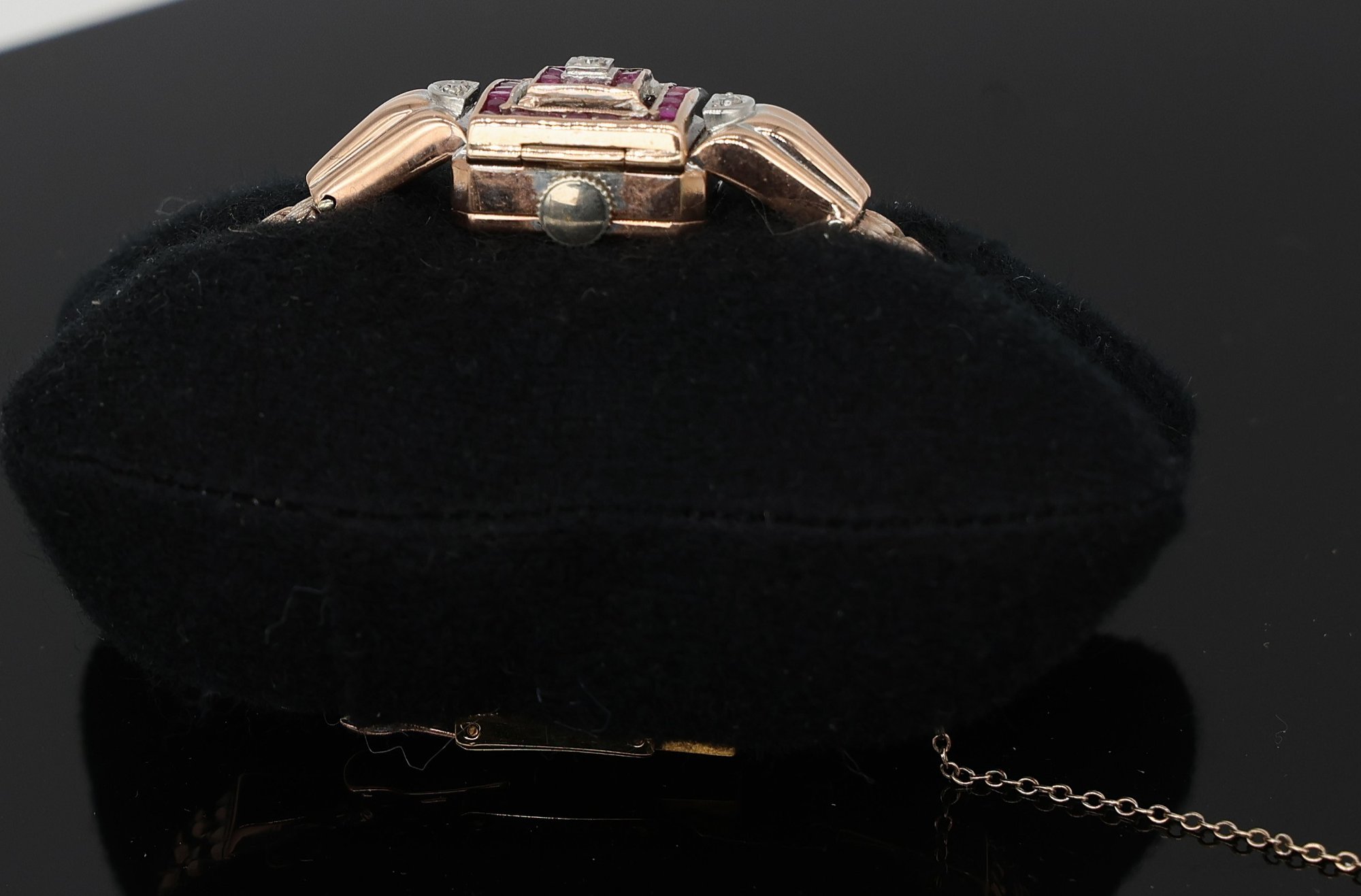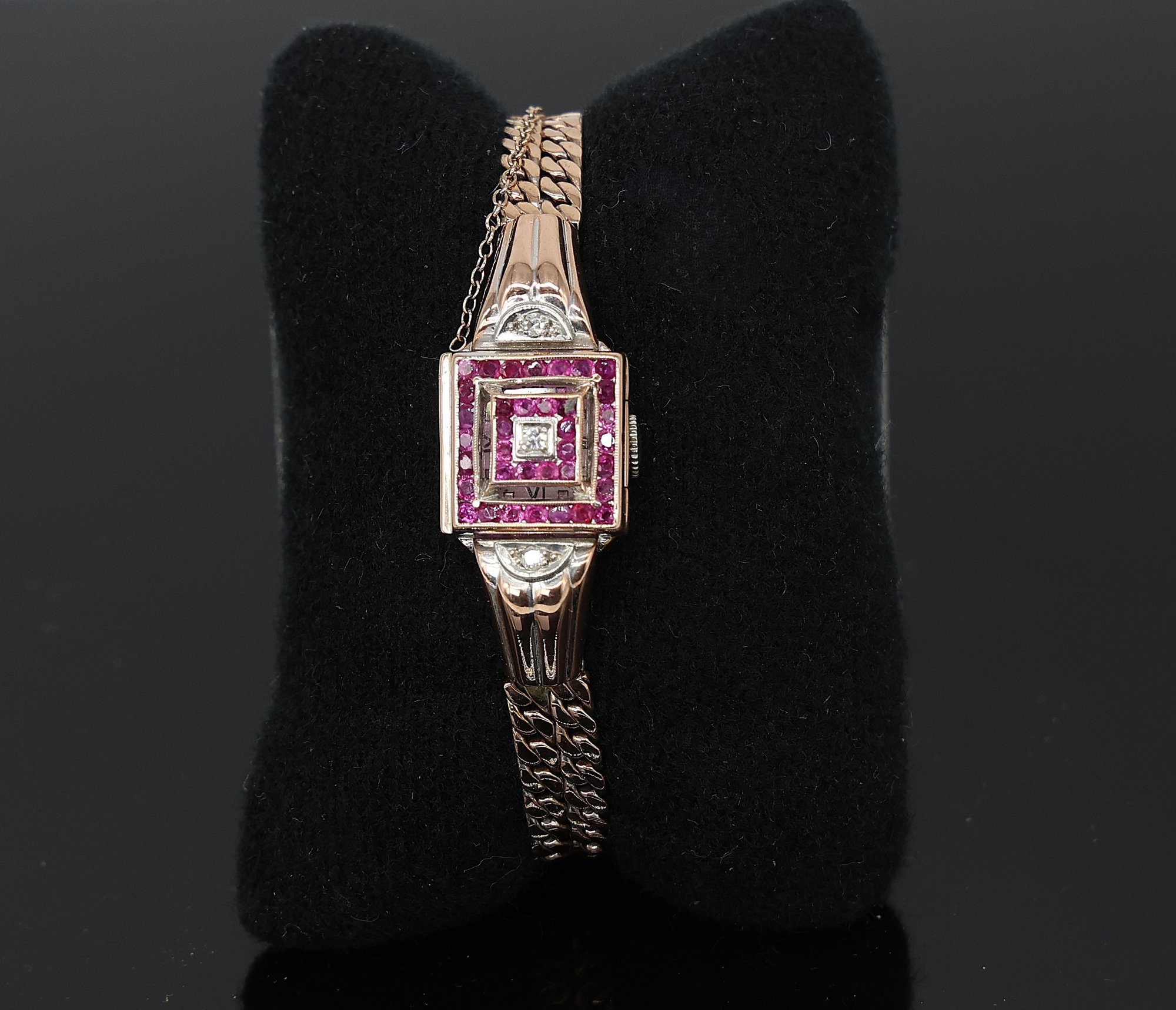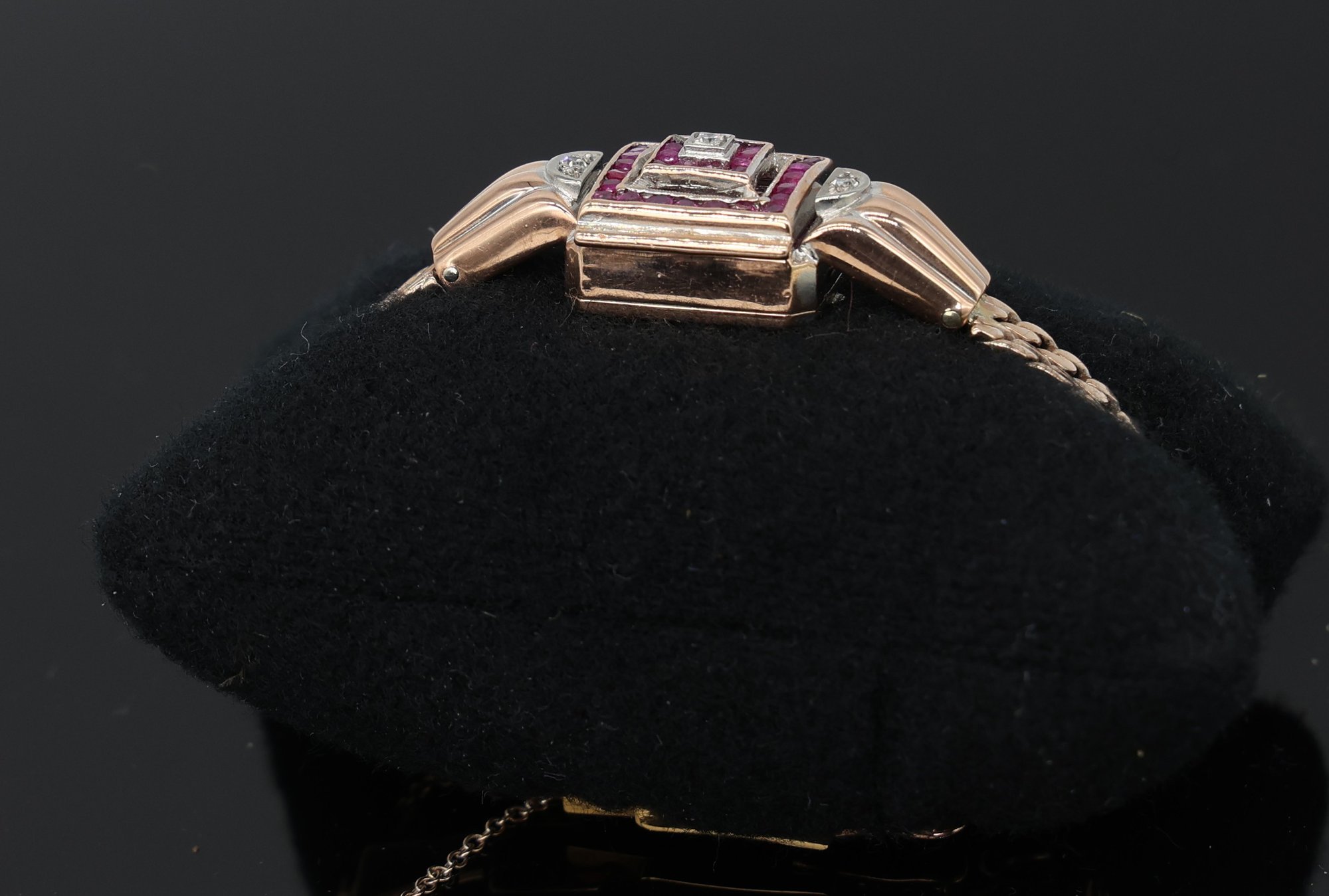 Rubies & diamonds on Rose gold watch adorned with diamonds and Ruby's, a flip top face of the watch, allowing for this to be stylized as a bracelet. Maunal dial.