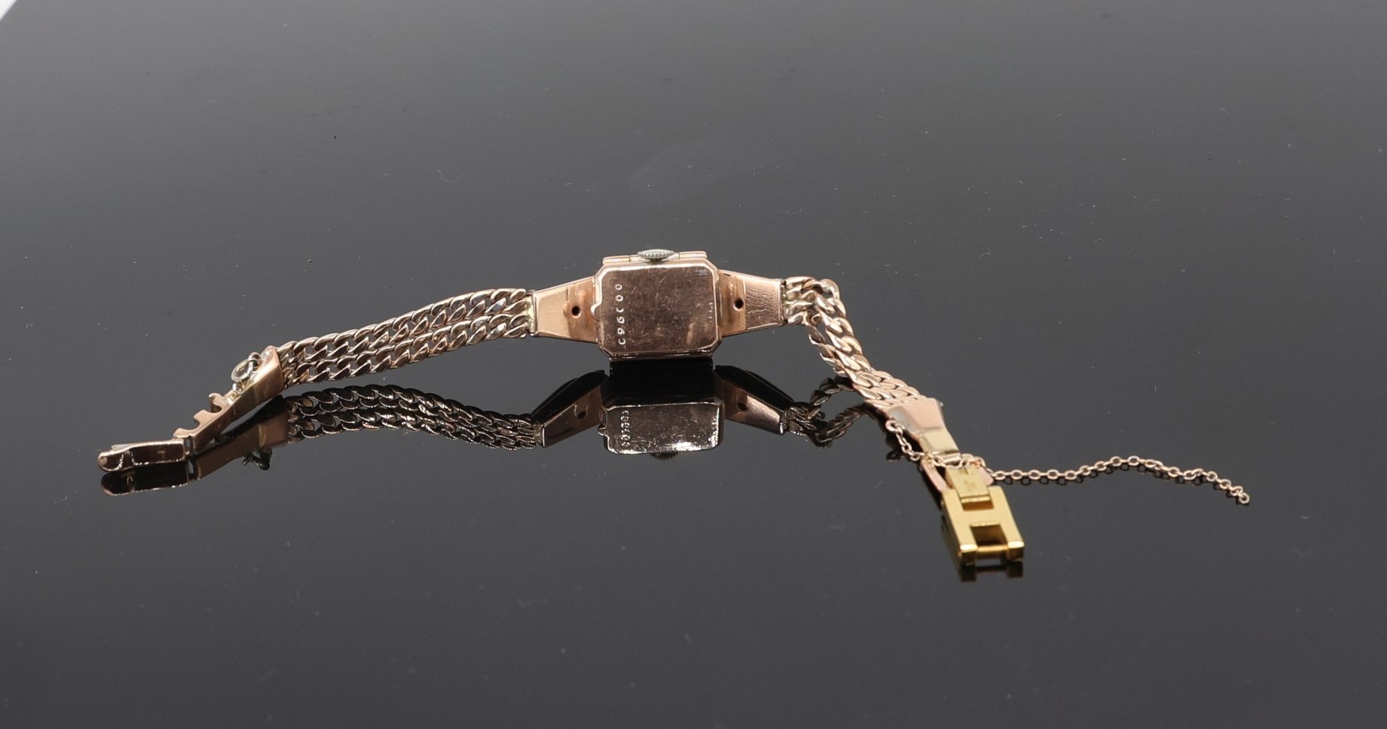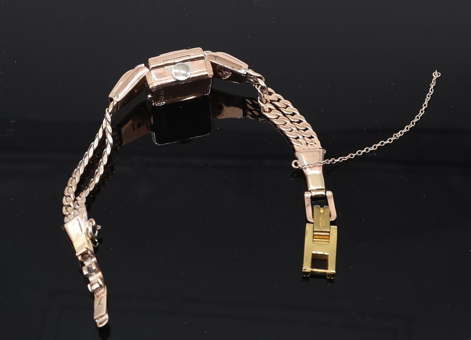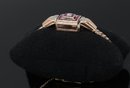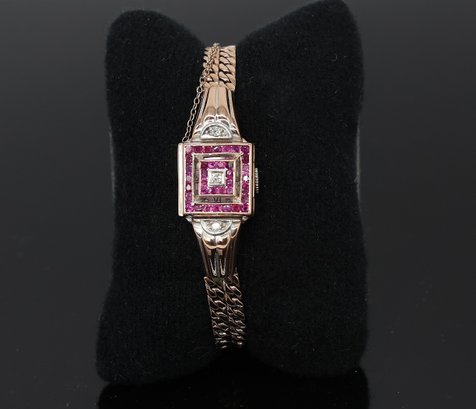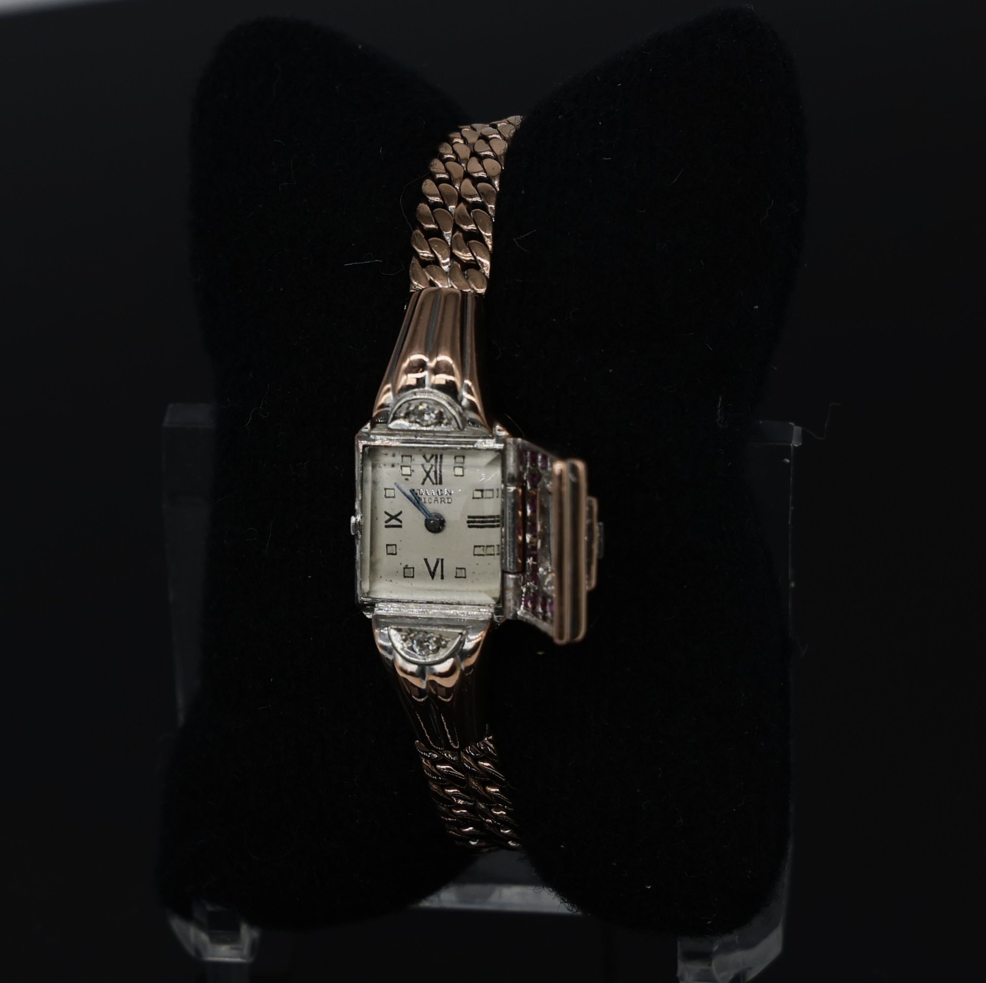 Rubies & diamonds on Rose gold watch adorned with diamonds and Ruby's, a flip top face of the watch, allowing for this to be stylized as a bracelet. Maunal dial.
