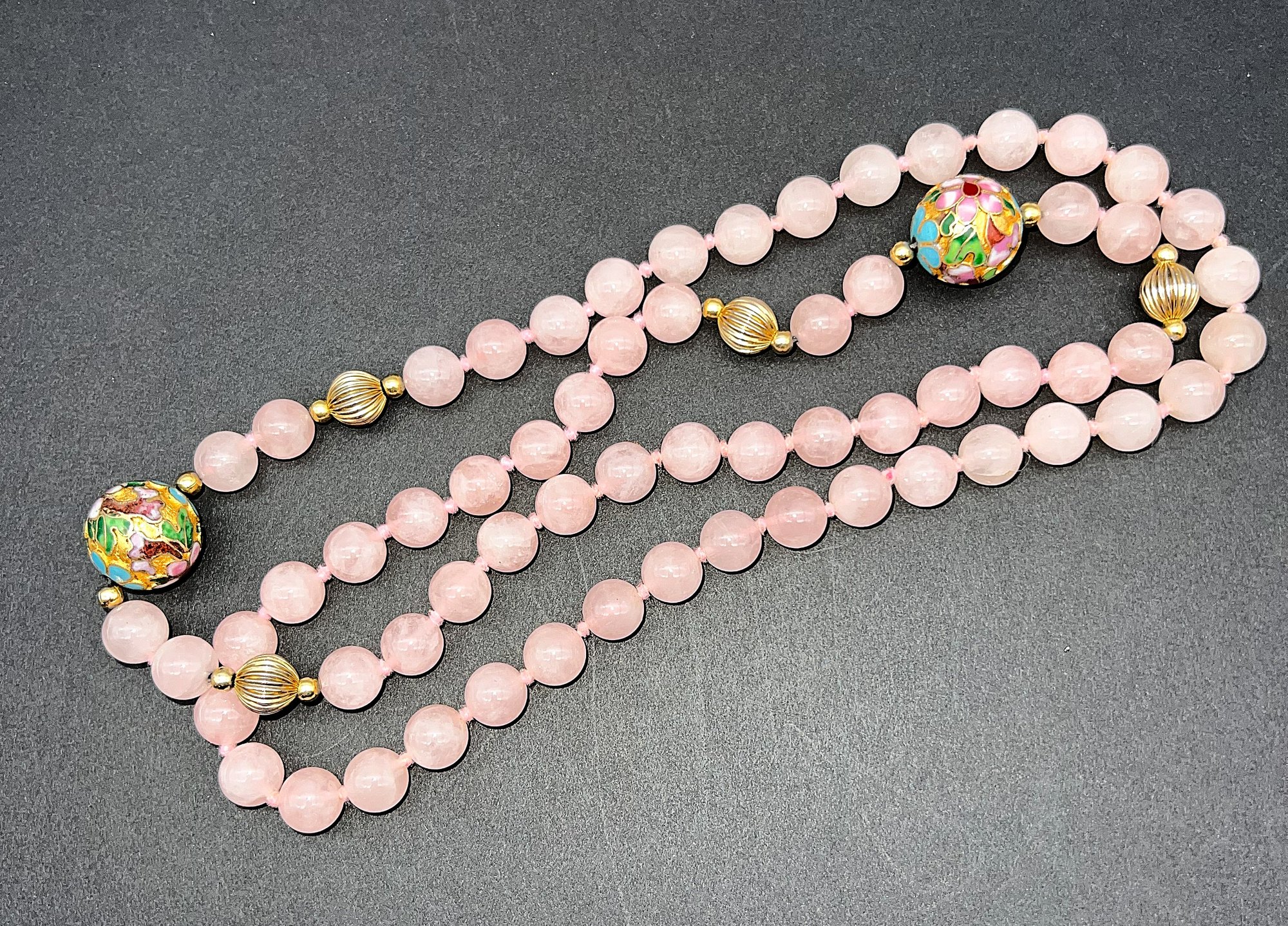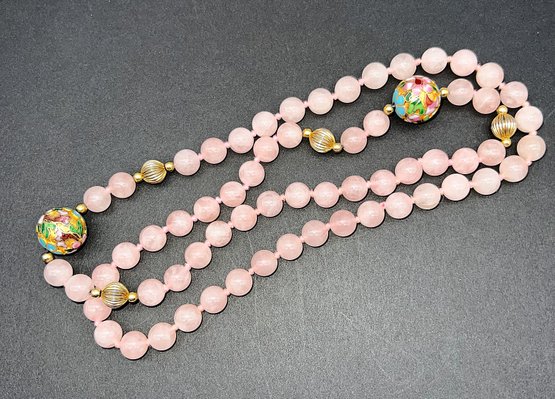 This necklace is made up of pink rose quartz and large cloisonne beads Individually knotted - 32" total length . Goes over your head , no clasp.