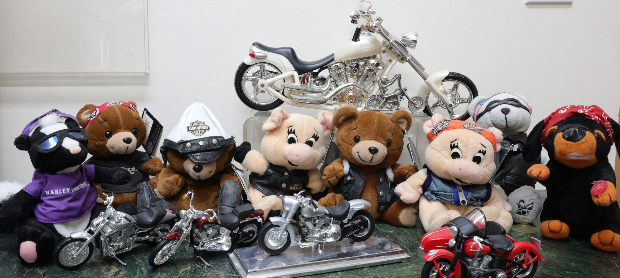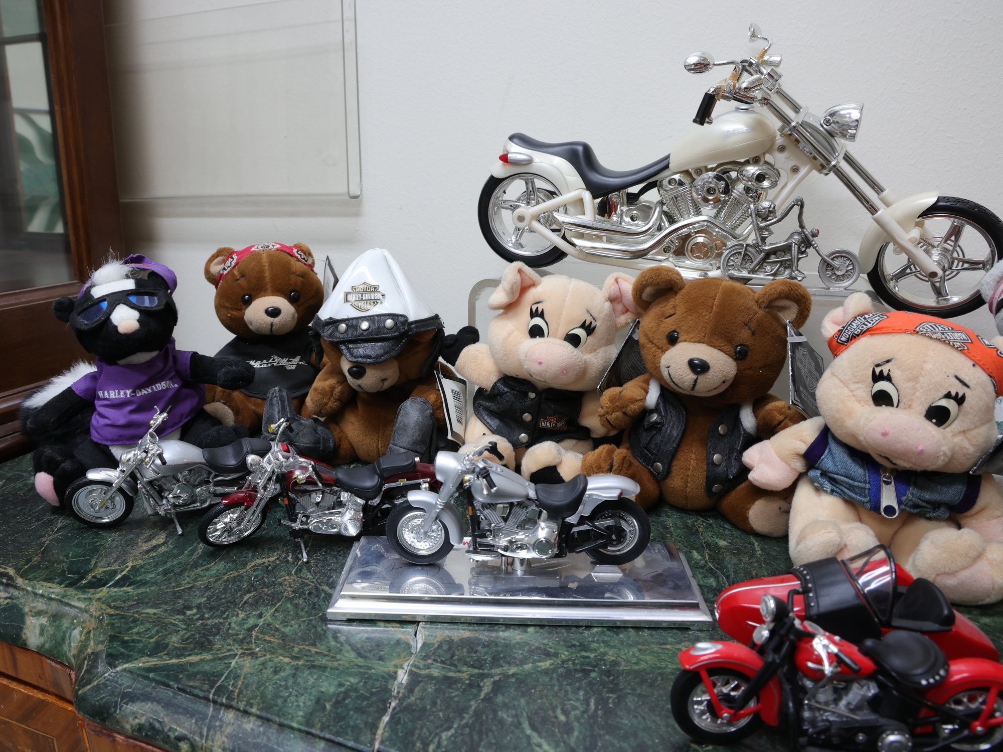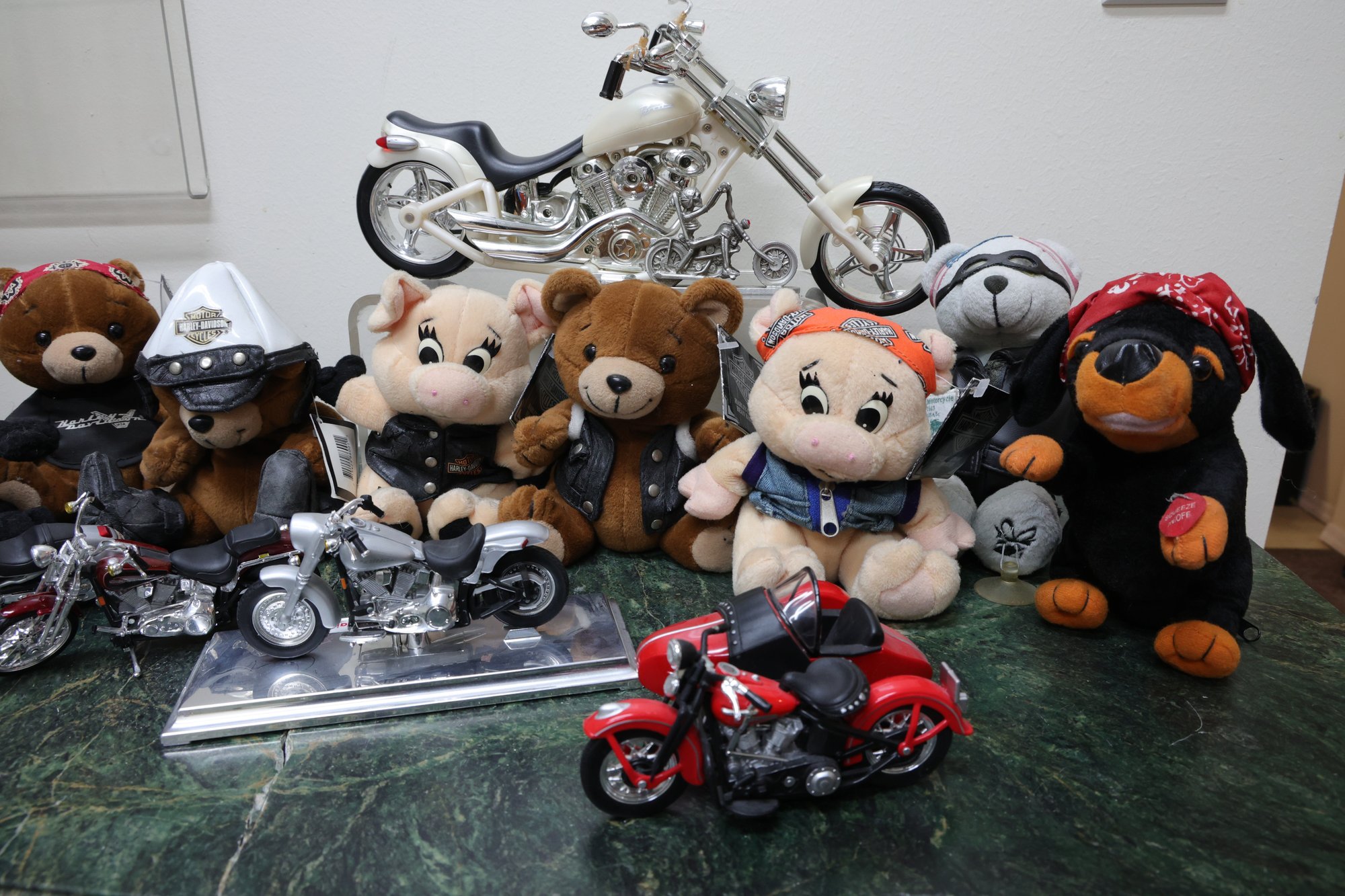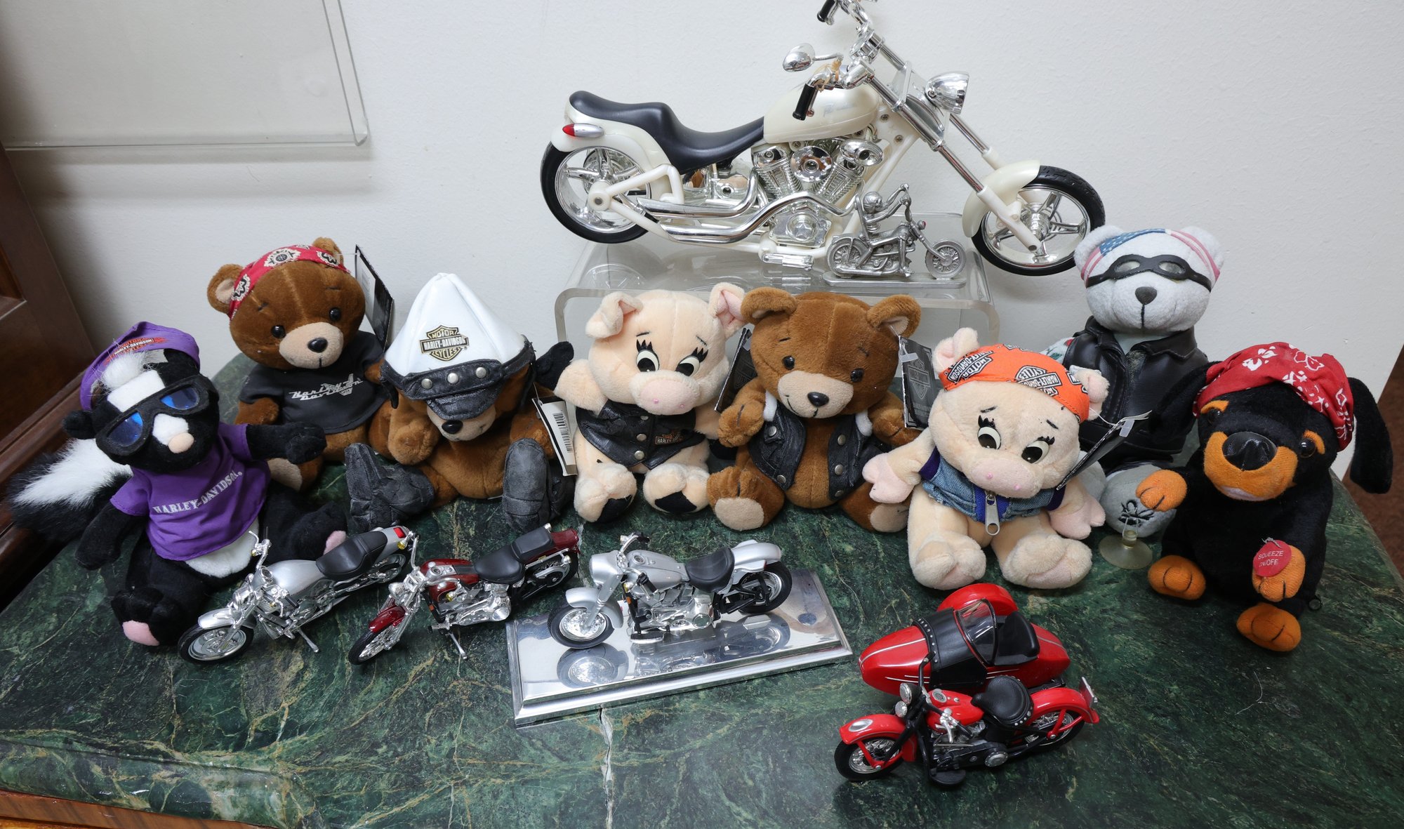 A collection of officially licensed eight Harley-Davidson plush animals and six toy motorcycles.Sizes - 3"L to 13.5"