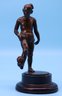 Vintage Japanese Gilt Bronze Figurine Of A Ball Player displayed on a wooden pedestal . Figure balancing a ball on 1 foot with arms by sides, traditional cloth garb. Has a unique tattooing on upper leg.