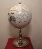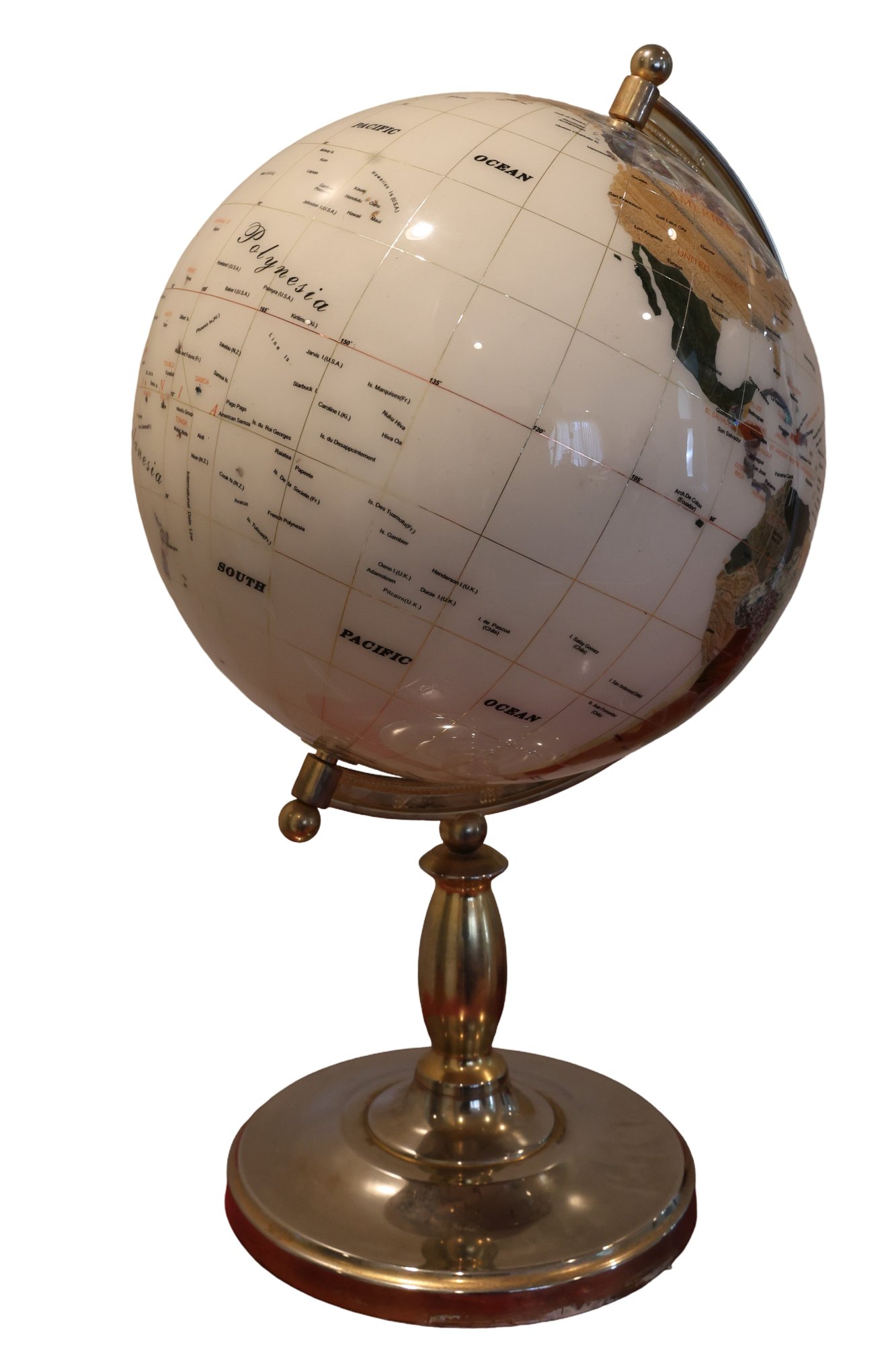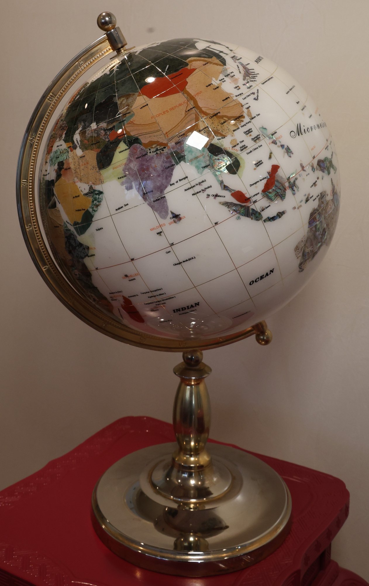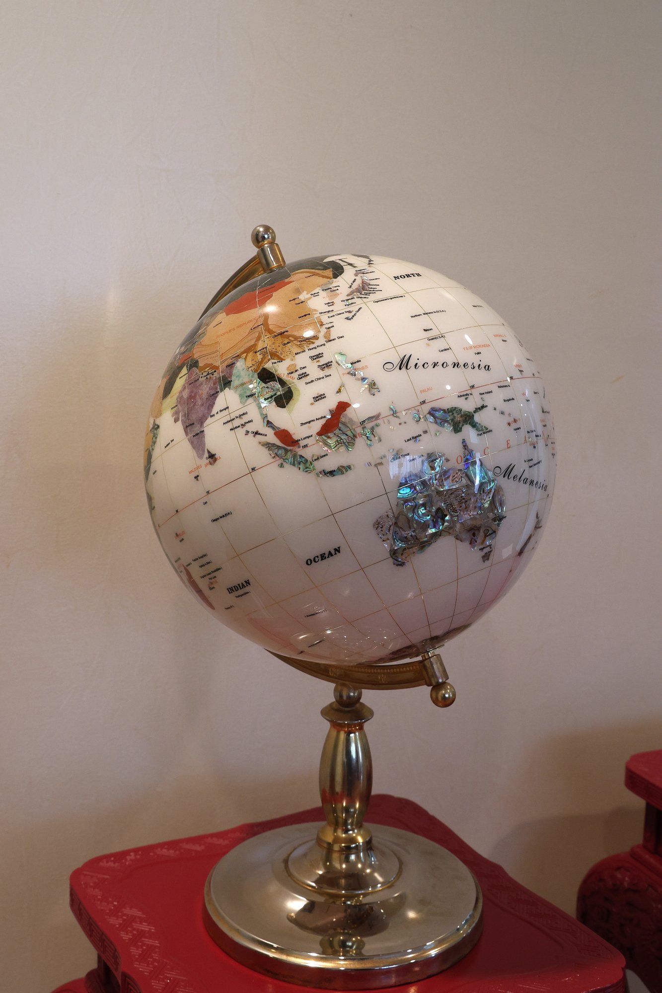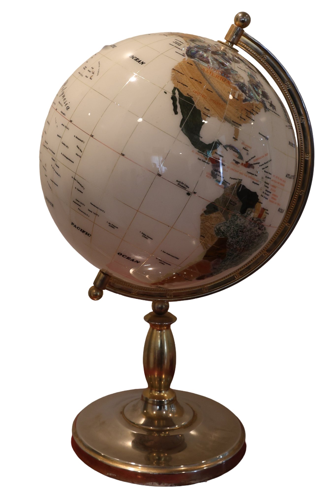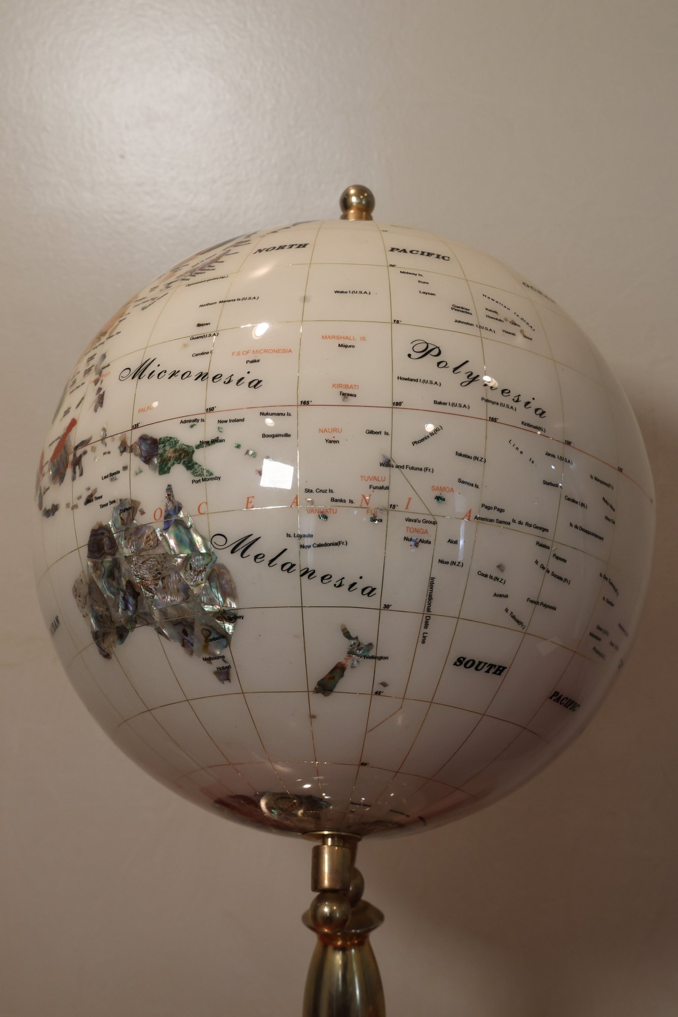handcrafted tabletop globe featuring continents inlaid with various semi precious gemstones. Such as Lapis, Abalone, AMETHYST, and jade.