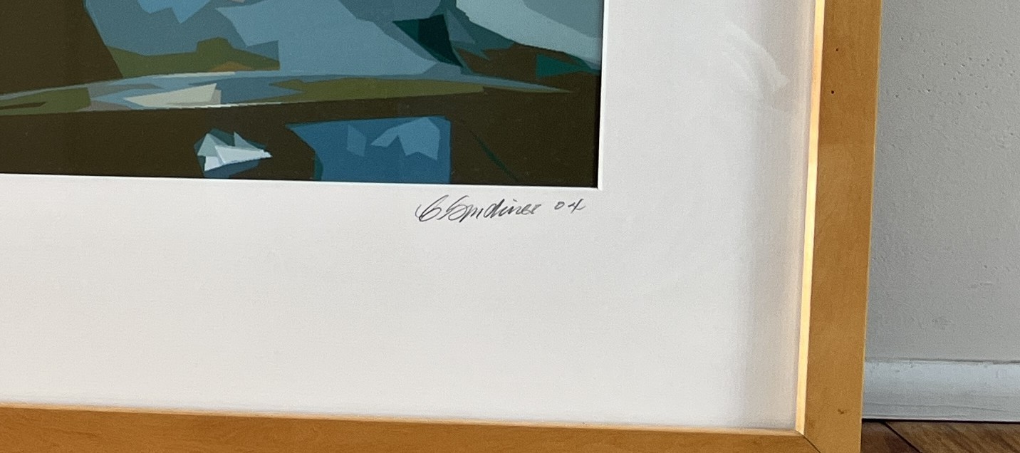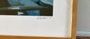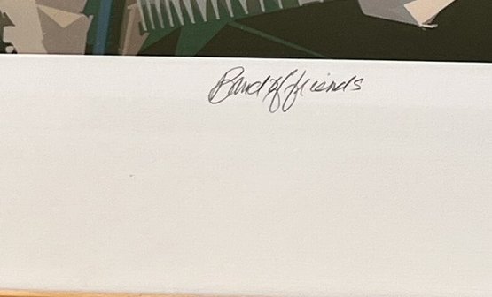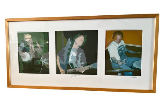 Fun framed triptych of a stylized lithograph depicting musicians playing instruments. The musician on banjo, center on electric guitar, and another on drums. Signed lower right and dated 2004. Framed dimensions are 20.5 inches by 42.5 inches. Each picture measures 12 inches by 12 inches.