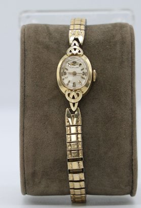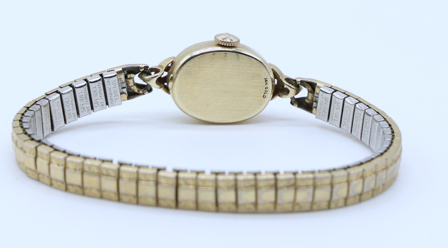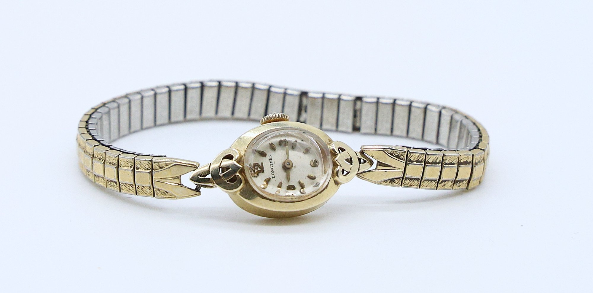Vintage Longines 14k yellow gold face, marked on back with expandable gold toned wristband.