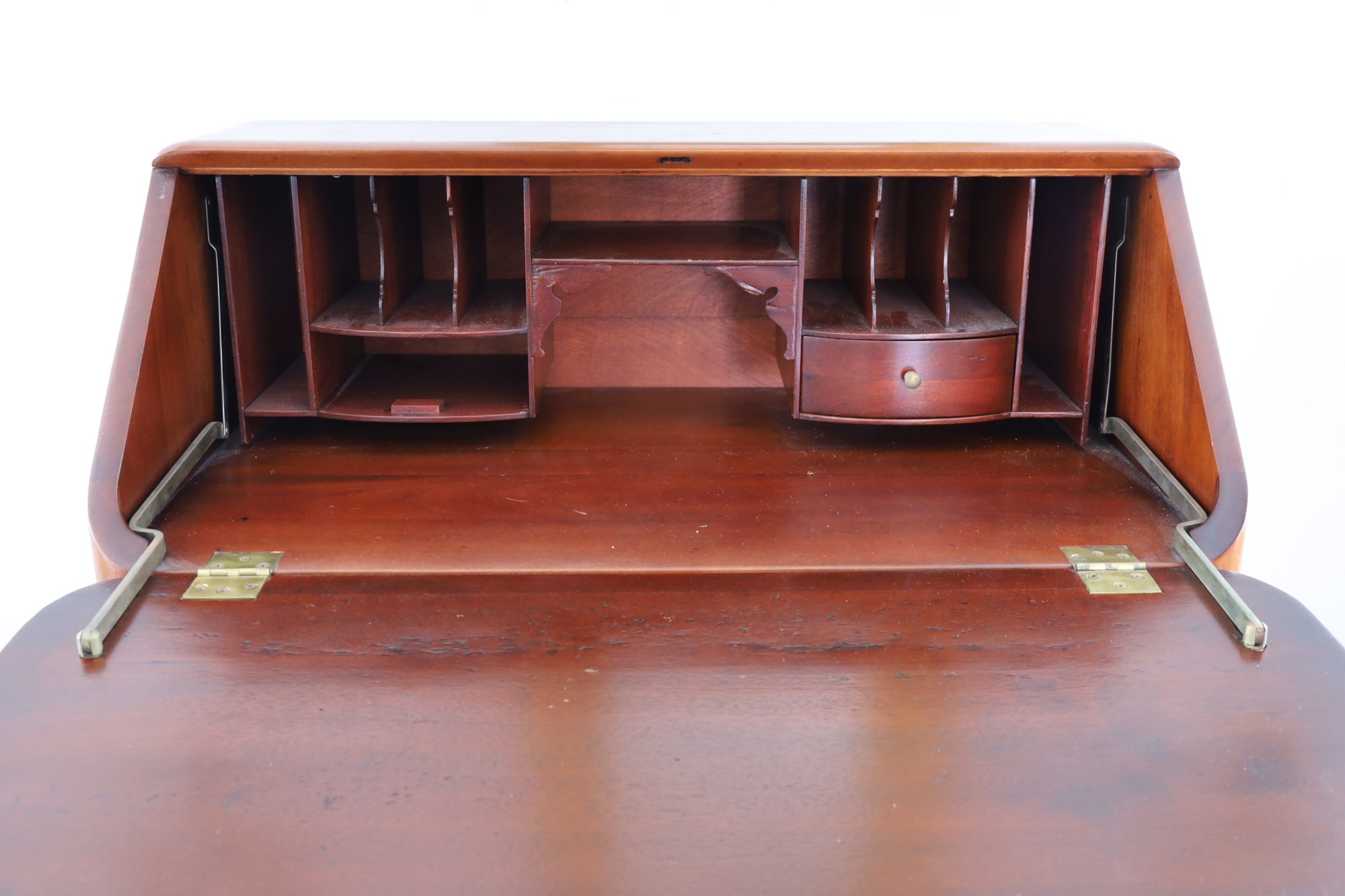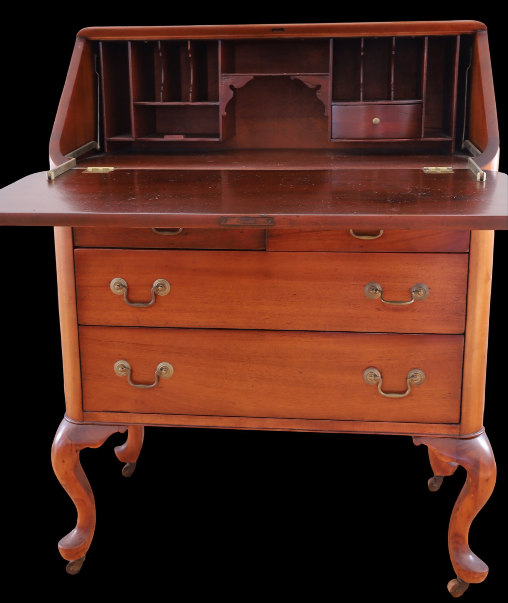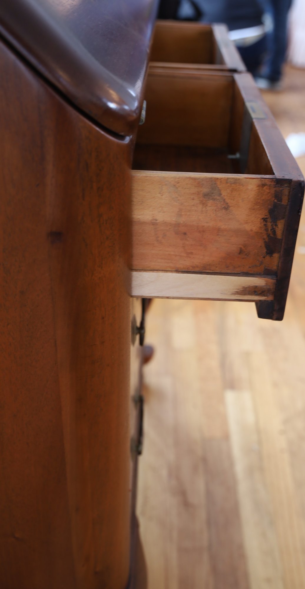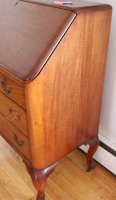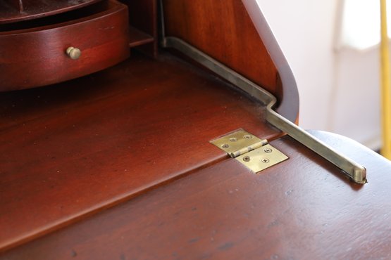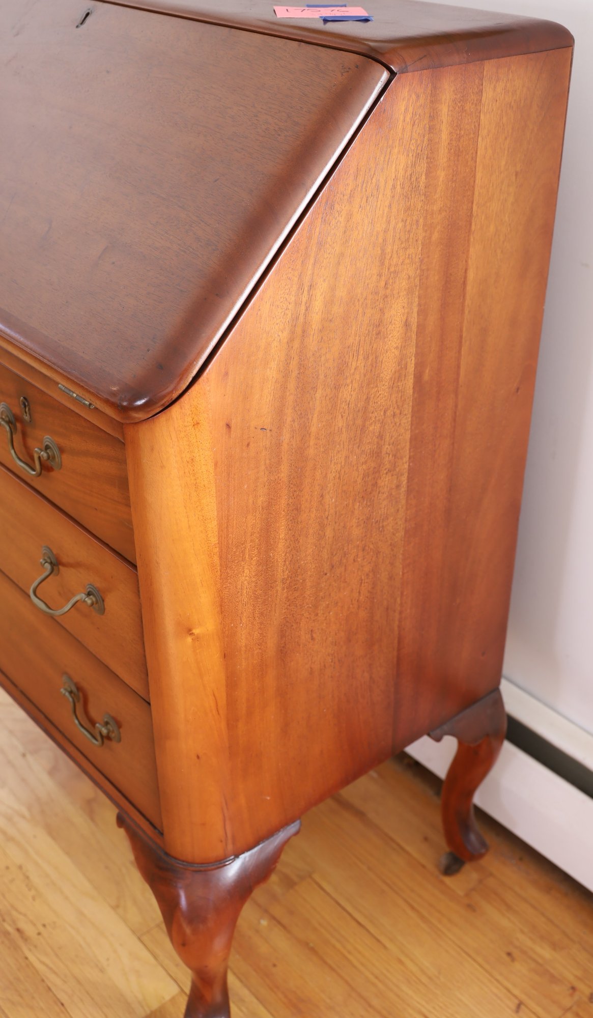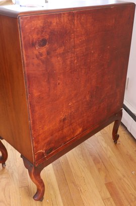 The item is in good condition but is missing an interior drawer and the keys. It has four lower drawers, each with brass handles, and showcases high-quality construction. Dimensions: 30"W x 17.25"D x 39.75"H.