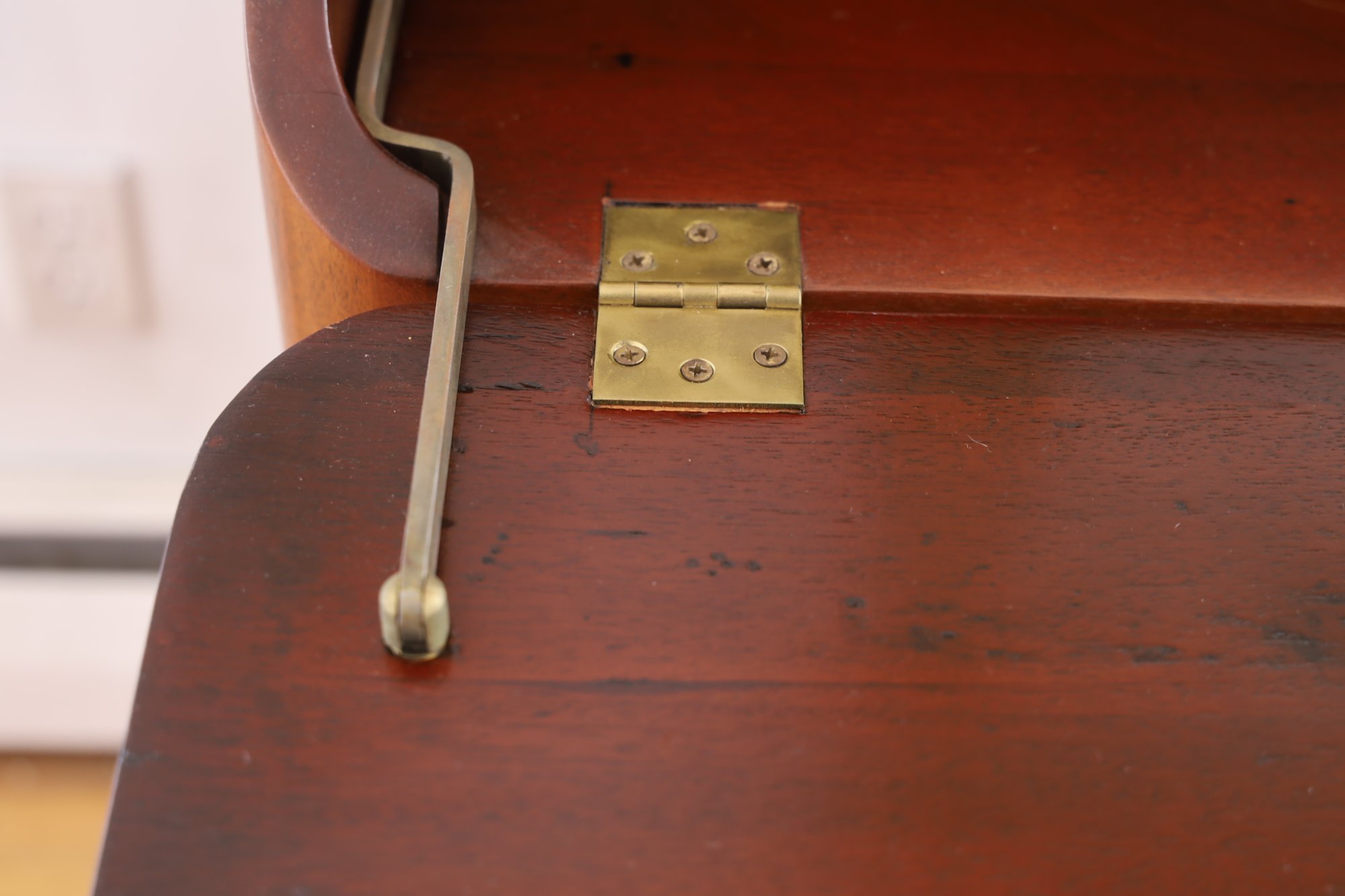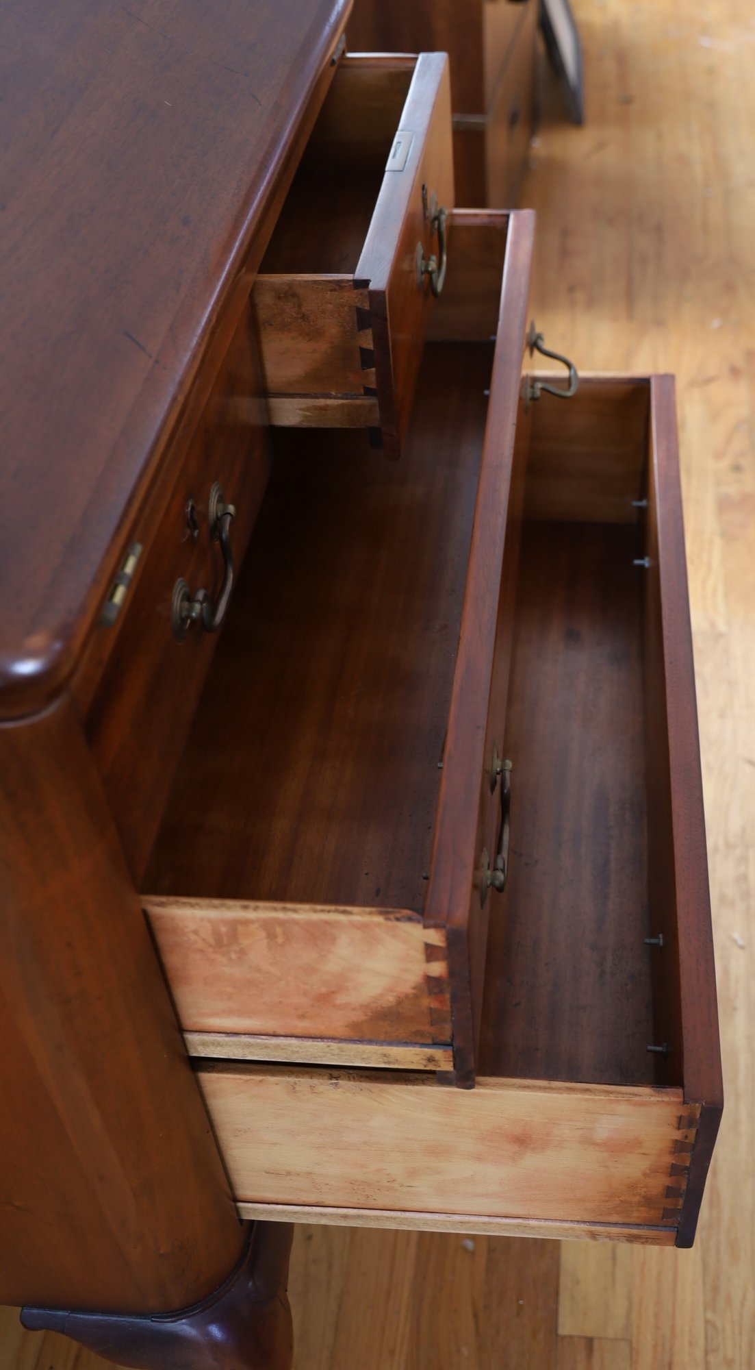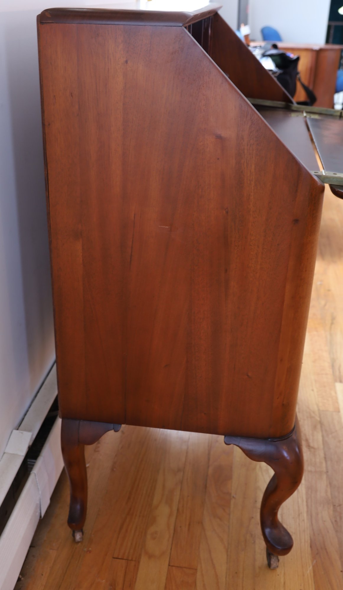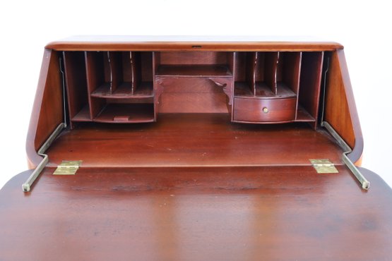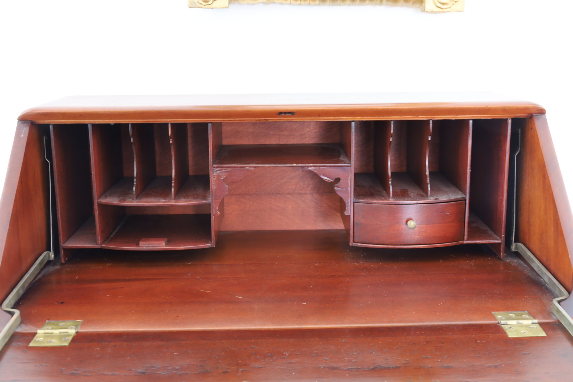 The item is in good condition but is missing an interior drawer and the keys. It has four lower drawers, each with brass handles, and showcases high-quality construction. Dimensions: 30"W x 17.25"D x 39.75"H.