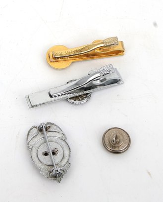 1 Melville, New York tie clip and pin, 1 State of New York Commissioner tie clip, and one fire department button.