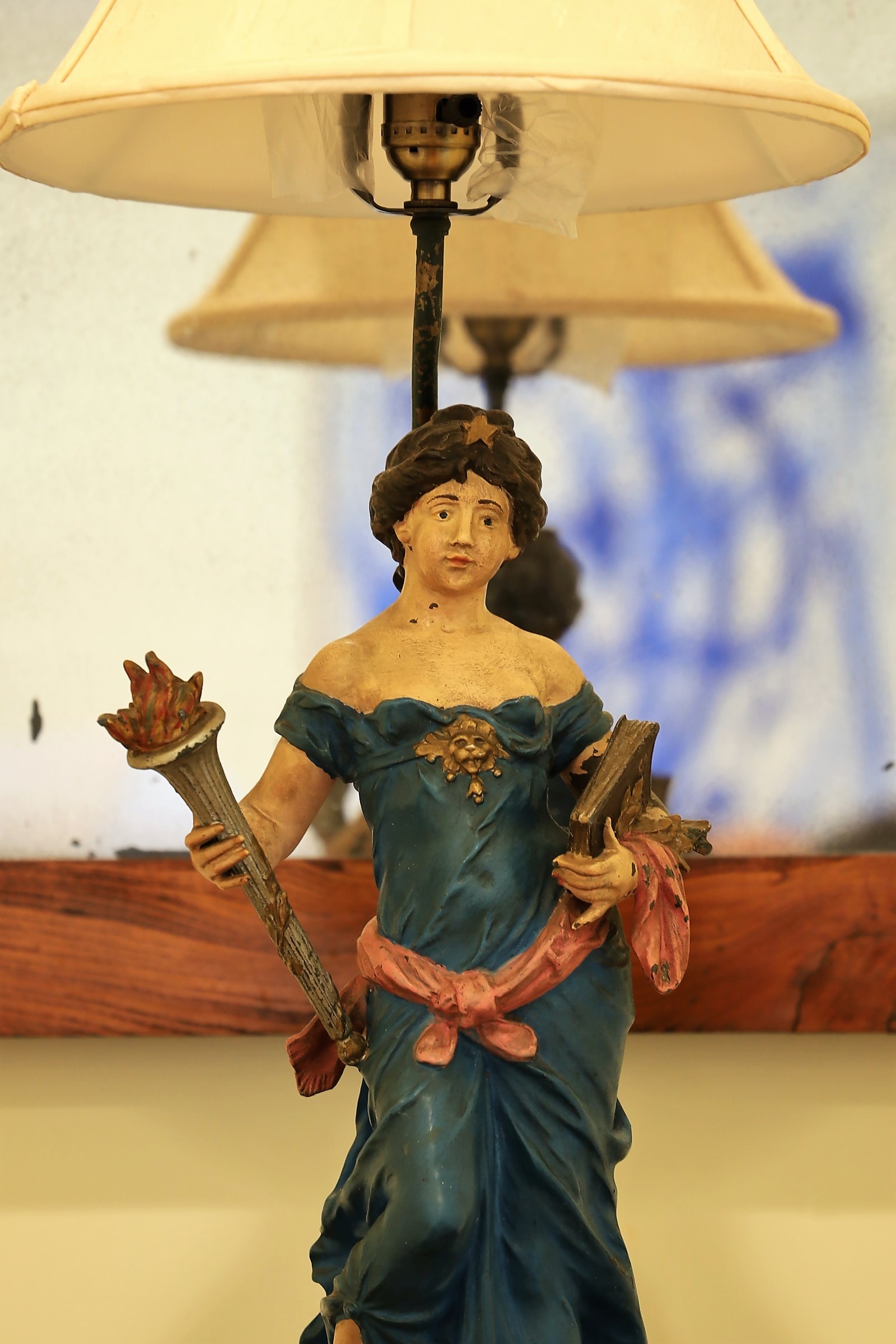 Metal lamp & shade with hand painting features a lady holding a torch & book. This great piece is titled "Science". Lamp is working. Some peeling.